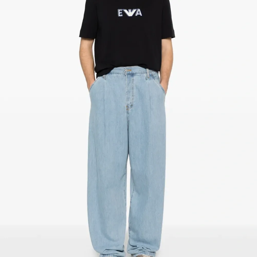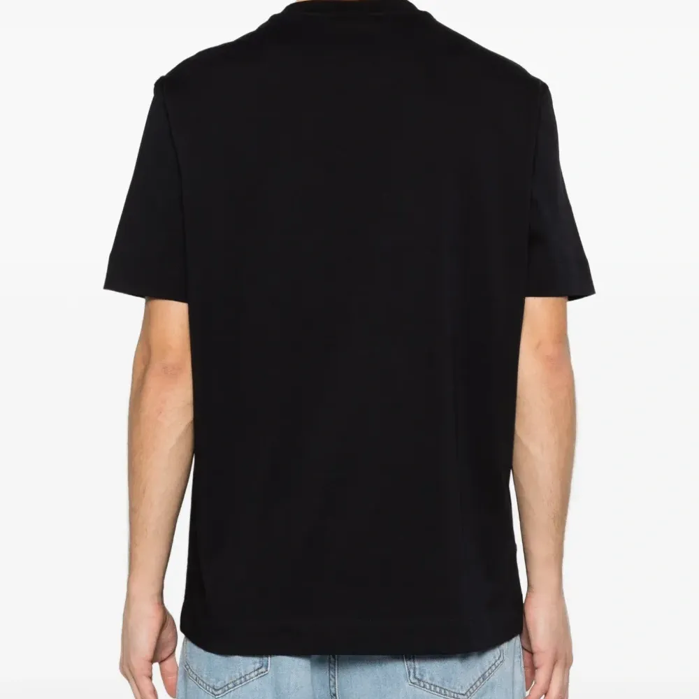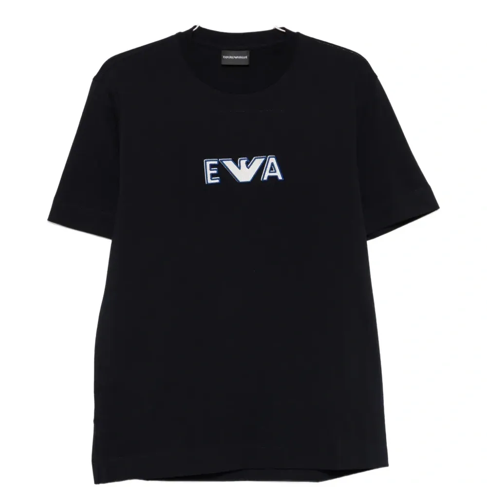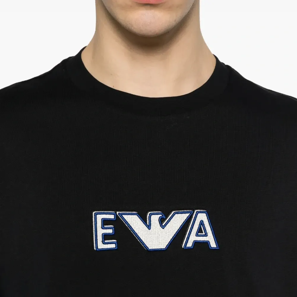 темно-синяя футболка с вышитым логотипом, круглым вырезом и короткими рукавами