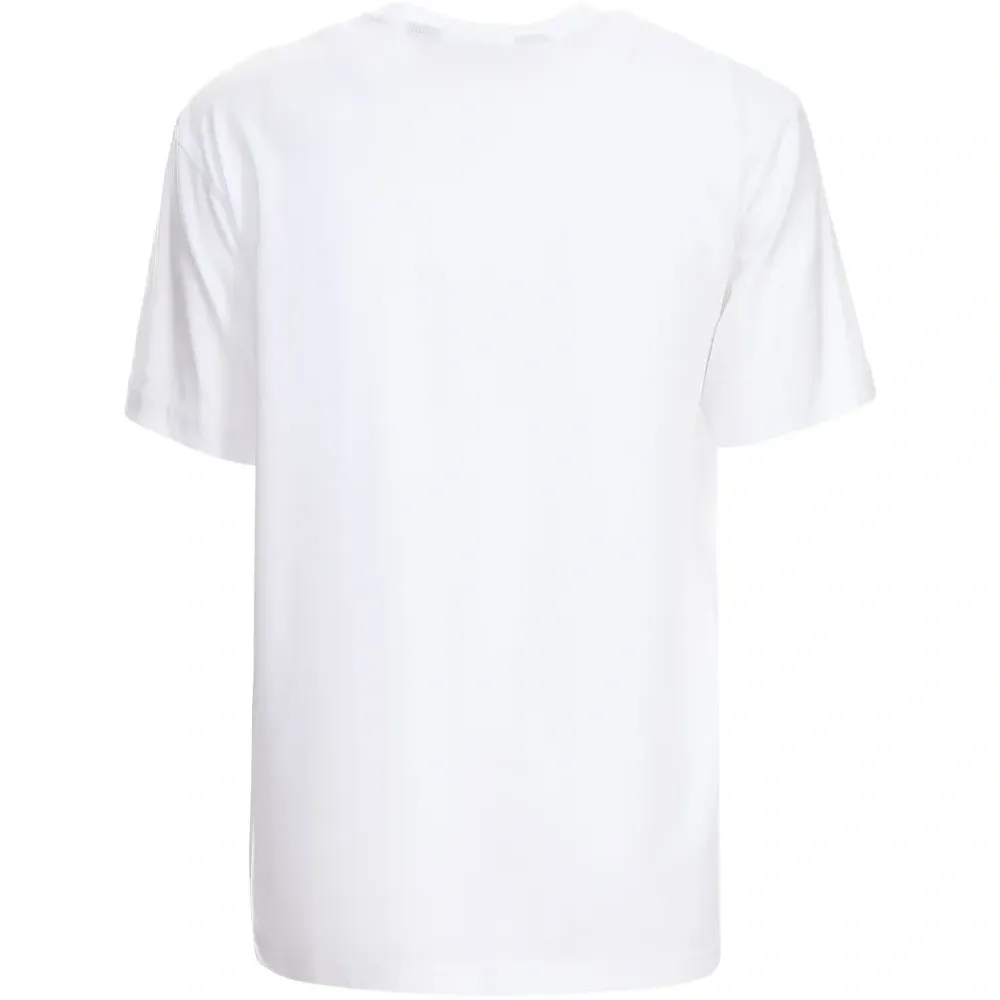 белая футболка с круглым вырезом, короткими рукавами и нашивкой с логотипом
