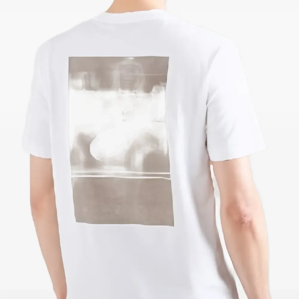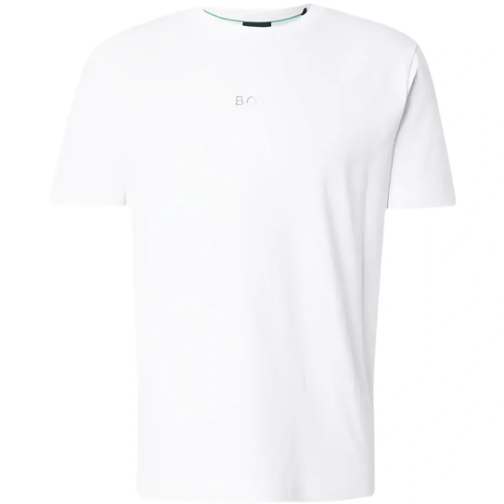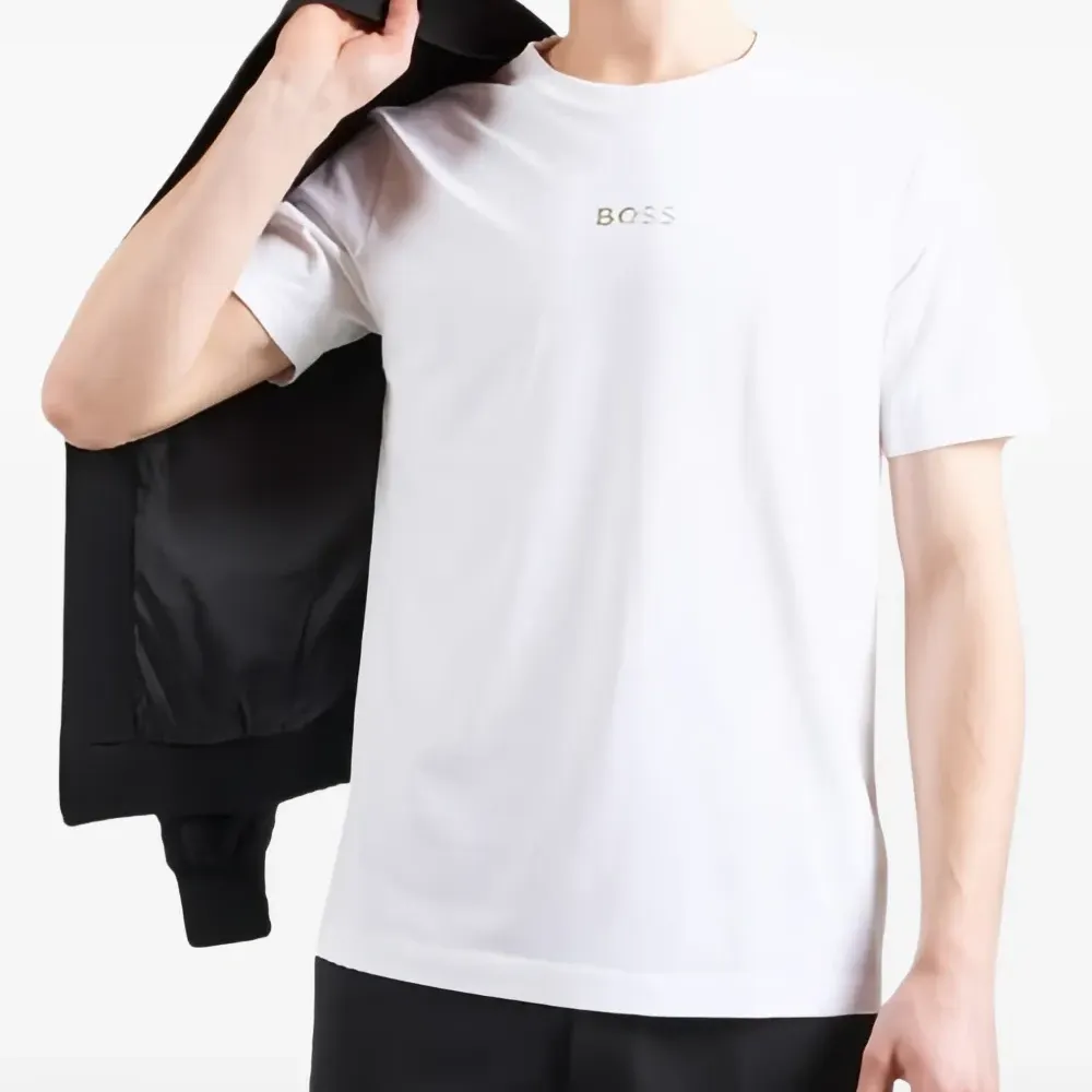 белая футболка с круглым вырезом, короткими рукавами и логотипом