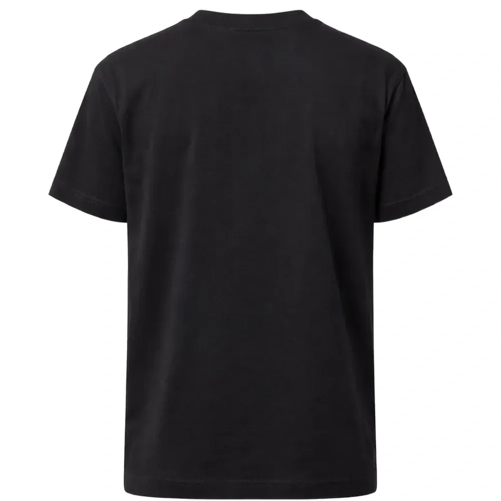 черная хлопковая футболка с логотипом, круглым вырезом, короткими рукавами и прямым подолом