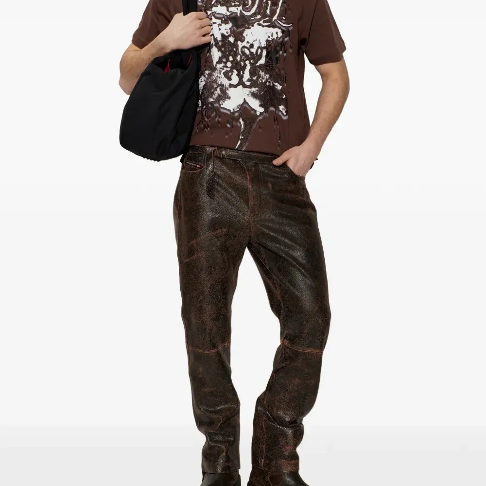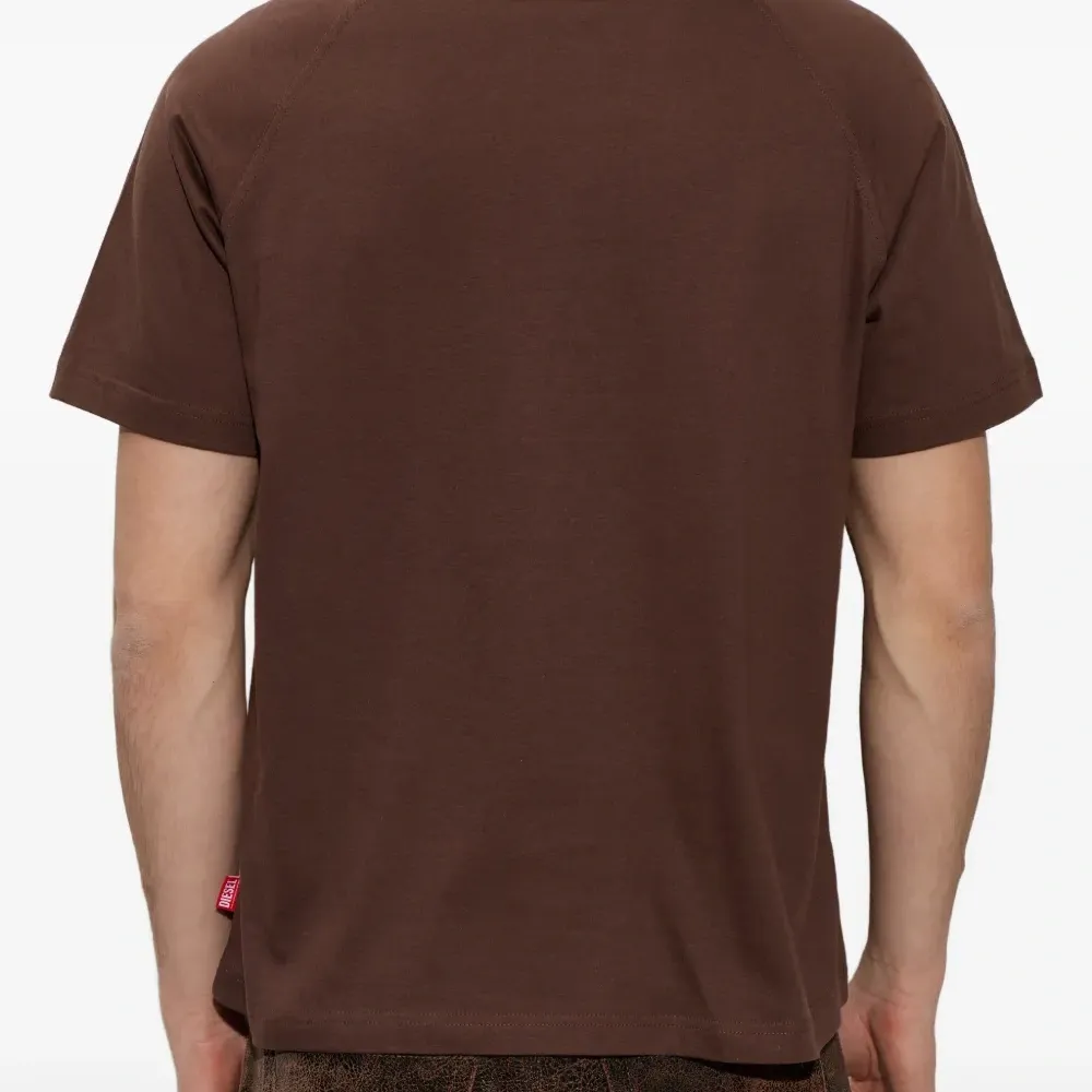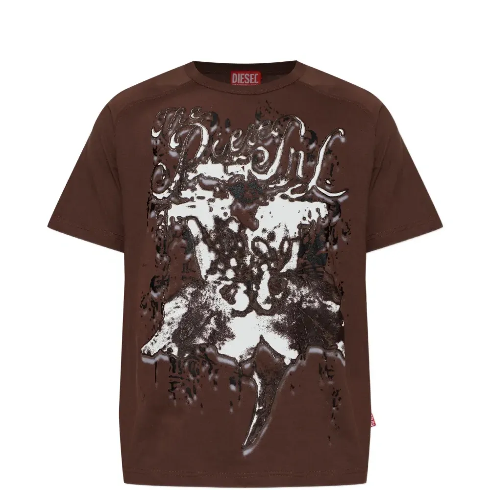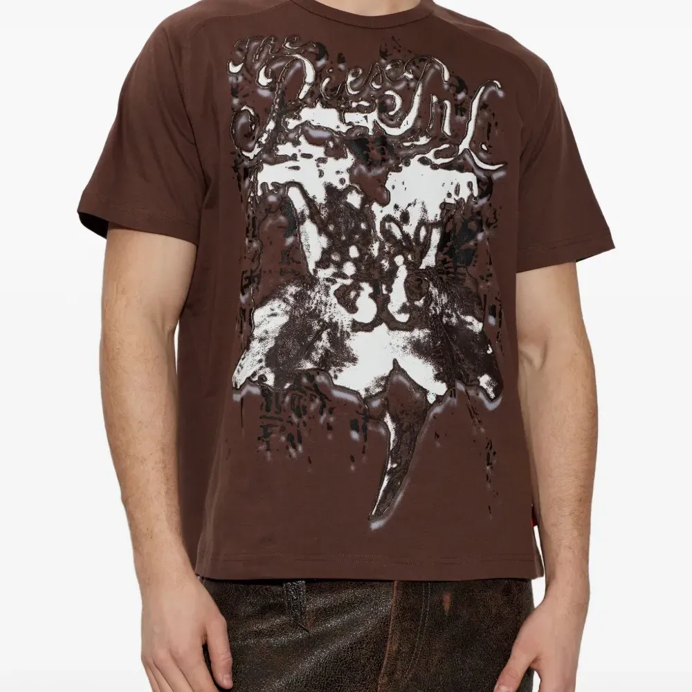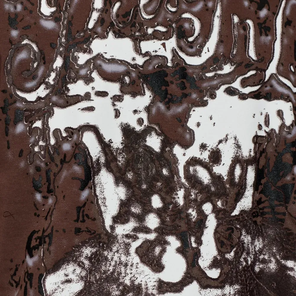 коричневая футболка с графическим принтом, круглым вырезом и короткими рукавами