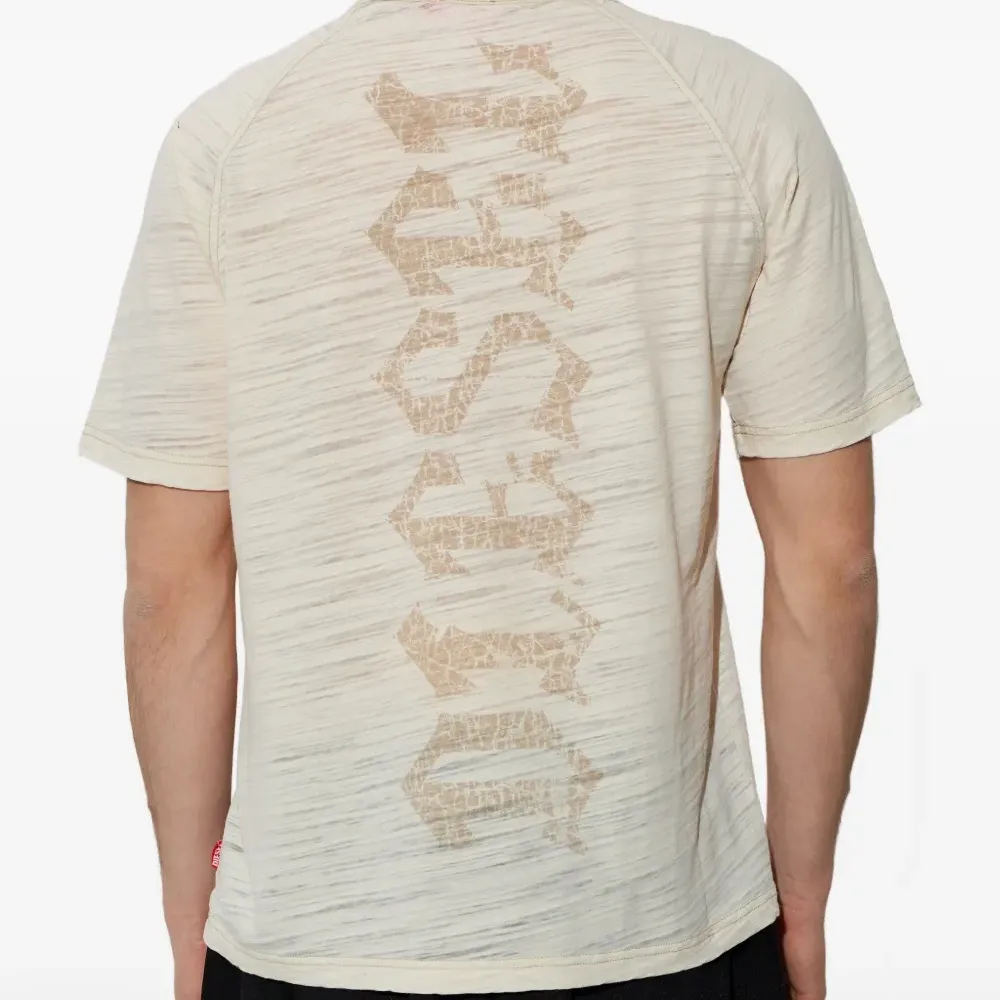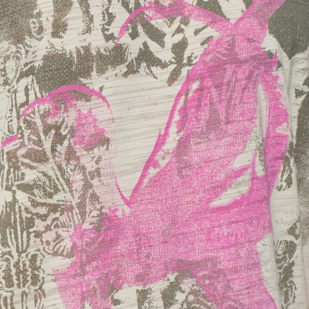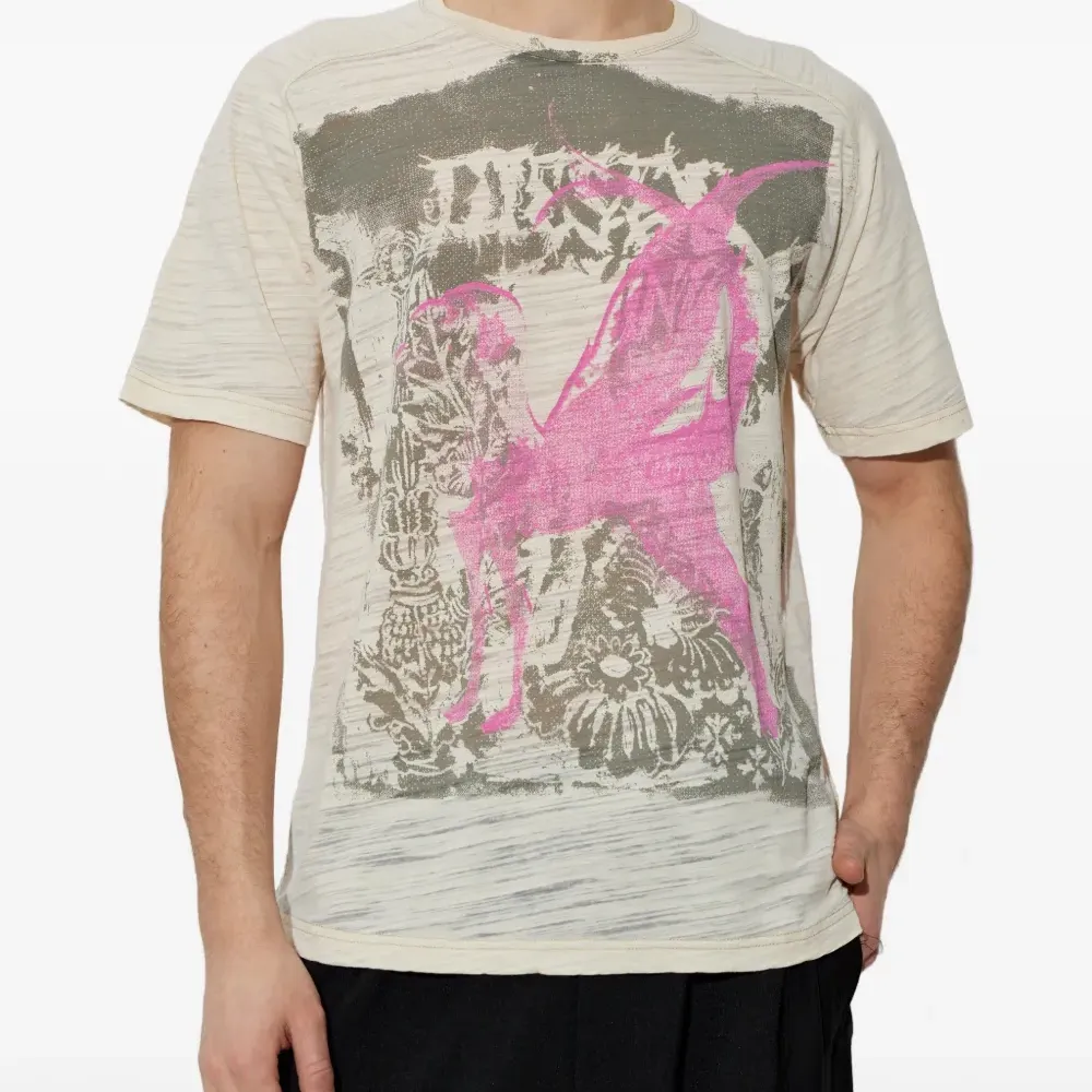 бежевый топ с графическим принтом, круглым вырезом и короткими рукавами