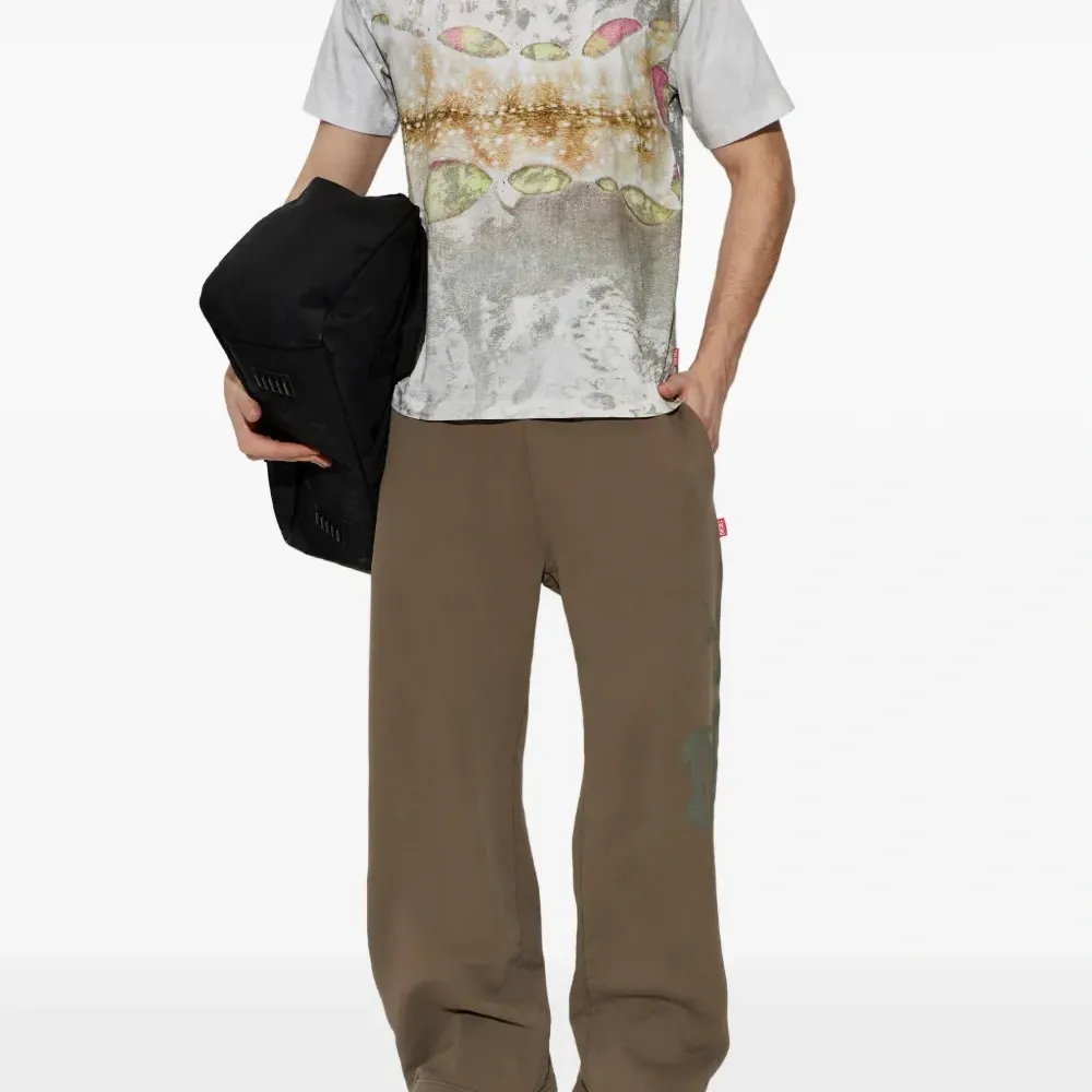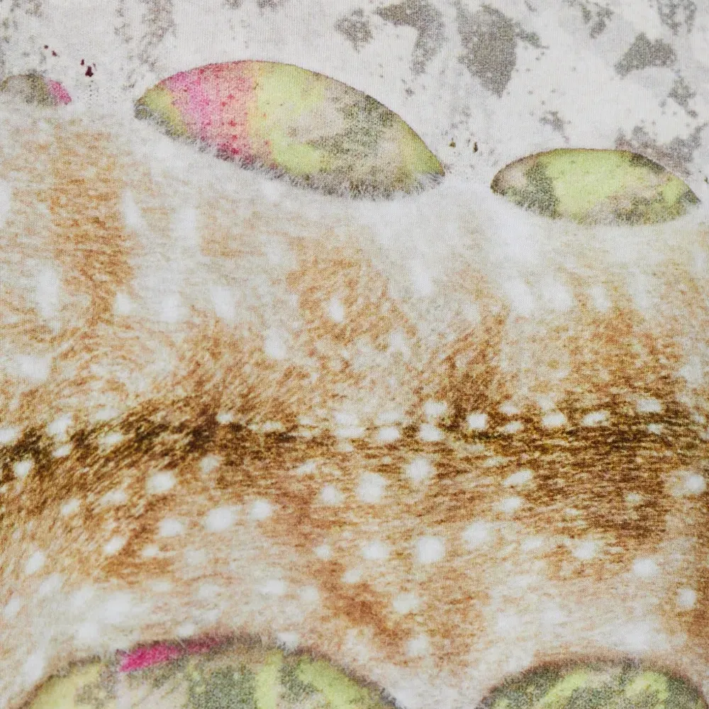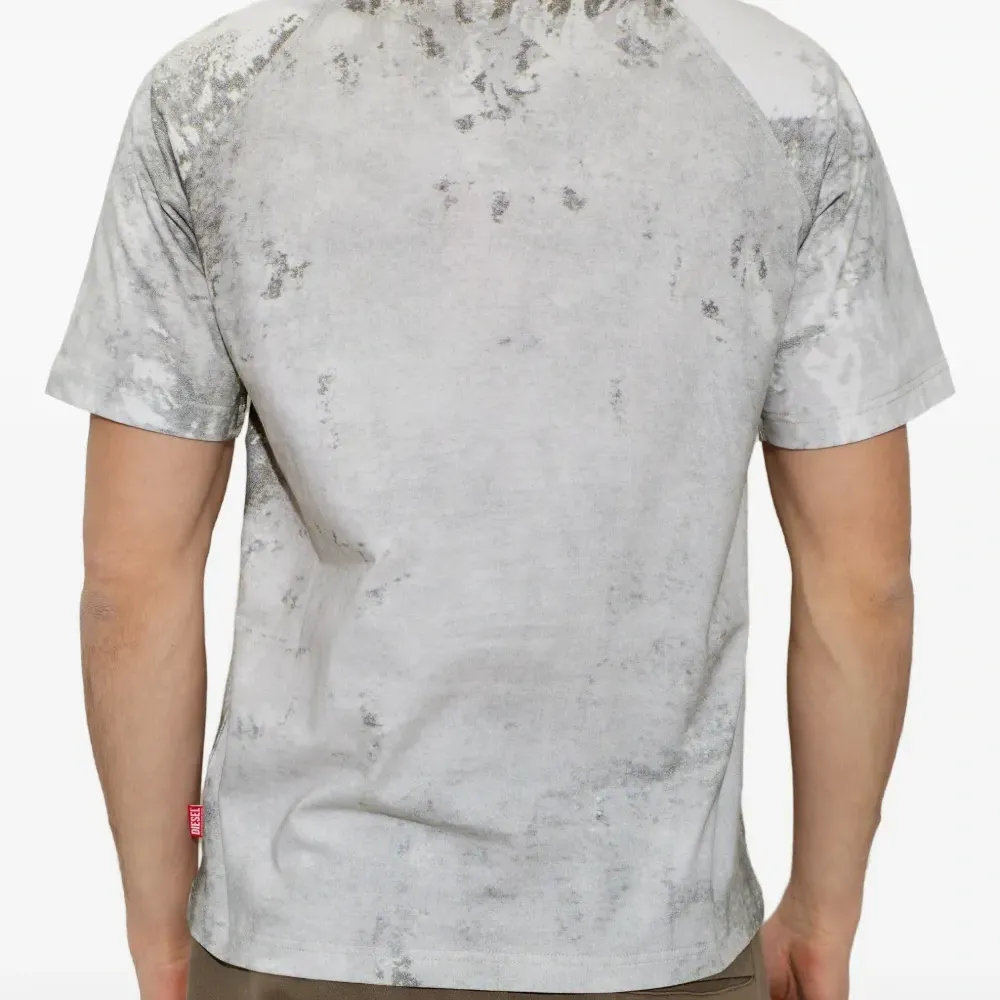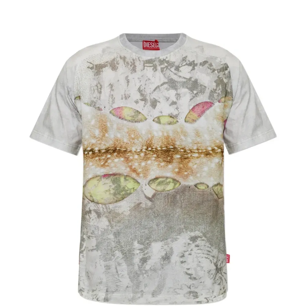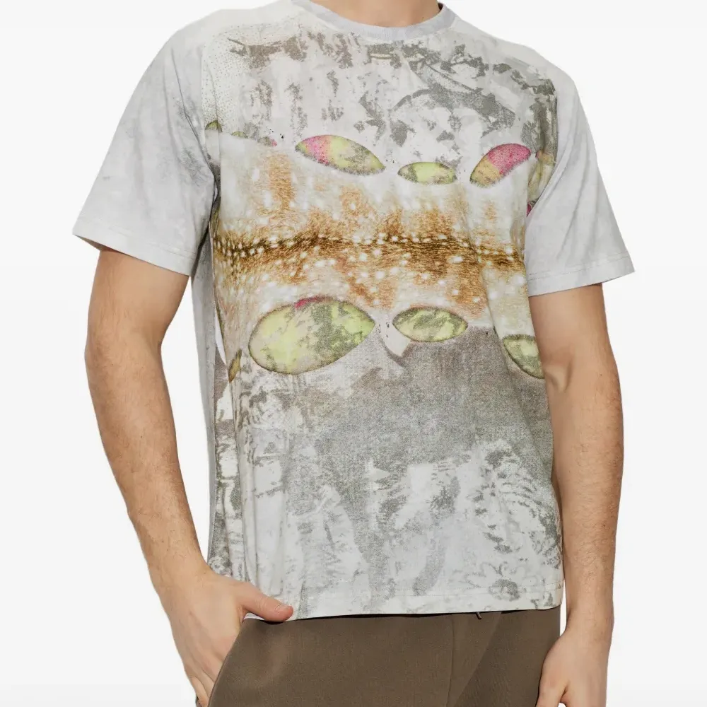 светло-серая и многоцветная хлопковая футболка с принтом, короткими рукавами и круглым вырезом