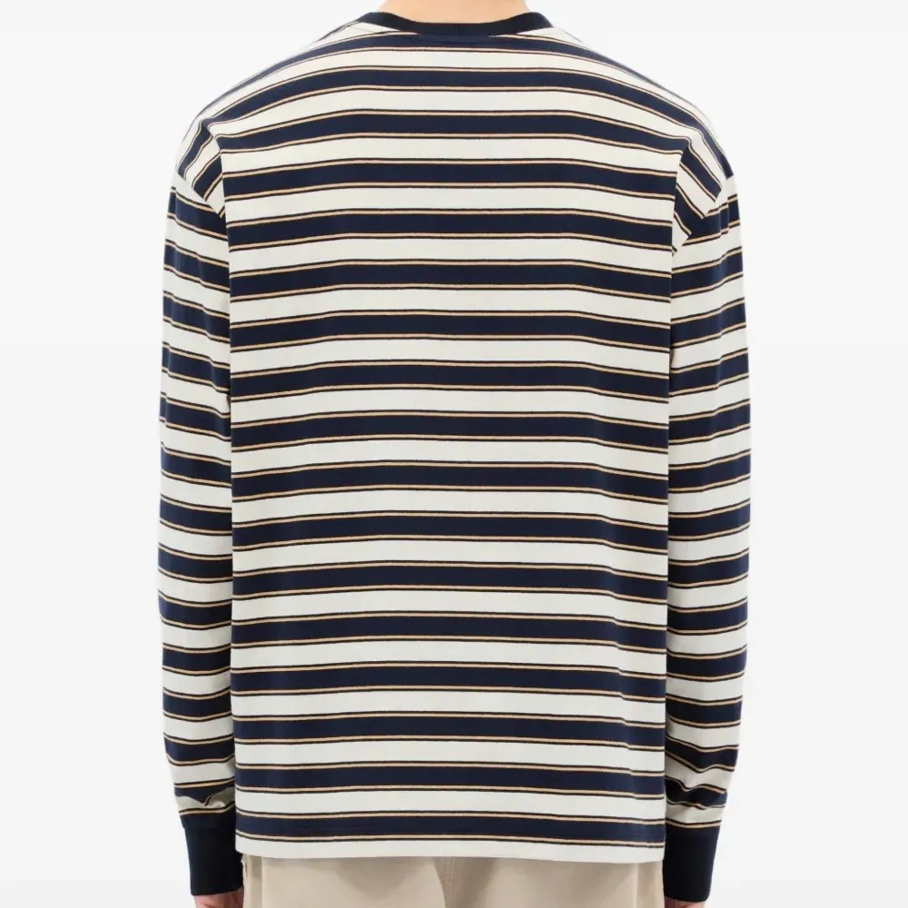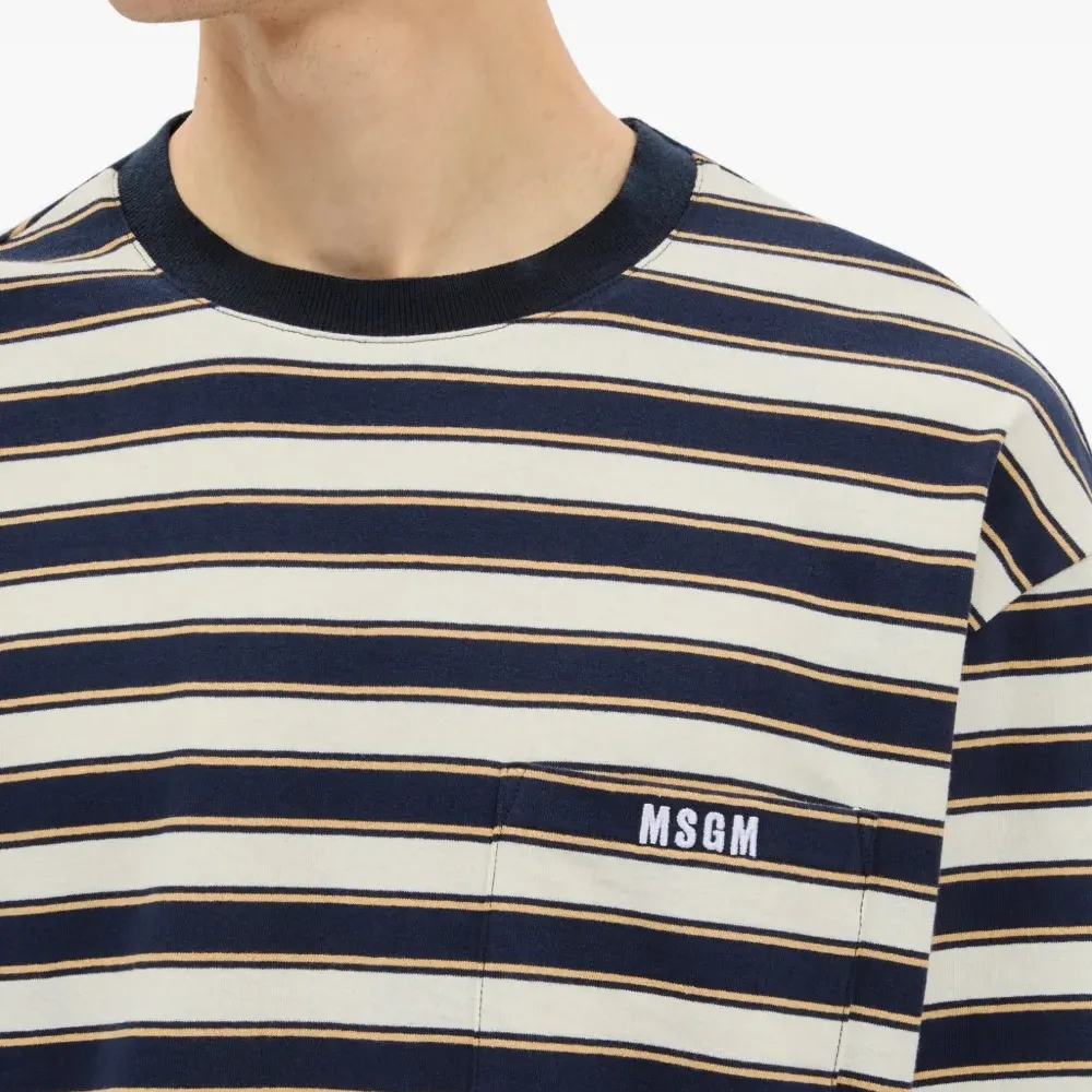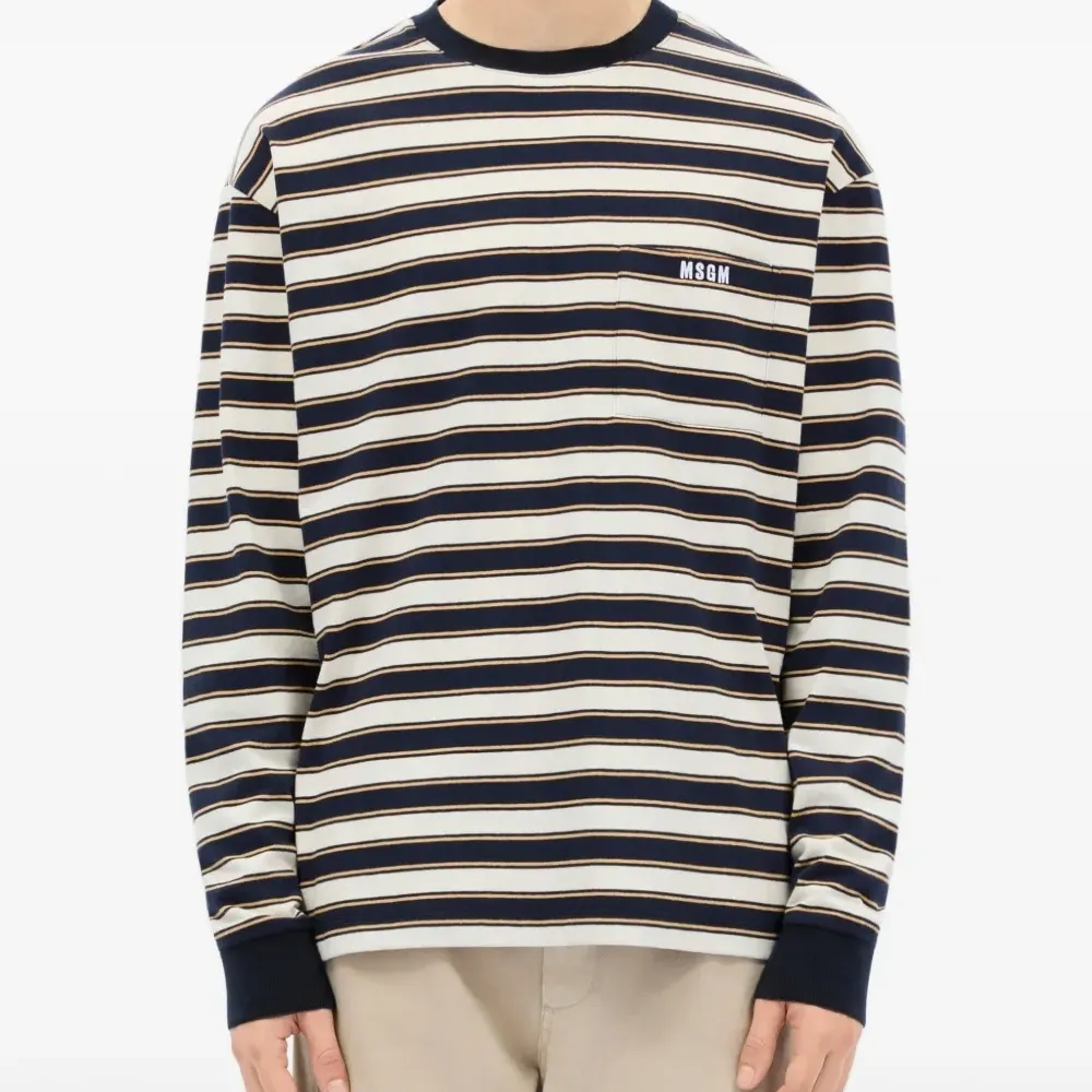 белая футболка в полоску с нагрудным карманом, круглым вырезом, длинными рукавами и ребристыми краями