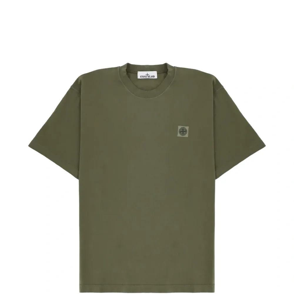 зелёная футболка с нашивкой-логотипом, круглый вырез, короткие рукава