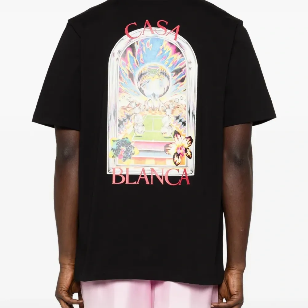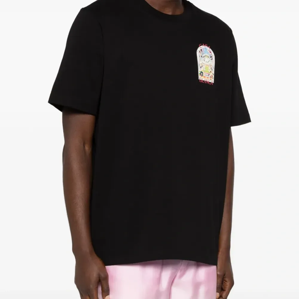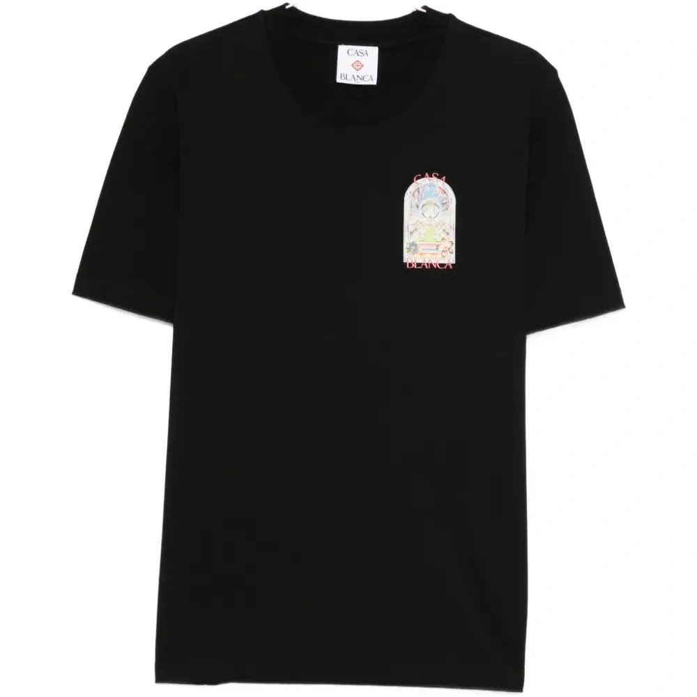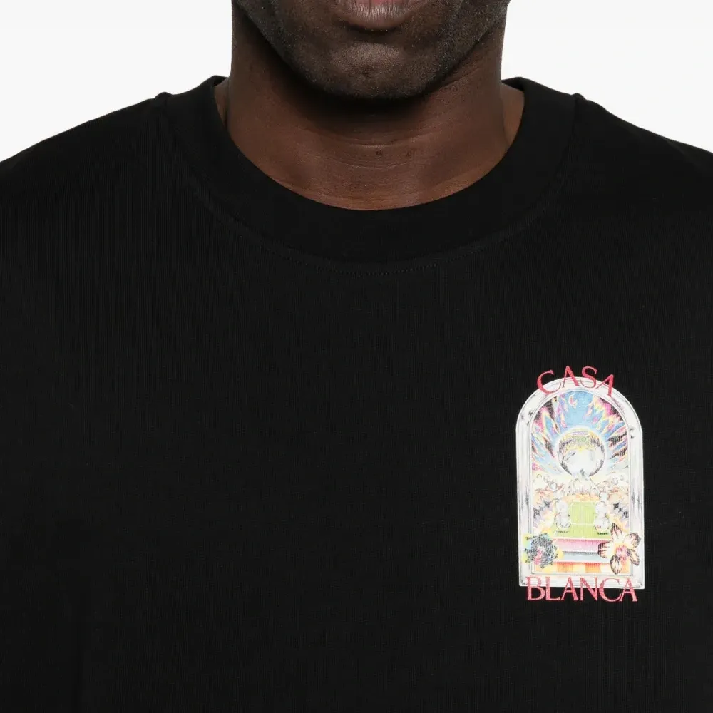 черная футболка с графичным принтом, круглым вырезом и короткими рукавами