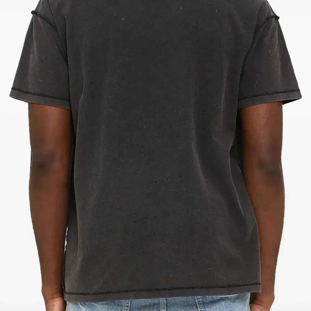 темно-серый цвет, эффект состаренности, вывернутые наружу швы, короткие рукава, графичный принт
