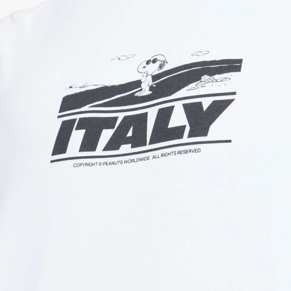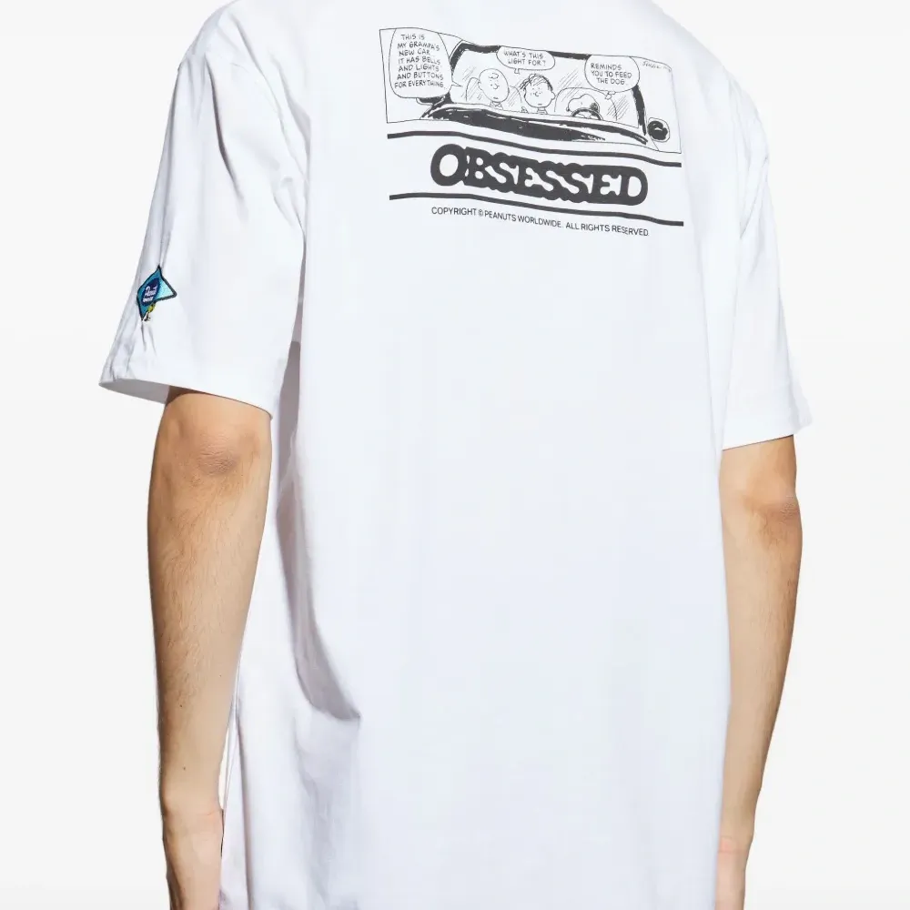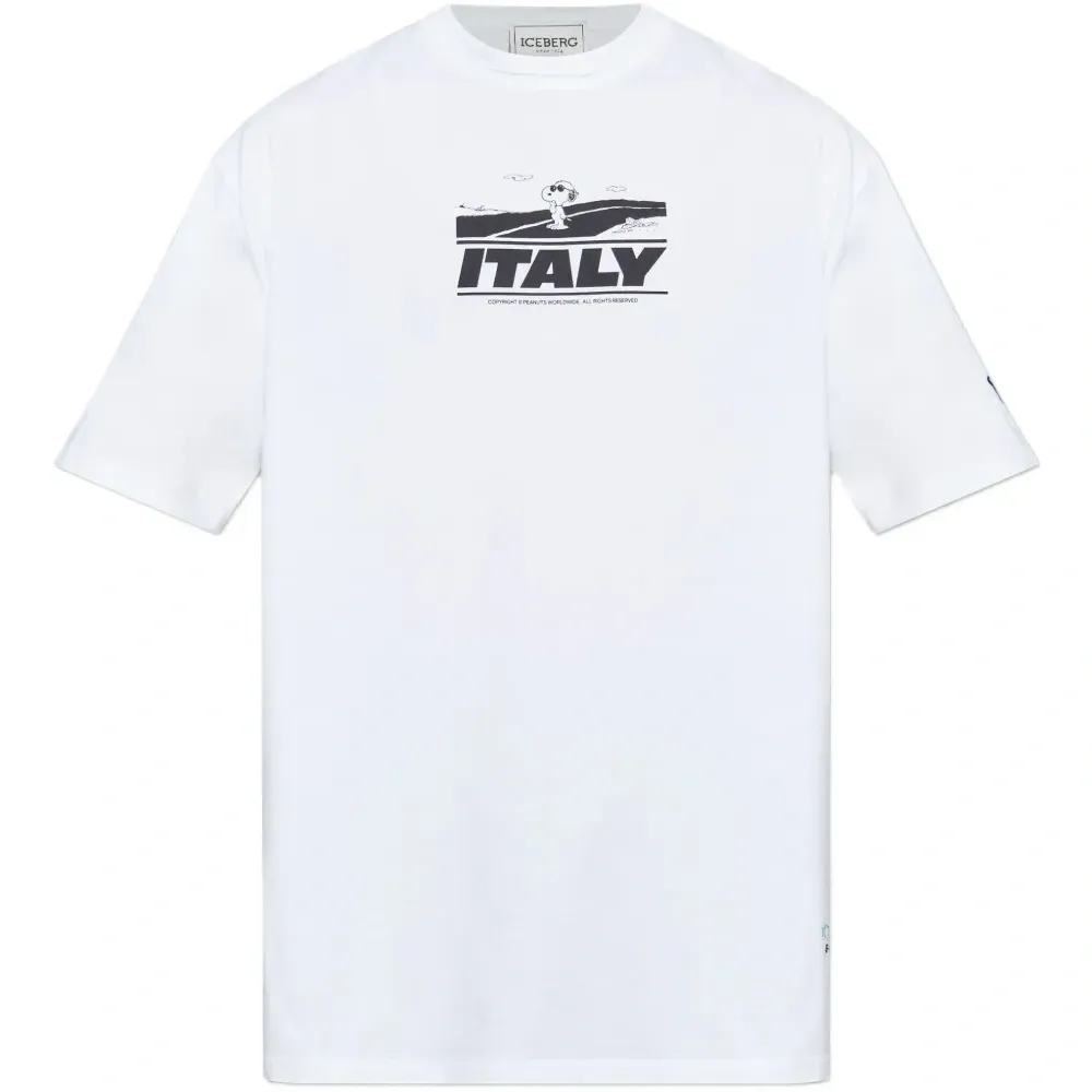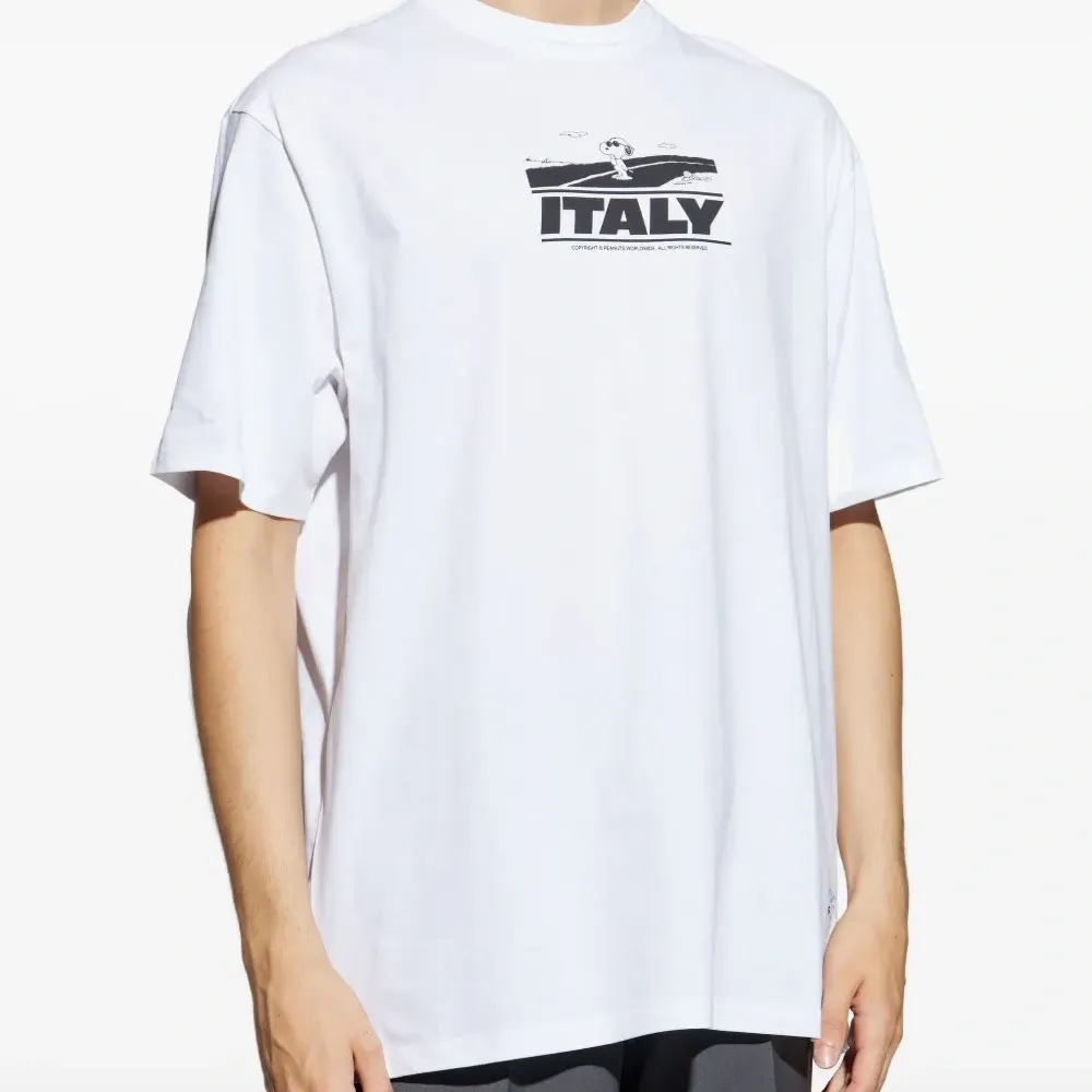 белая футболка с графическим принтом, круглым вырезом и короткими рукавами