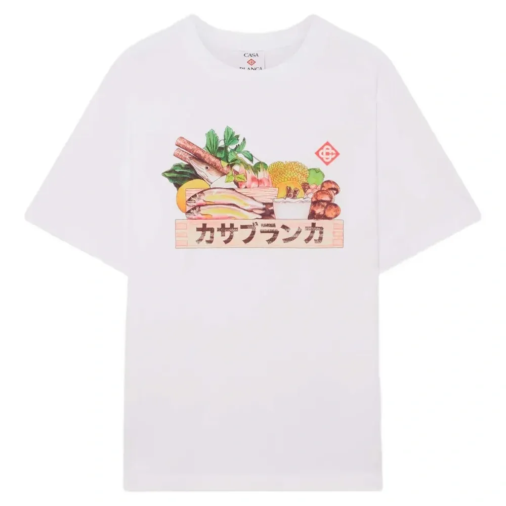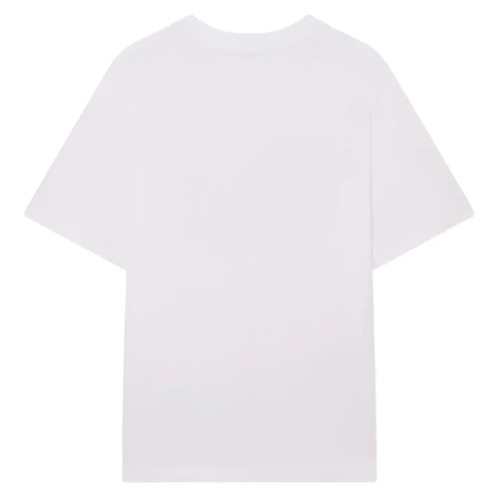 белая футболка с графическим принтом, круглый вырез, рубчатый воротник, прямые манжеты, вышитый логотип