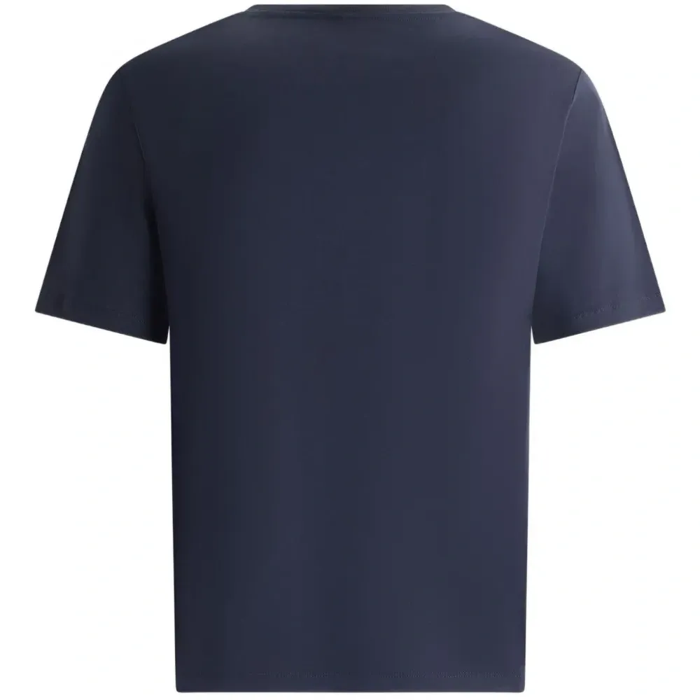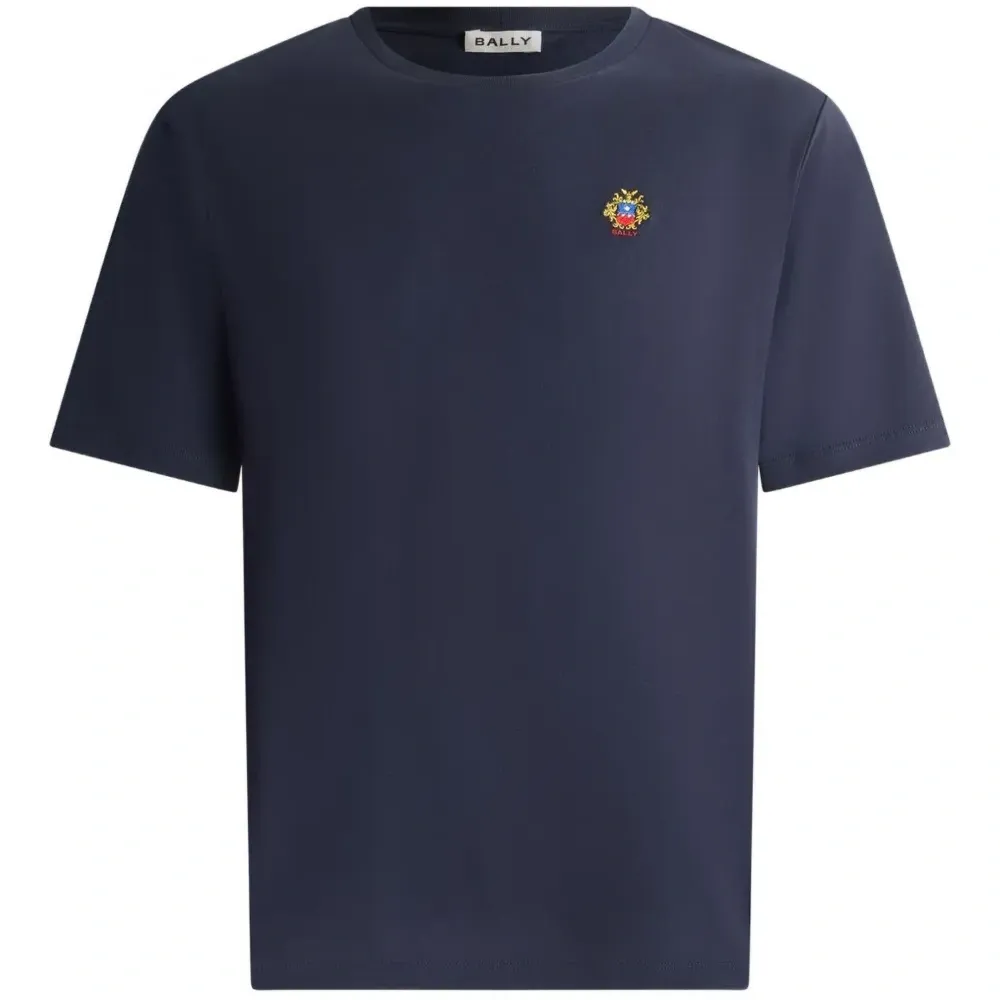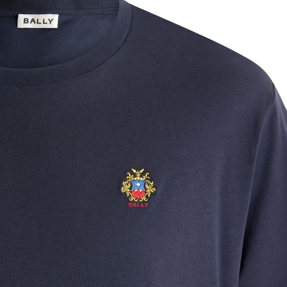 темно-синяя футболка с вышитым гербом, круглым вырезом и короткими рукавами