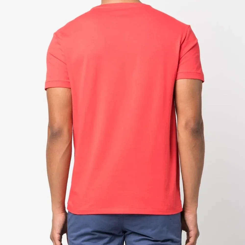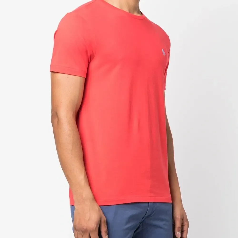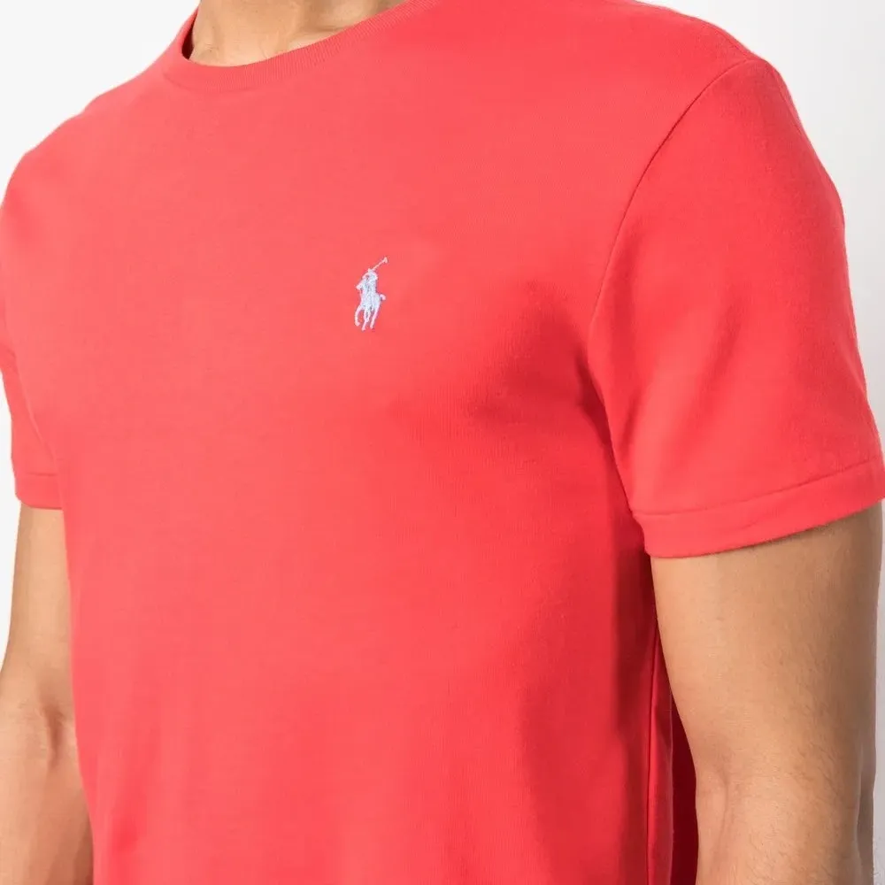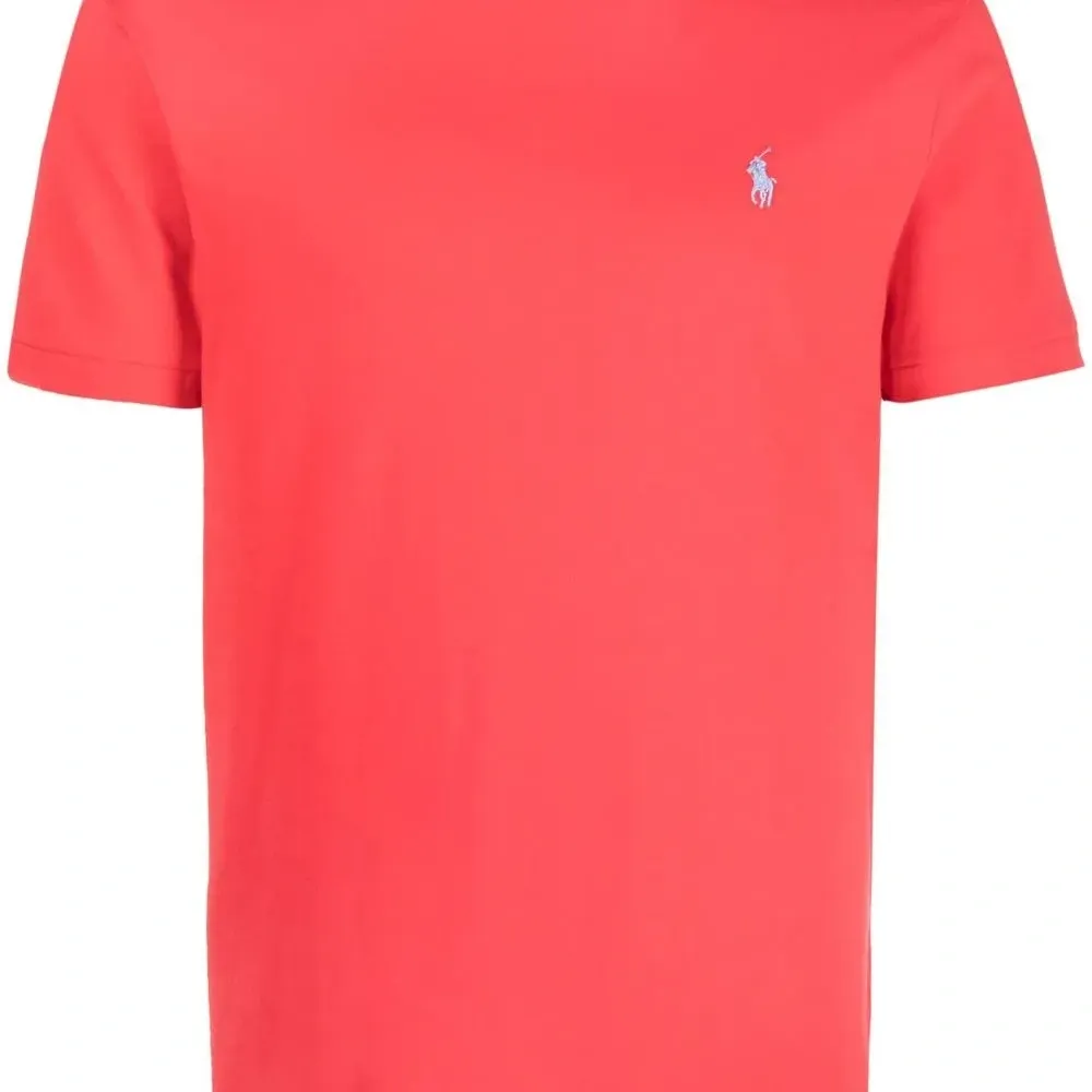 Ярко-красный, логотип спереди, круглый вырез, короткие рукава и прямой подол.