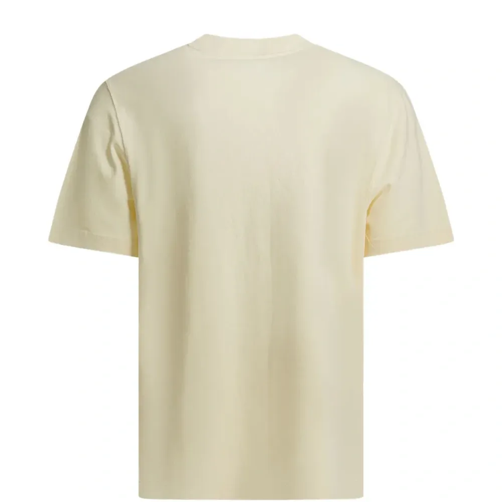 бежевый топ с круглым вырезом, короткими рукавами, логотипом-нашивкой и тональной отстрочкой