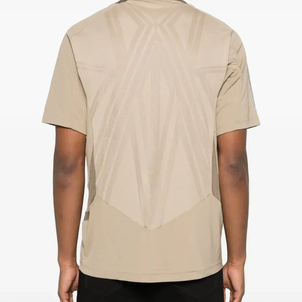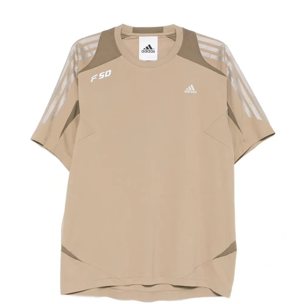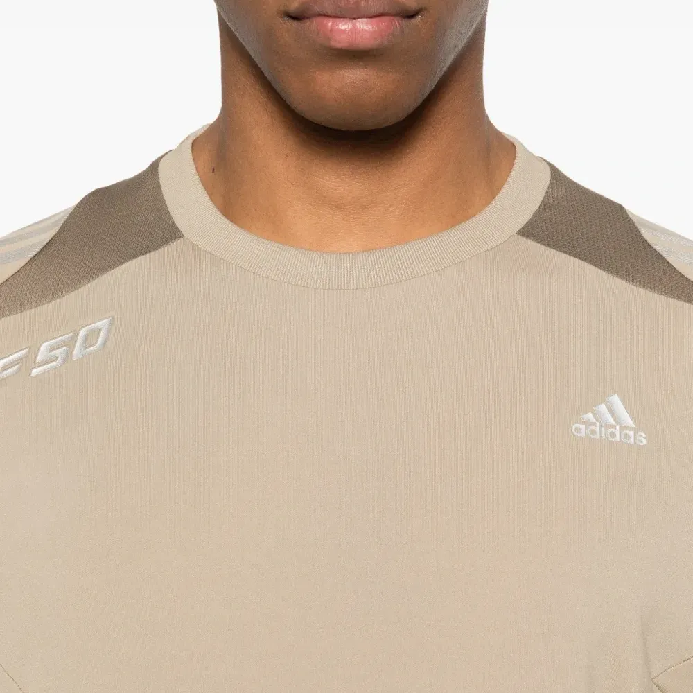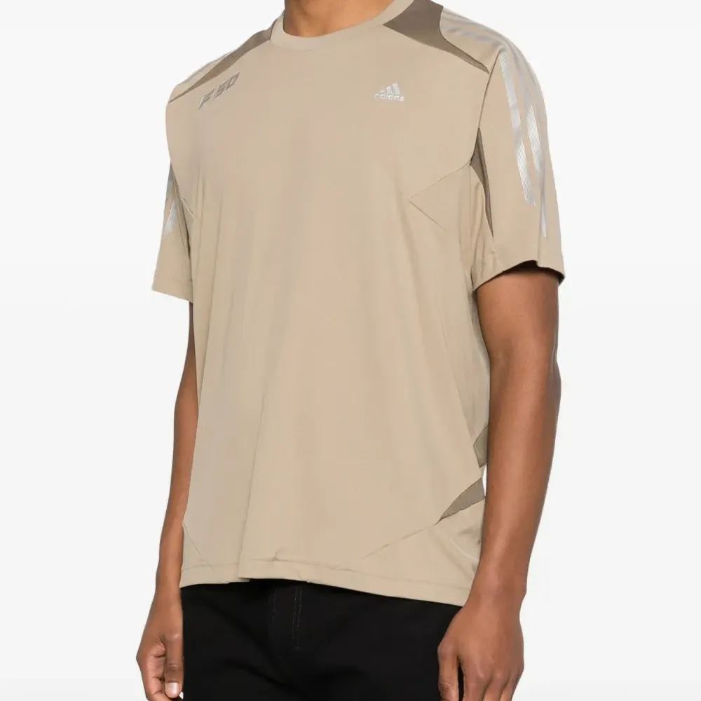 бежевый цвет, круглый вырез, короткие рукава, полосы на плечах, принт с логотипом
