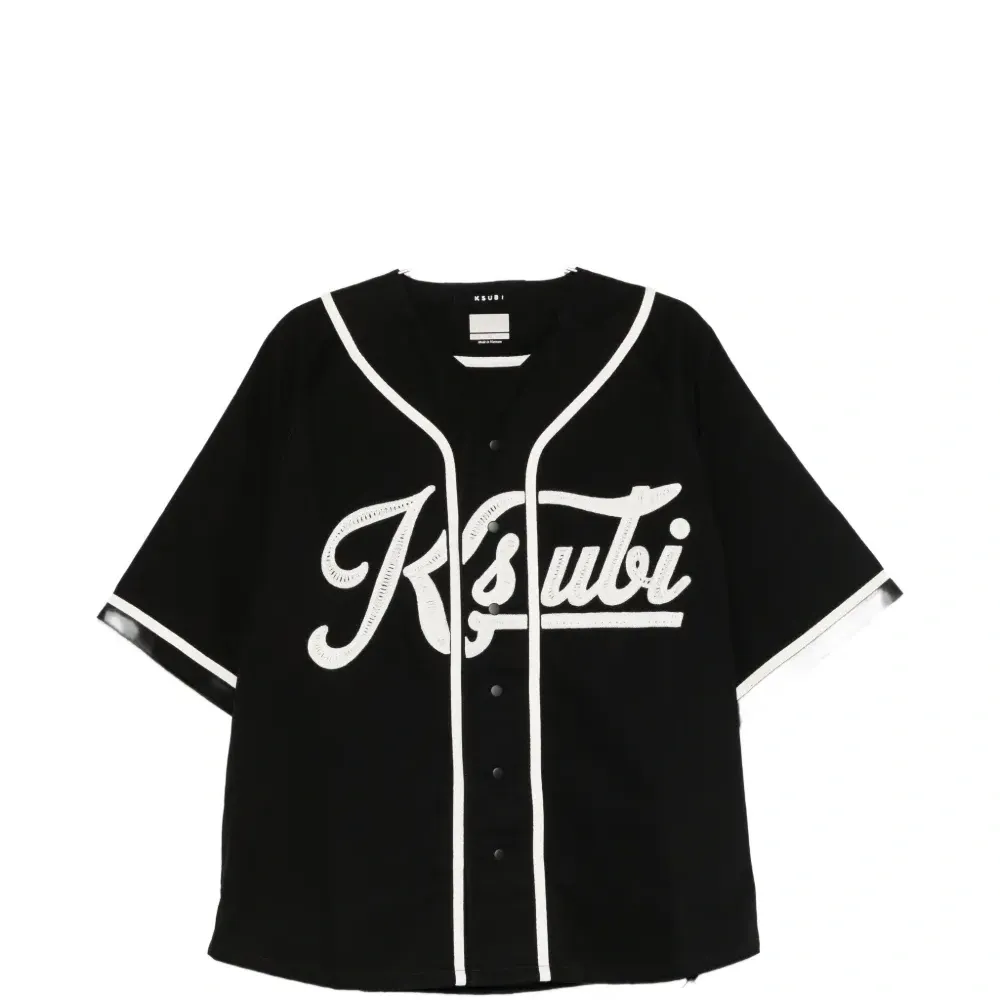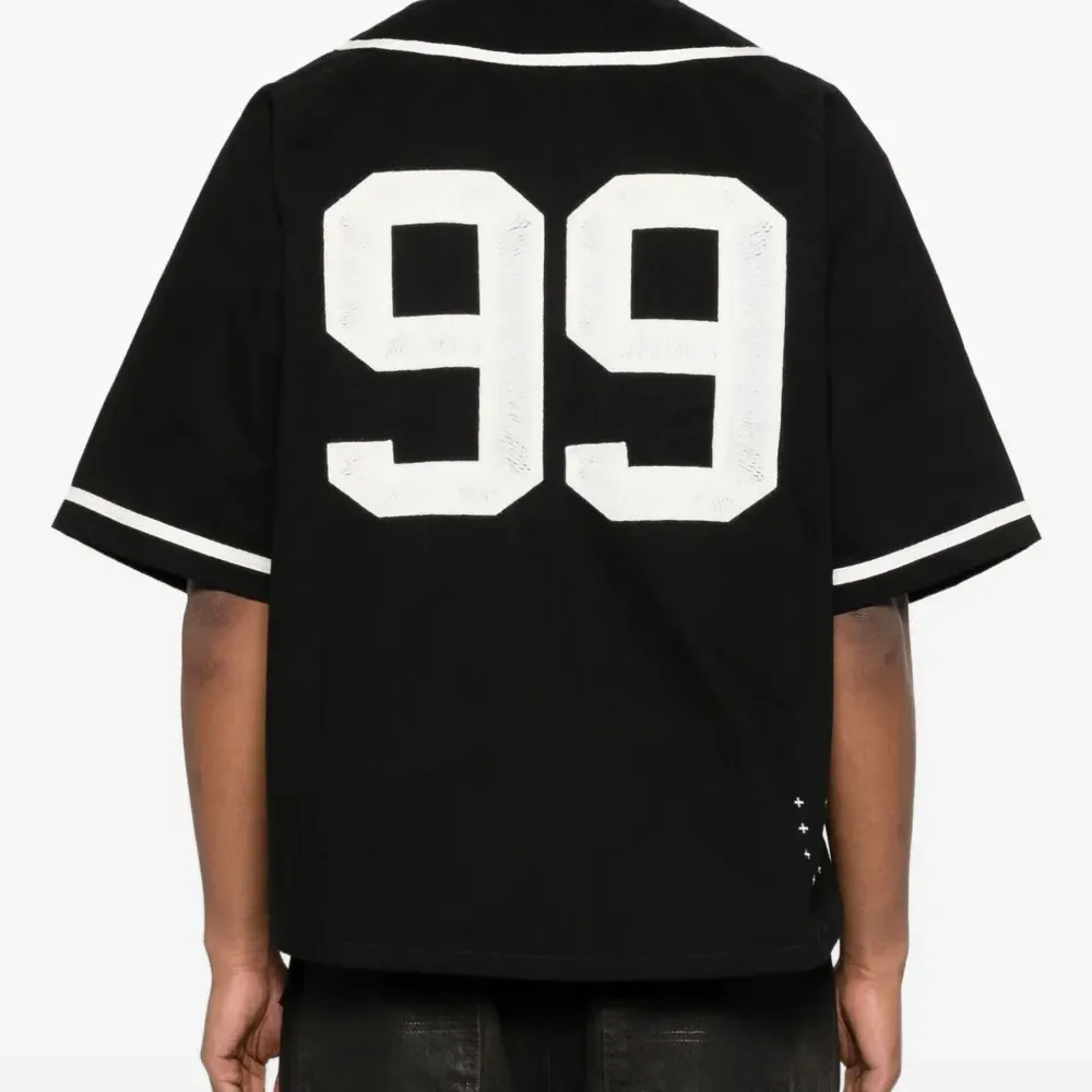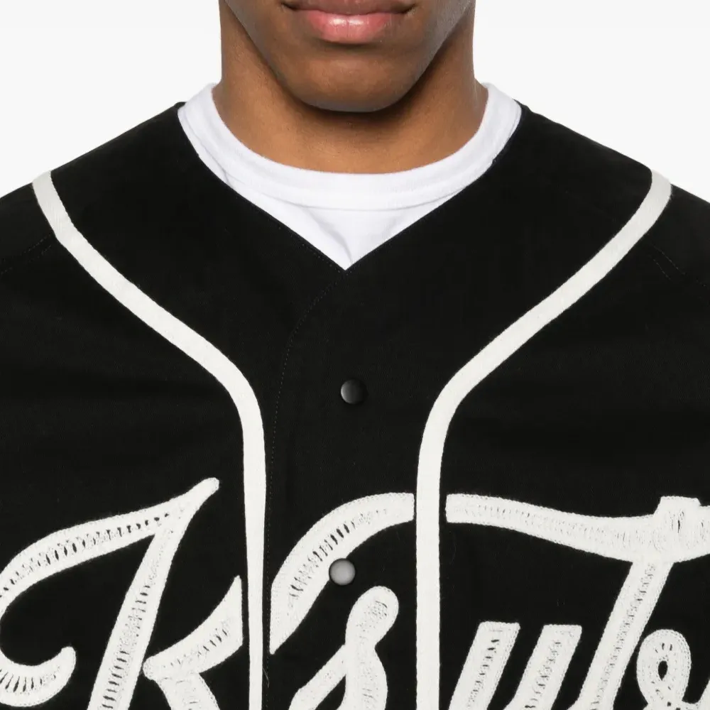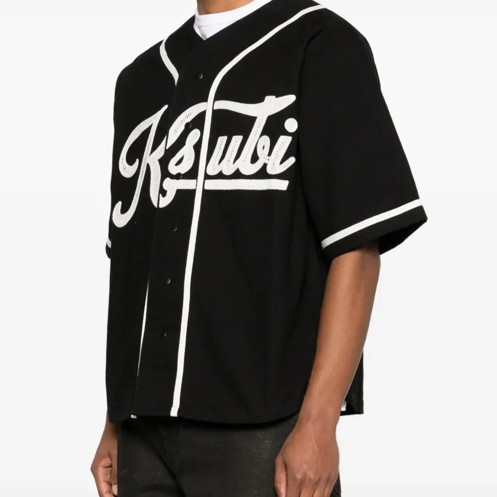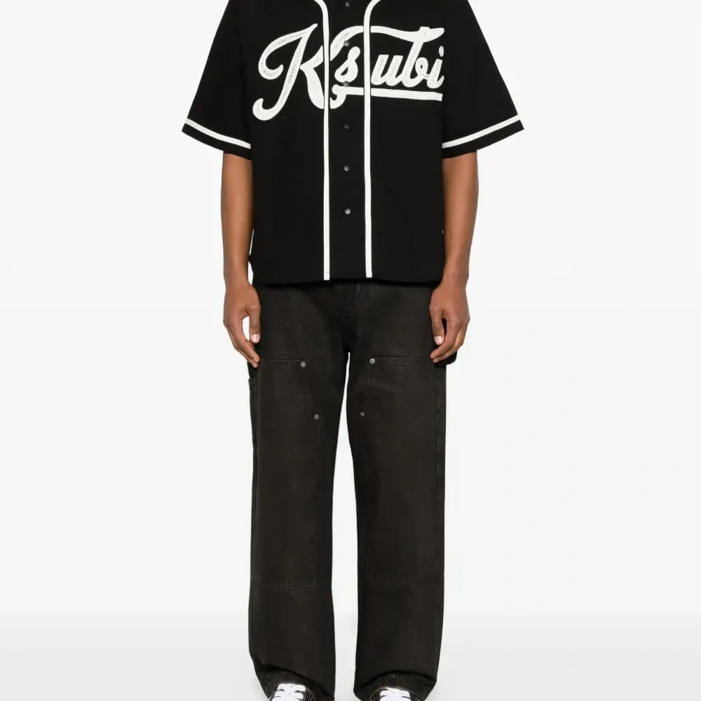 чёрная футболка с логотипом, застёжкой на пуговицы, короткими рукавами и круглым вырезом