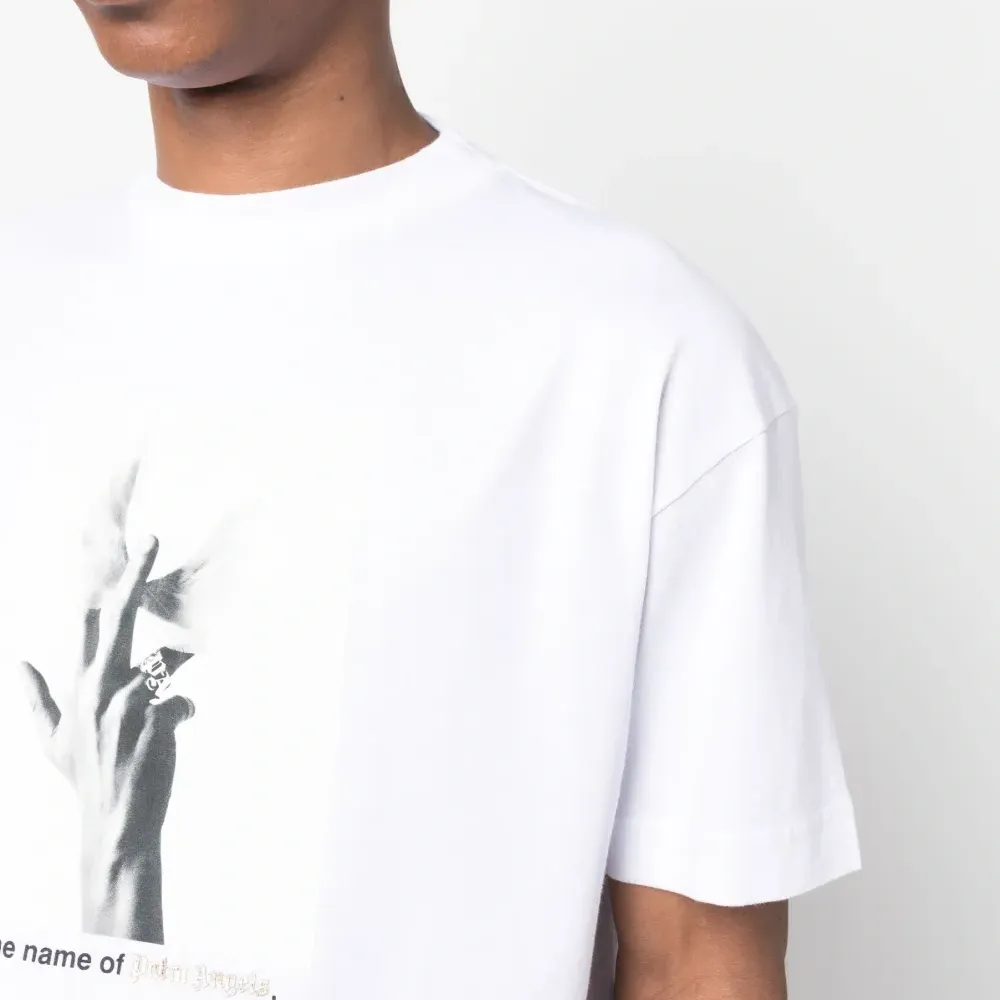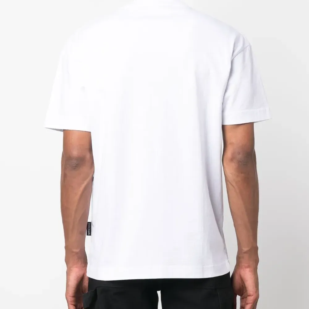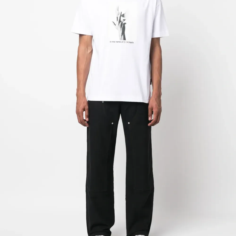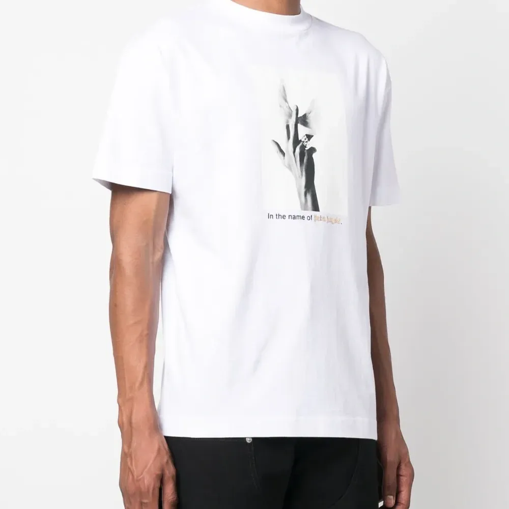 Белый, хлопок, графичный принт спереди, круглый вырез, короткие рукава, прямой подол и логотип спереди.