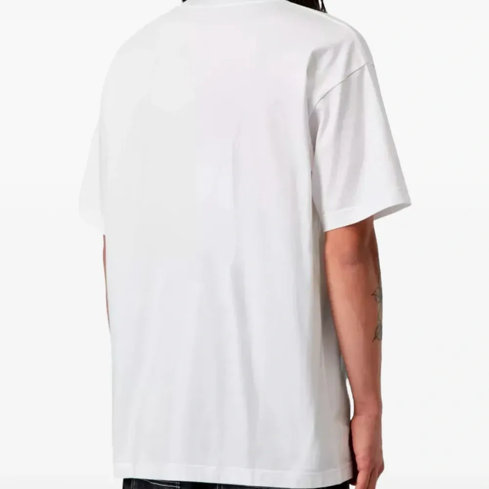 белая футболка с графическим принтом, круглым вырезом и короткими рукавами