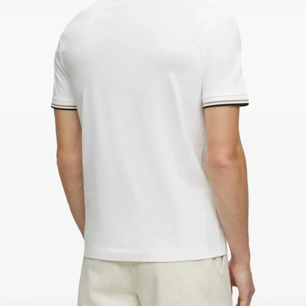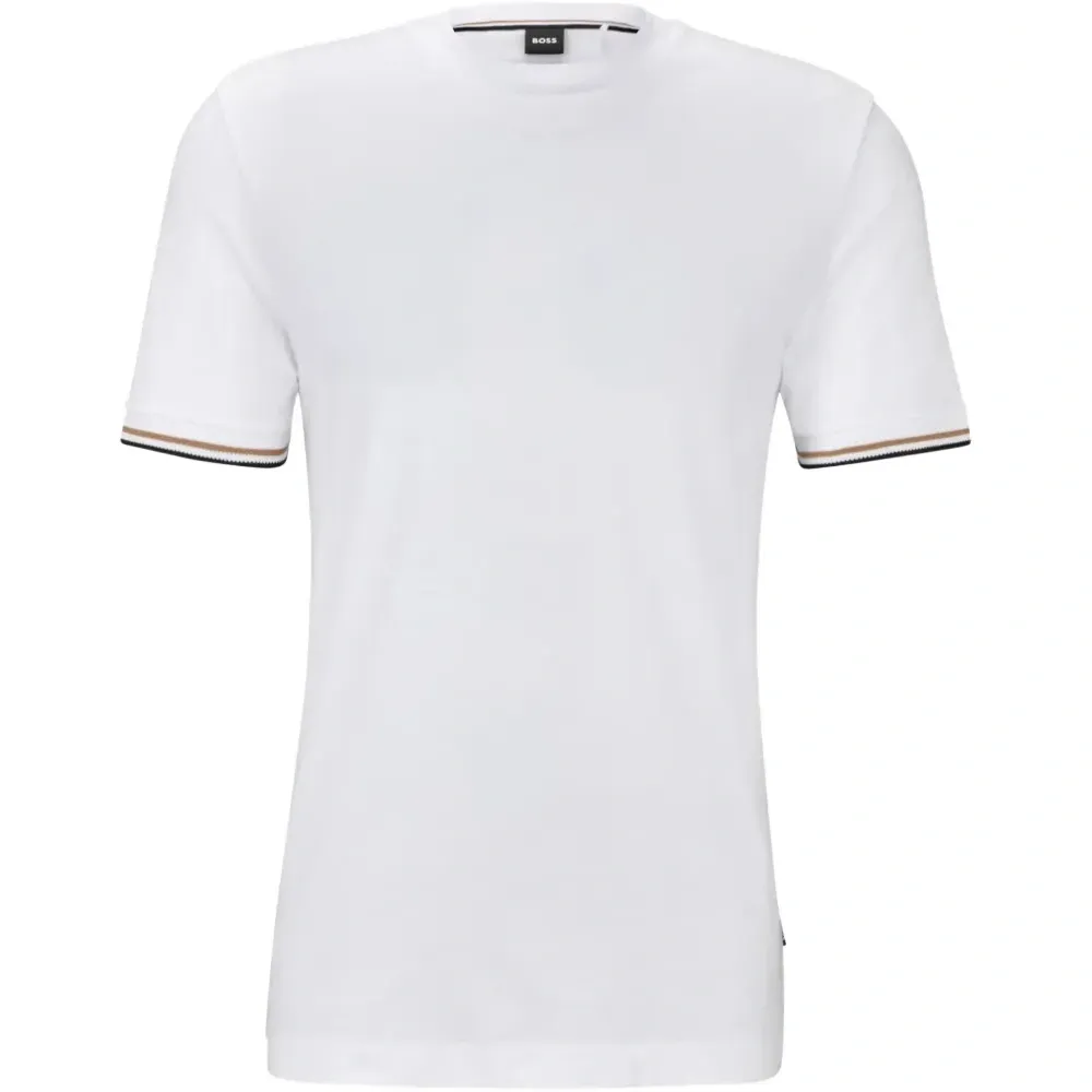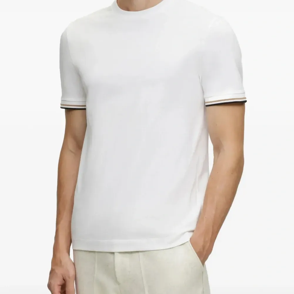 белая футболка с короткими рукавами и круглым вырезом, отделка на манжетах