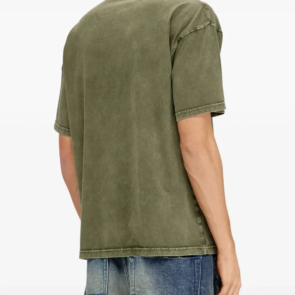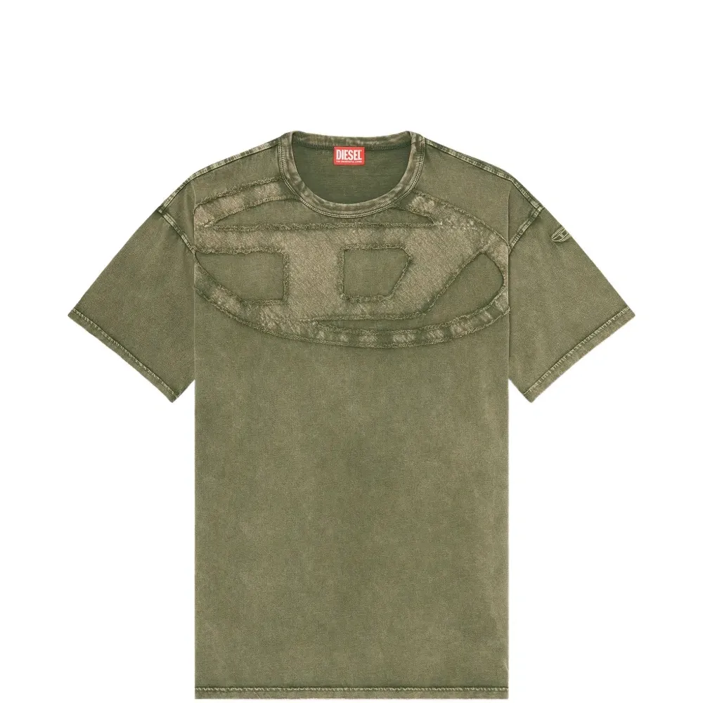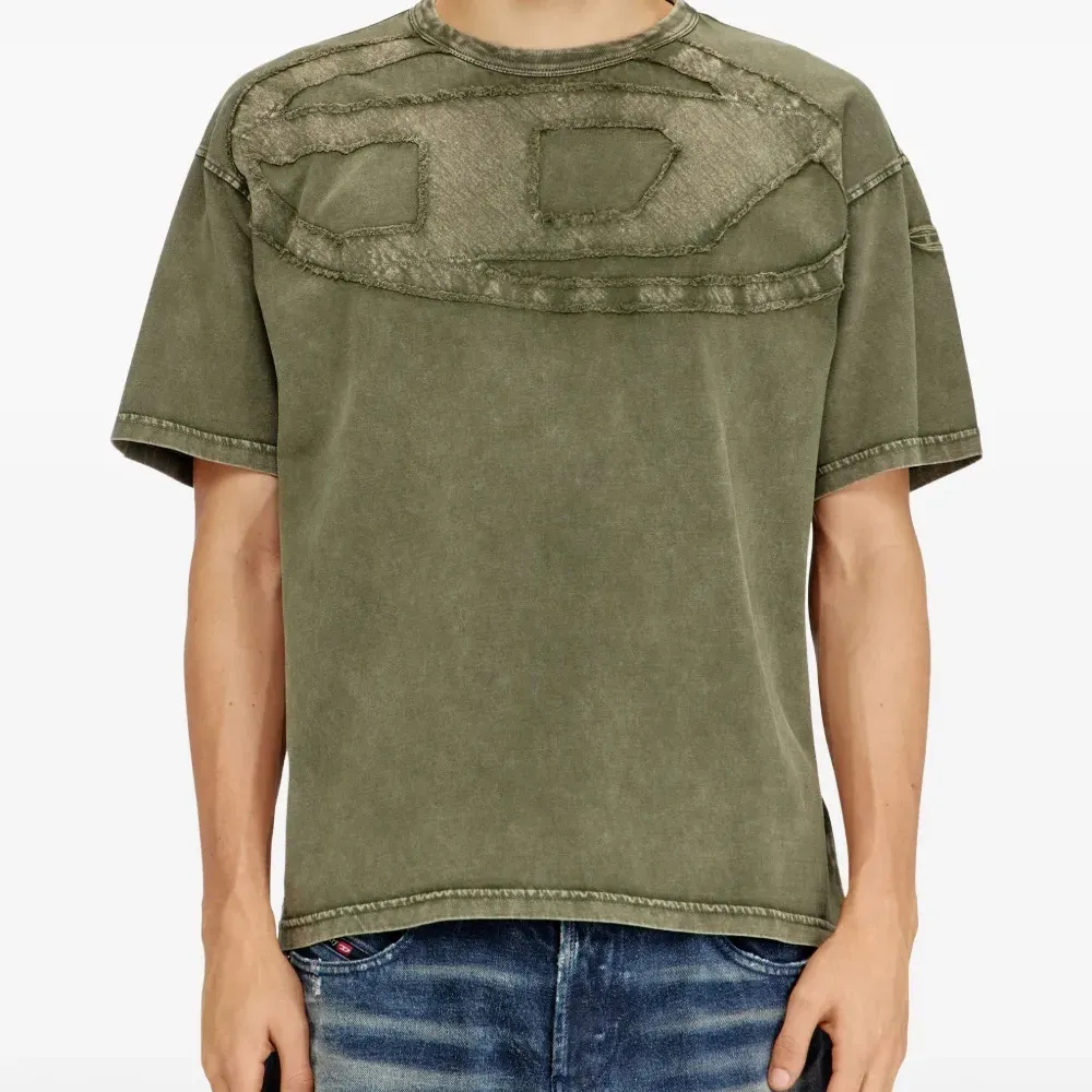 зеленая фирменная футболка с овальным логотипом D, круглым вырезом, короткими рукавами и прямым подолом