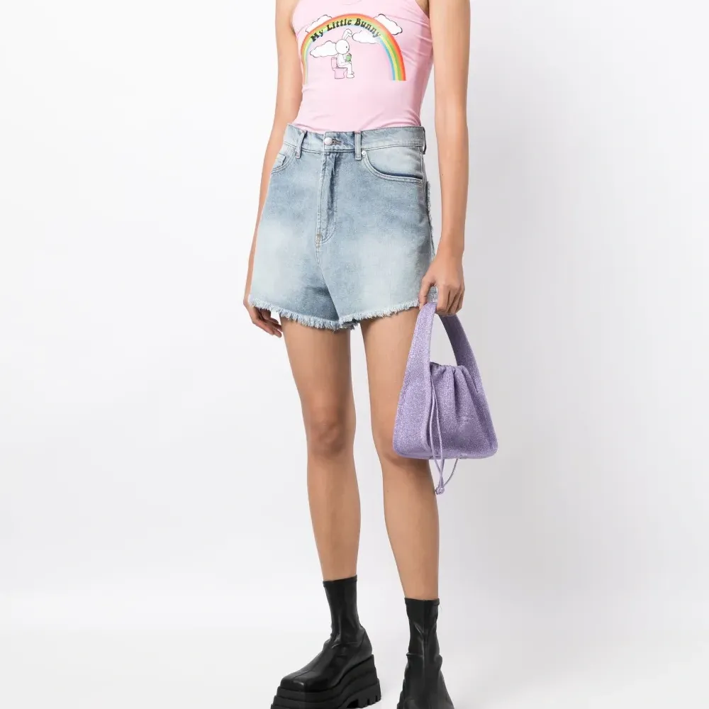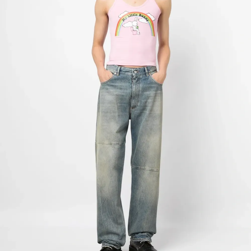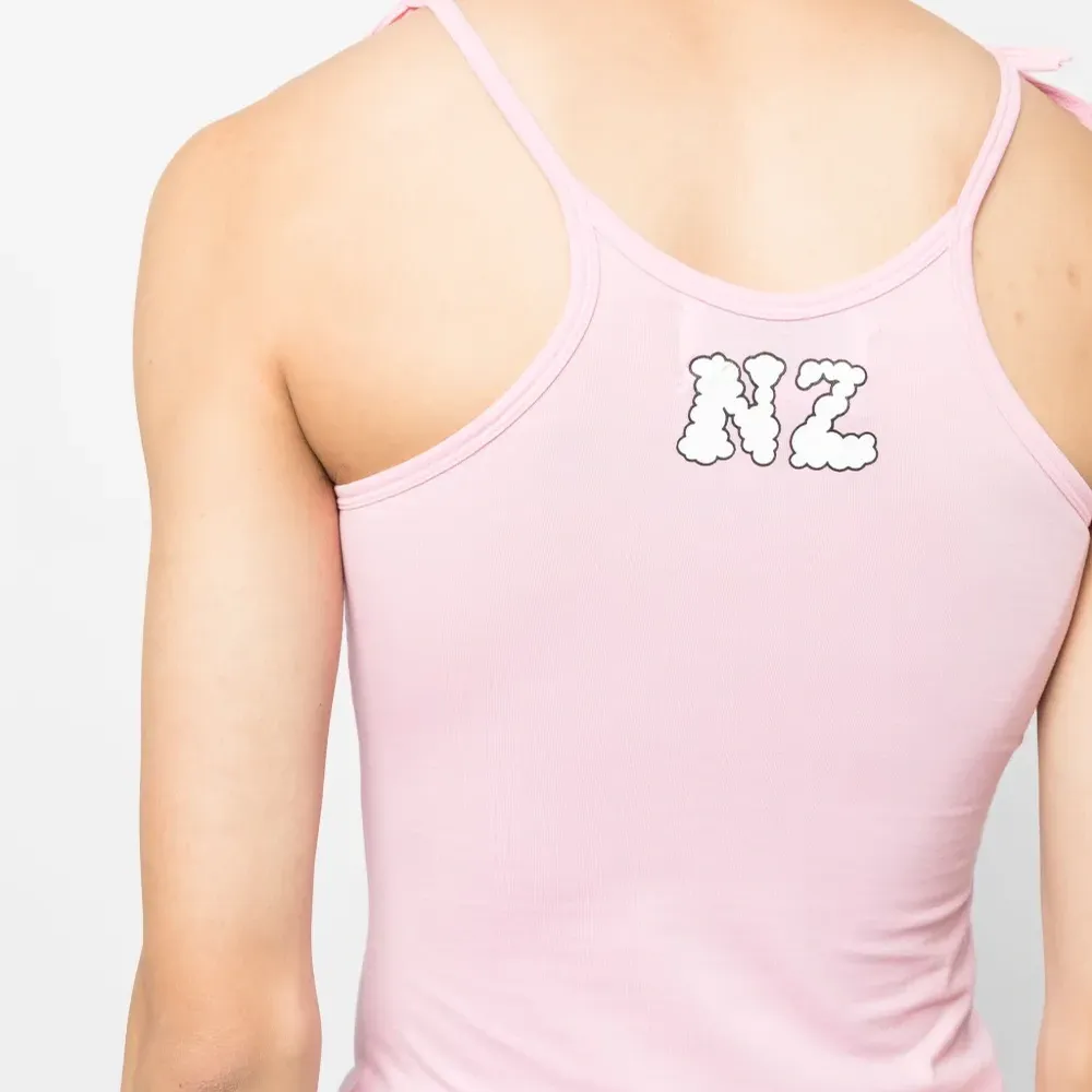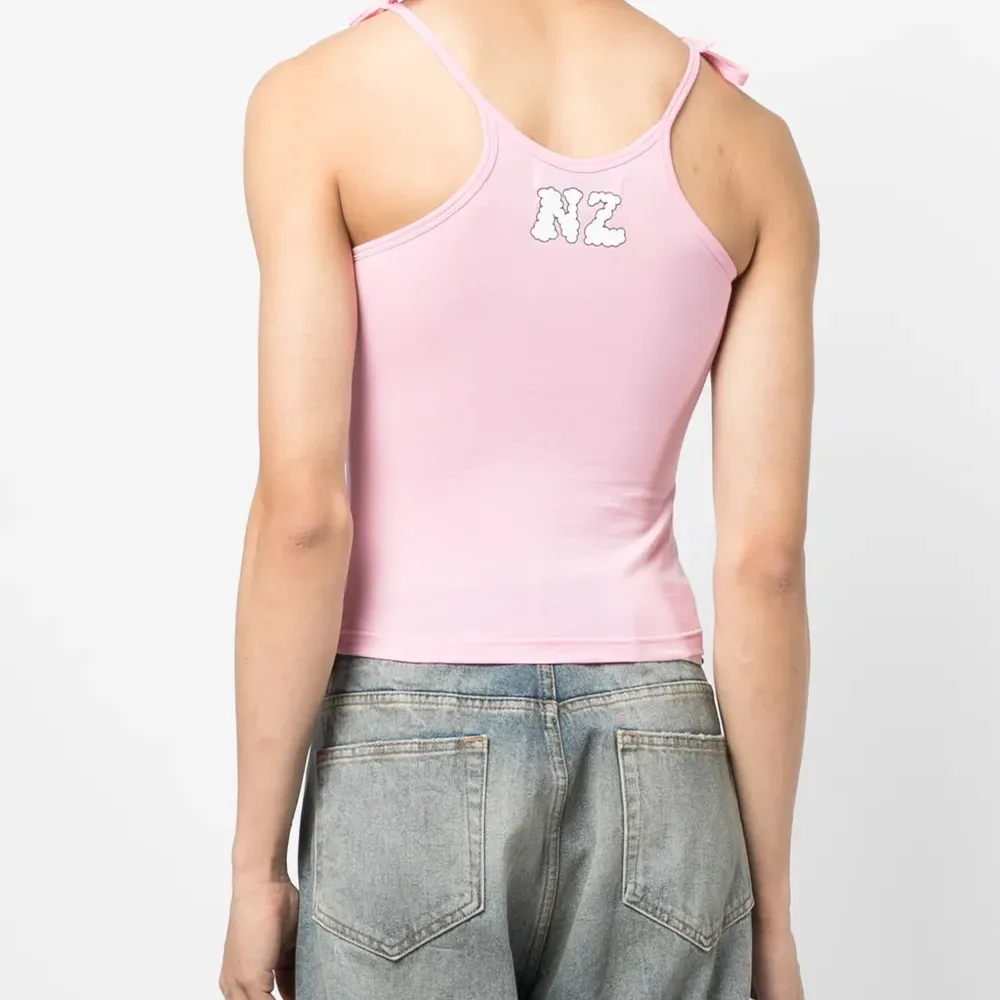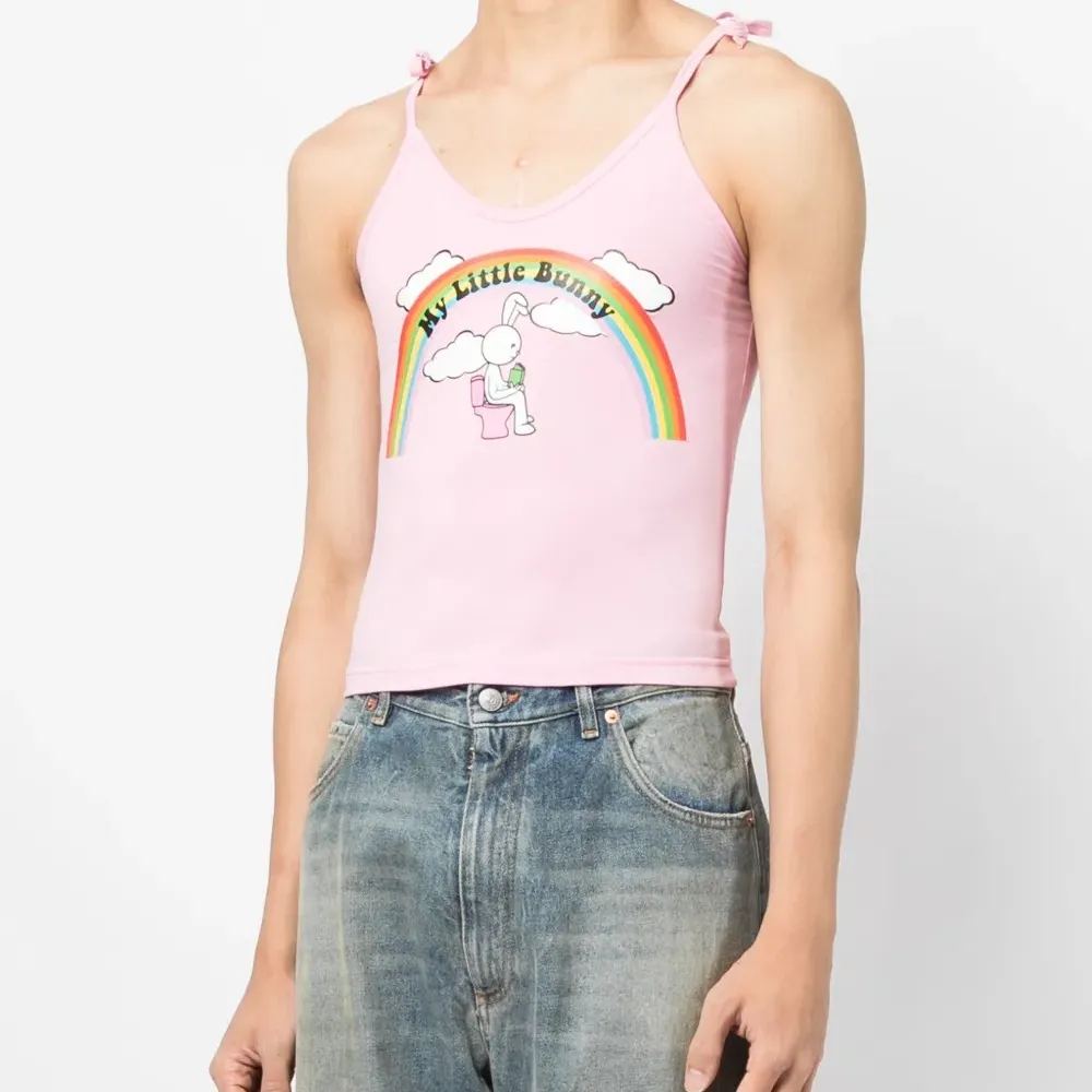 Светло-розовый, эластичный хлопок, графичный принт спереди, радужный принт, круглый вырез, застежка на узел, без рукавов и прямой подол. Это унисекс-модель. Обратите внимание, что для нее используется мужская размерная сетка.