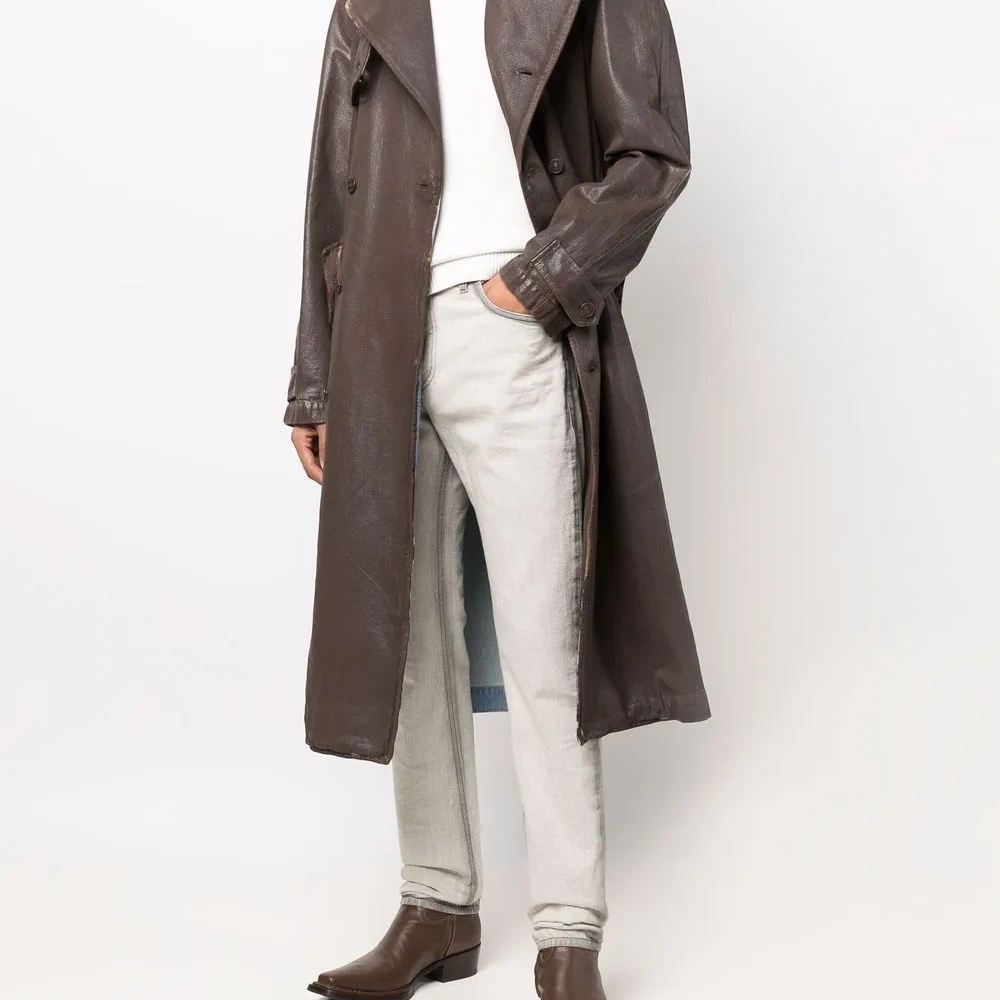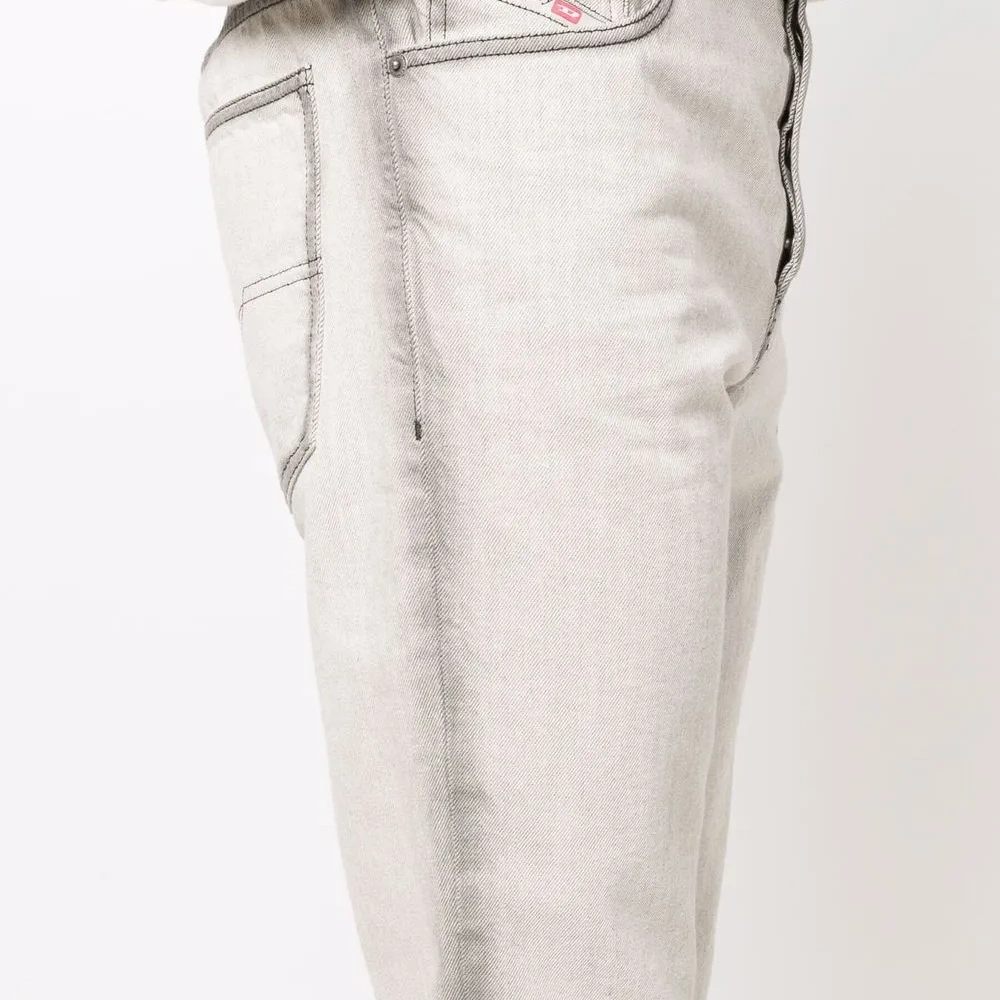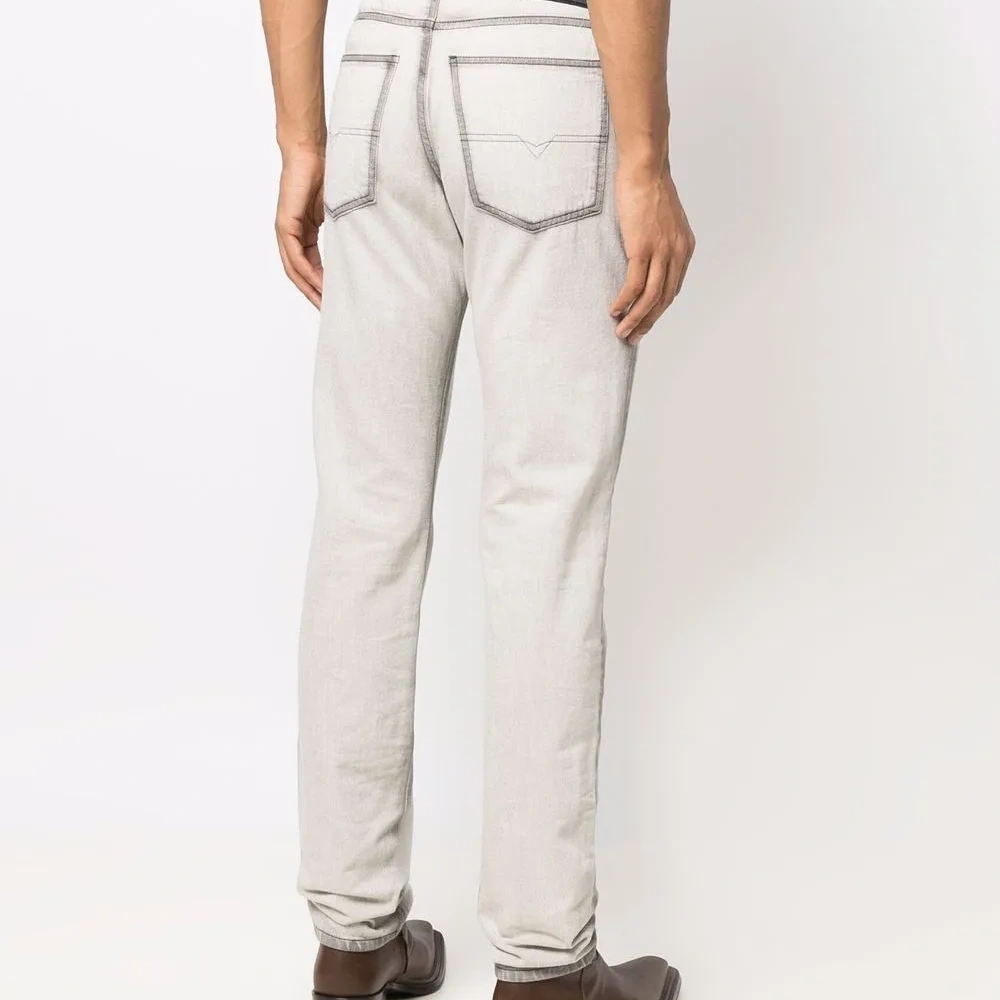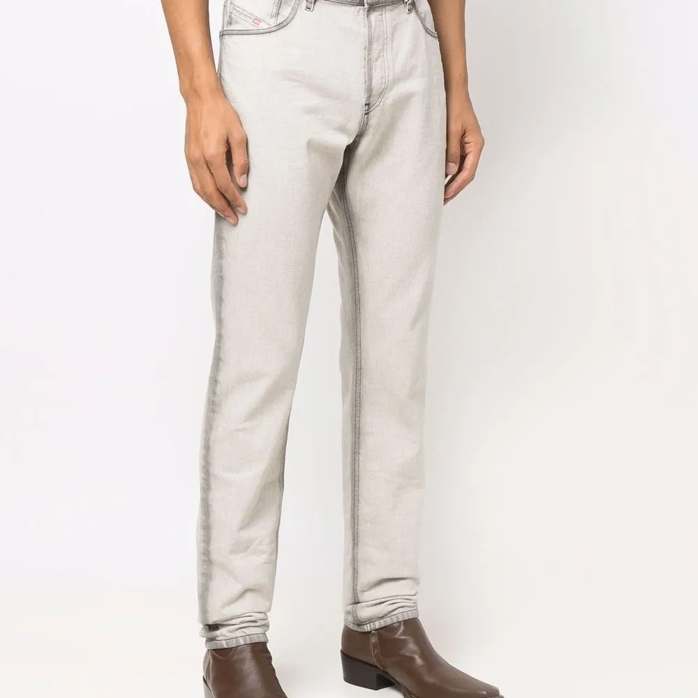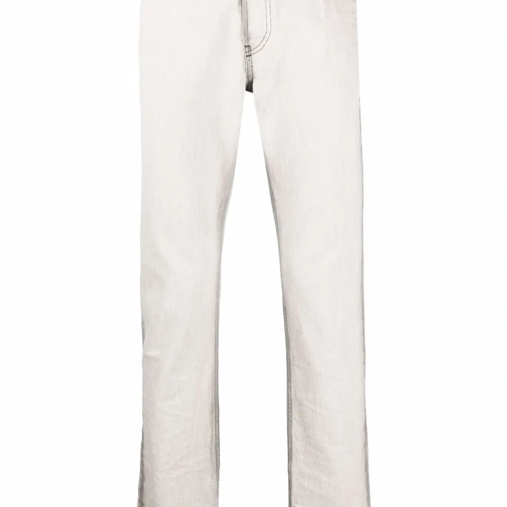Эффект потертости, вышитый логотип сбоку, нашивка с логотипом сзади, ширинка на пуговицах, петли для ремня, классическая пятикарманная модель и прямой крой.
