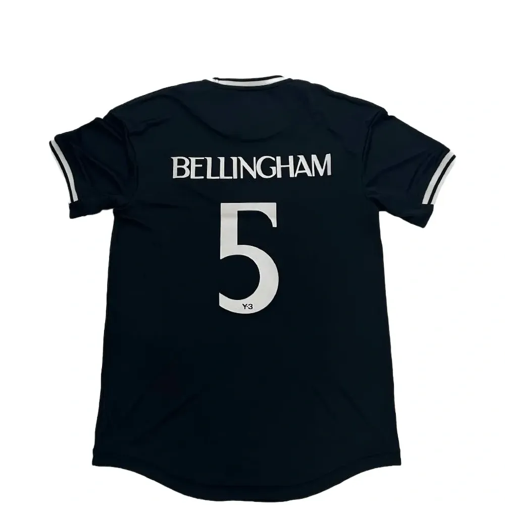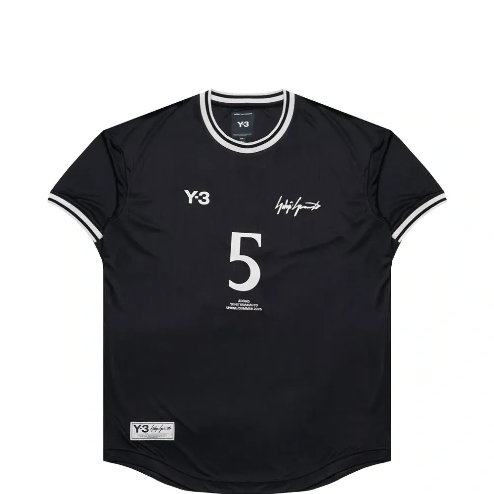 чёрная футболка с круглым вырезом, короткими рукавами, полосатой отделкой, графическим элементом и номером