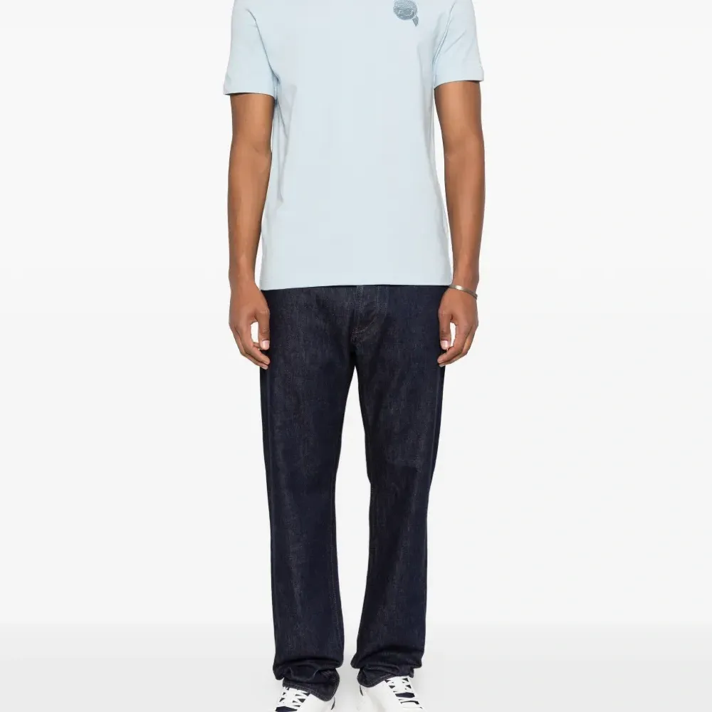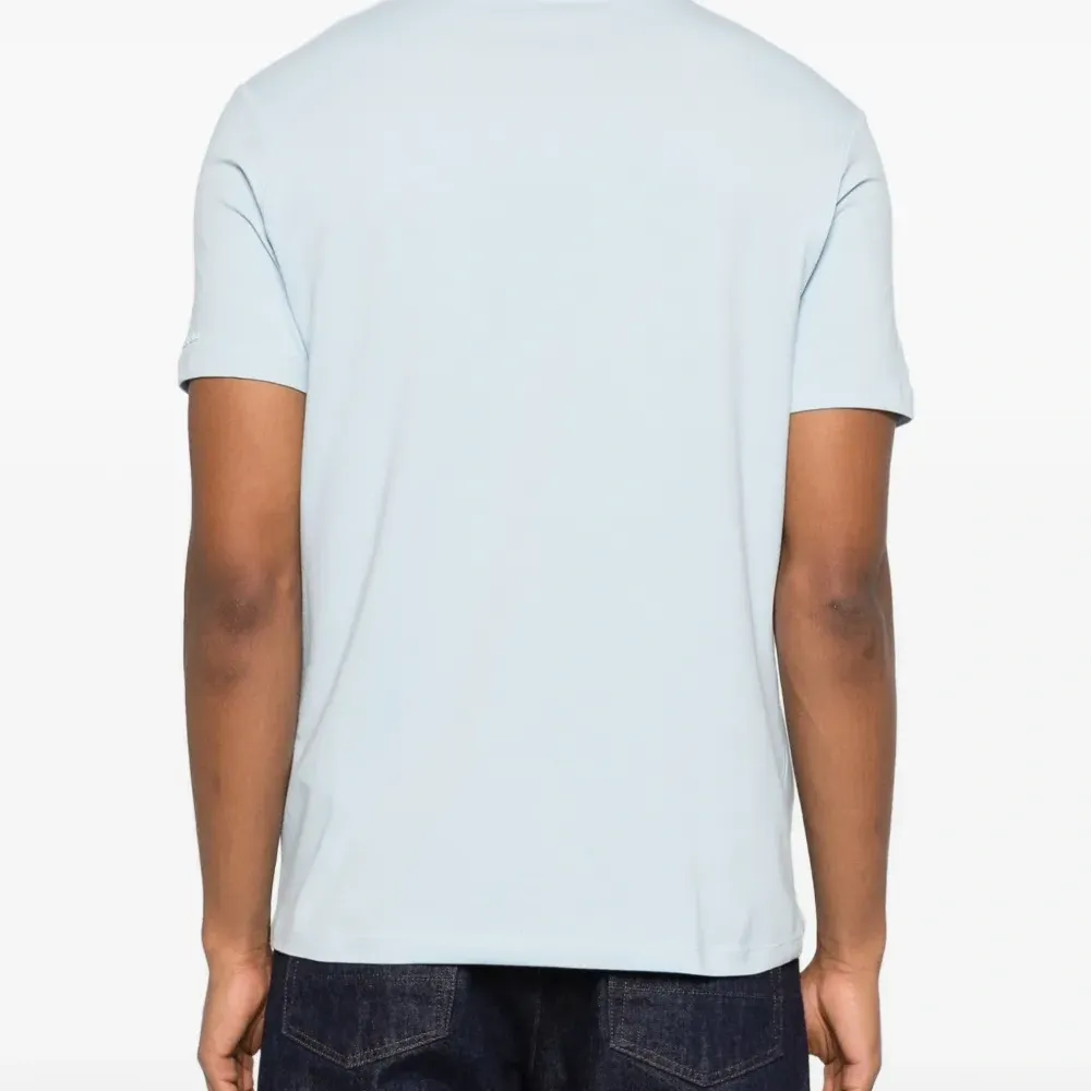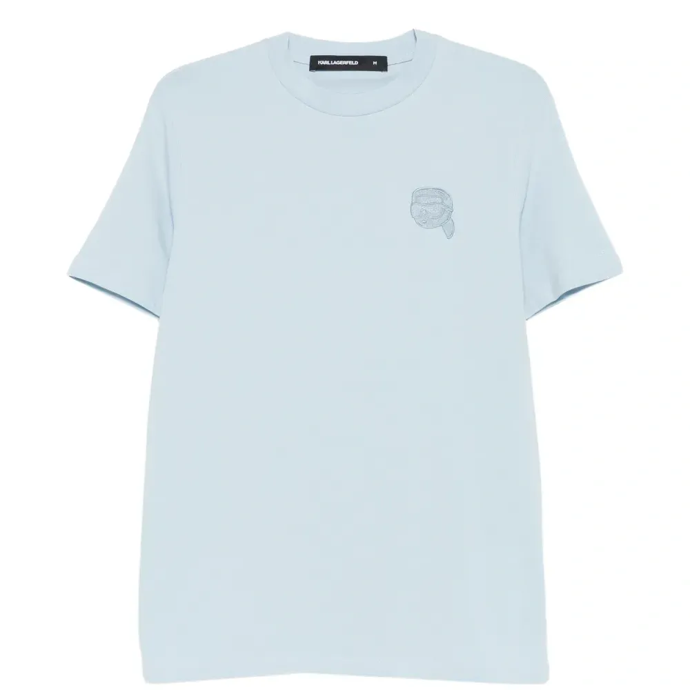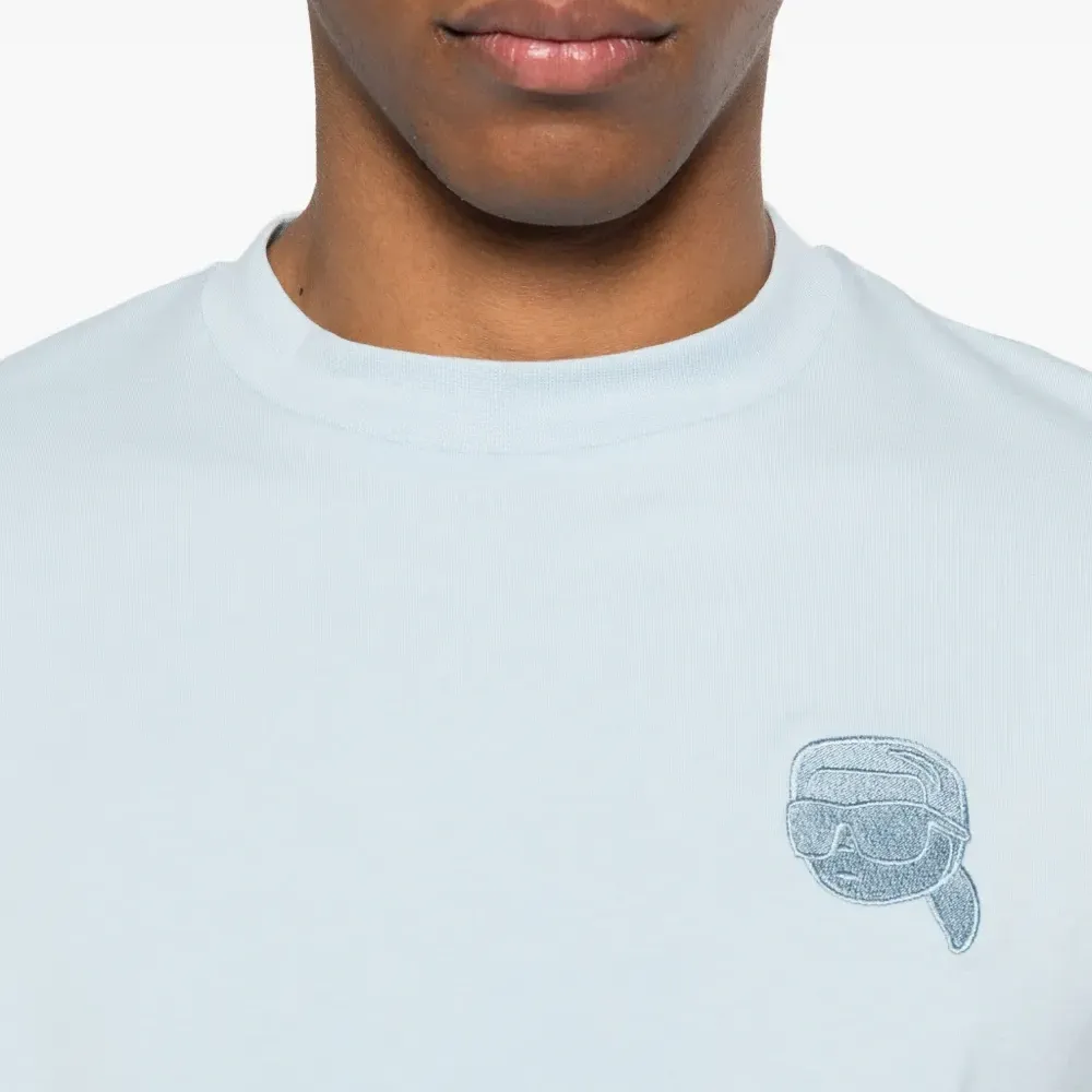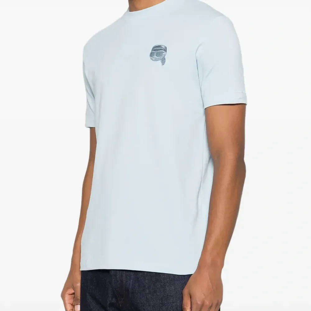 светло-голубая футболка с тональным логотипом, круглым вырезом и короткими рукавами
