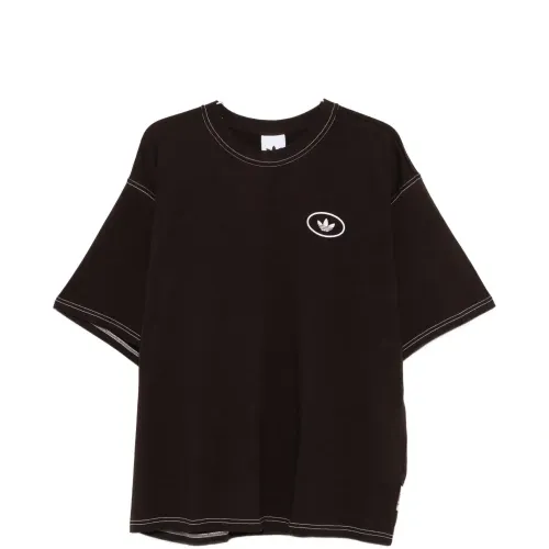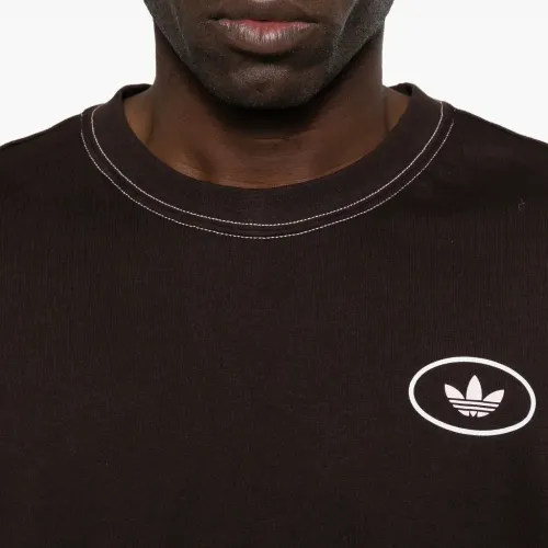 коричневая футболка с нашивкой-логотипом, контрастной прострочкой, круглым вырезом и короткими рукавами
