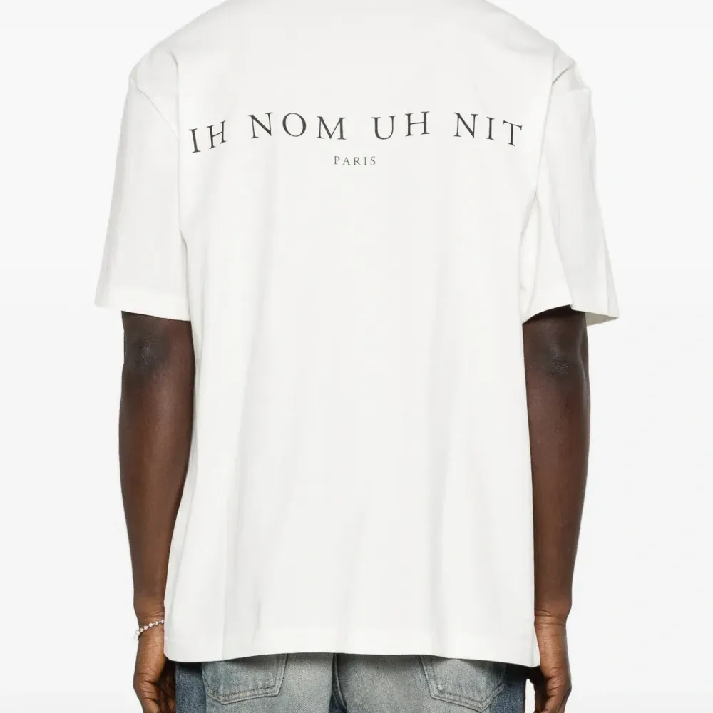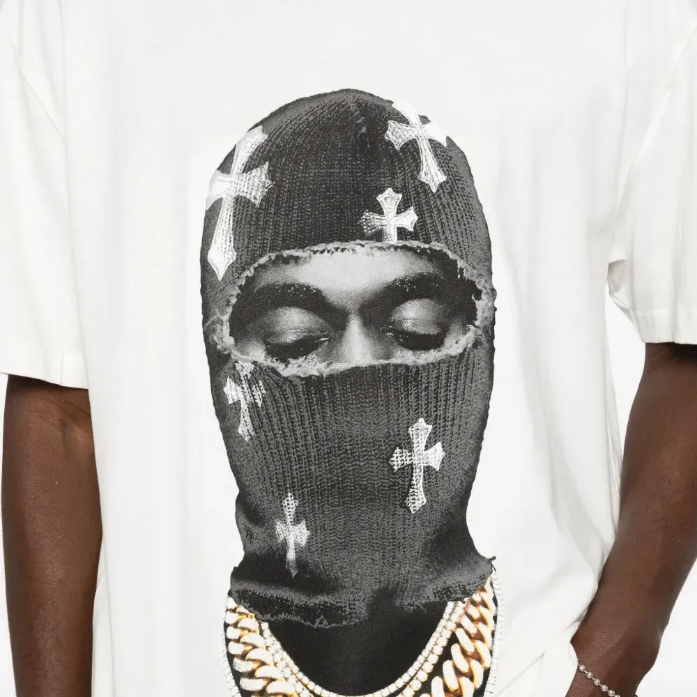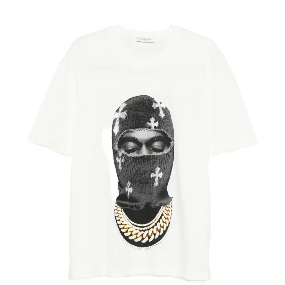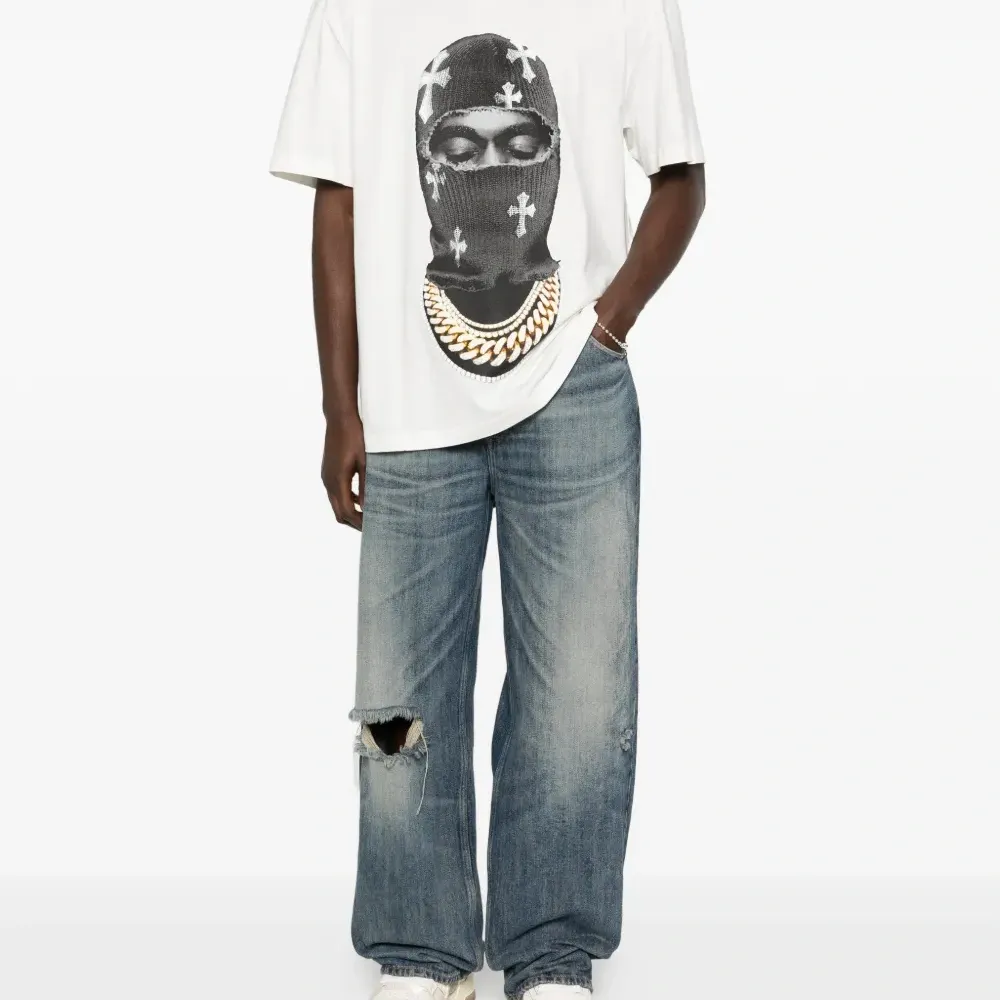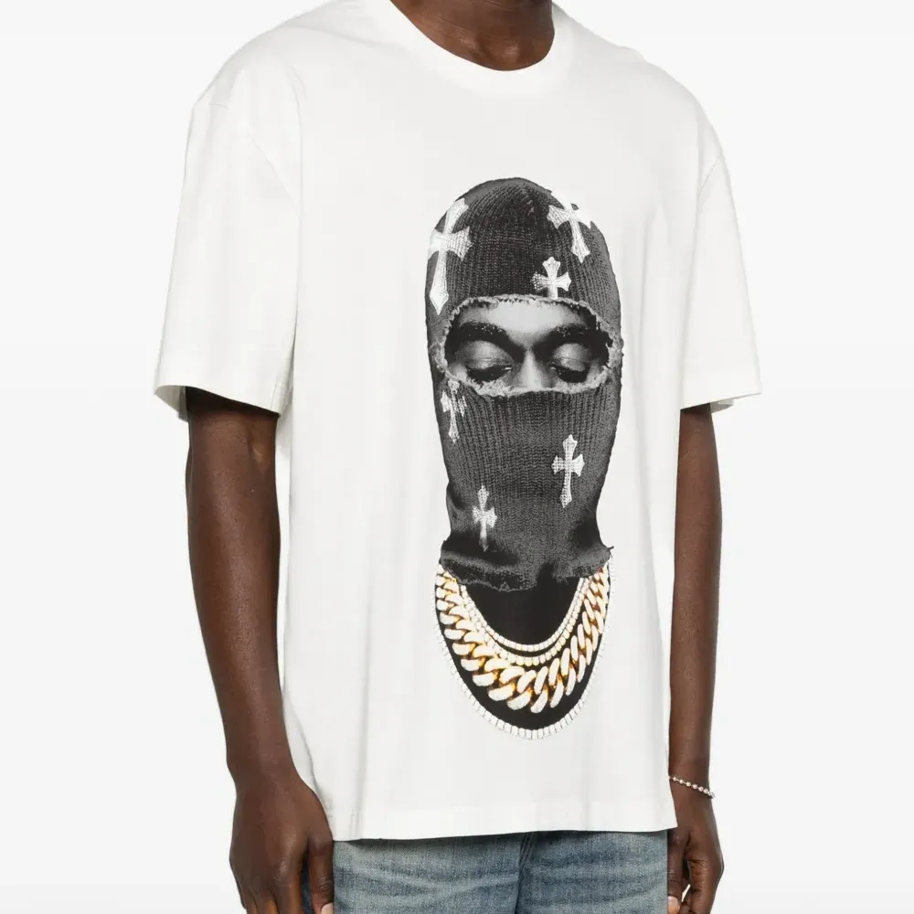 белая футболка с графическим принтом, круглым вырезом и короткими рукавами