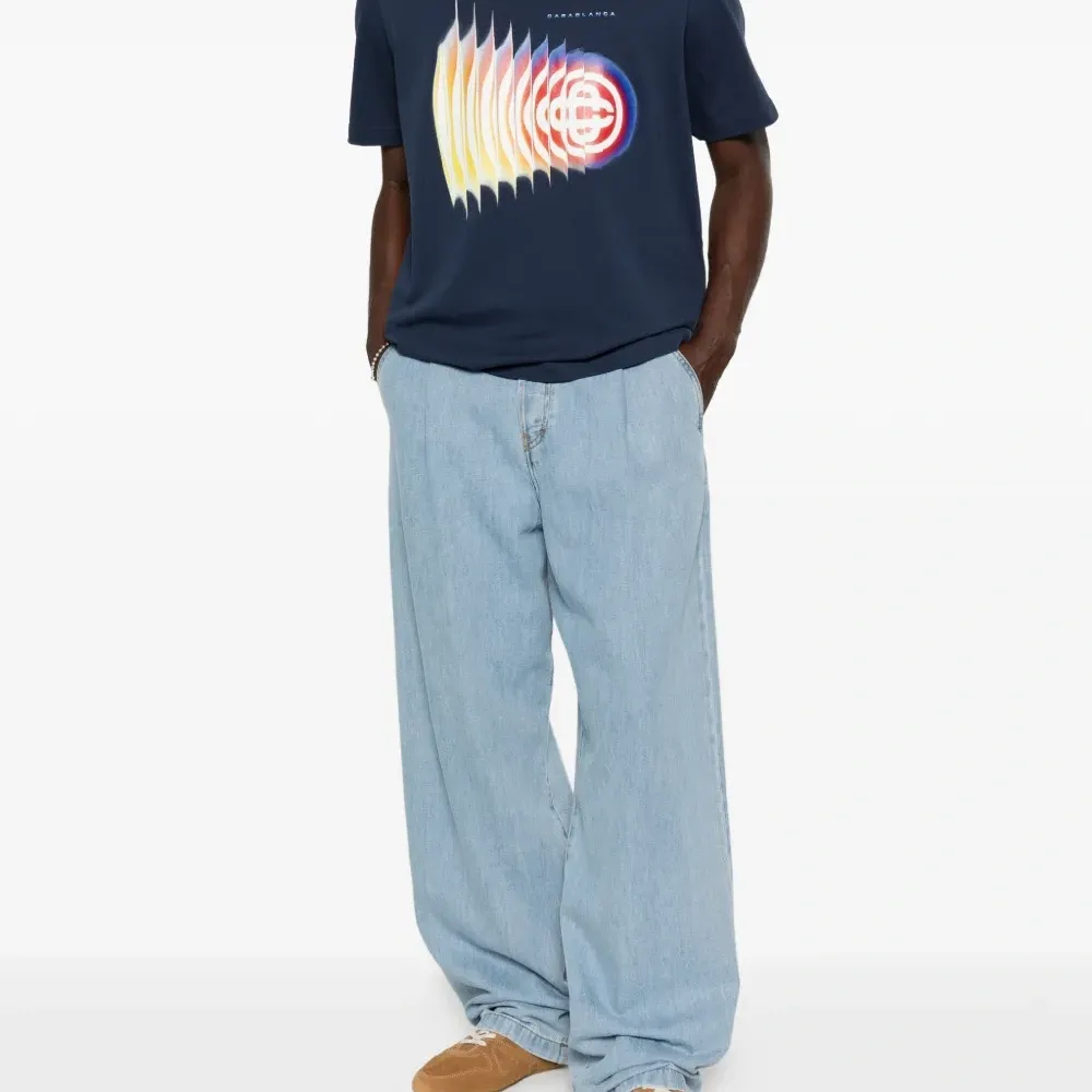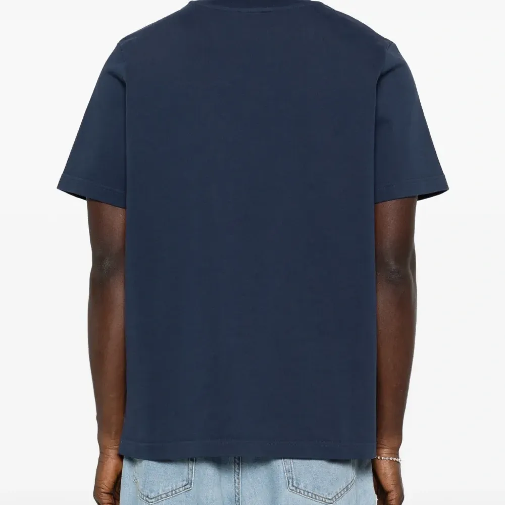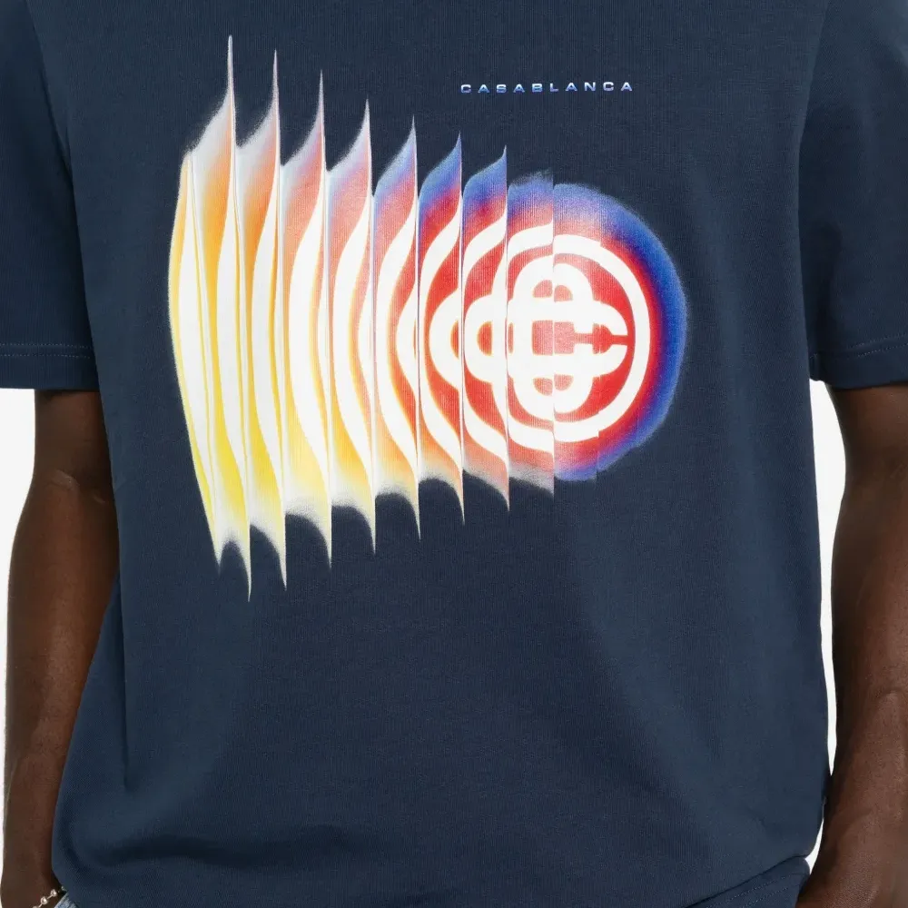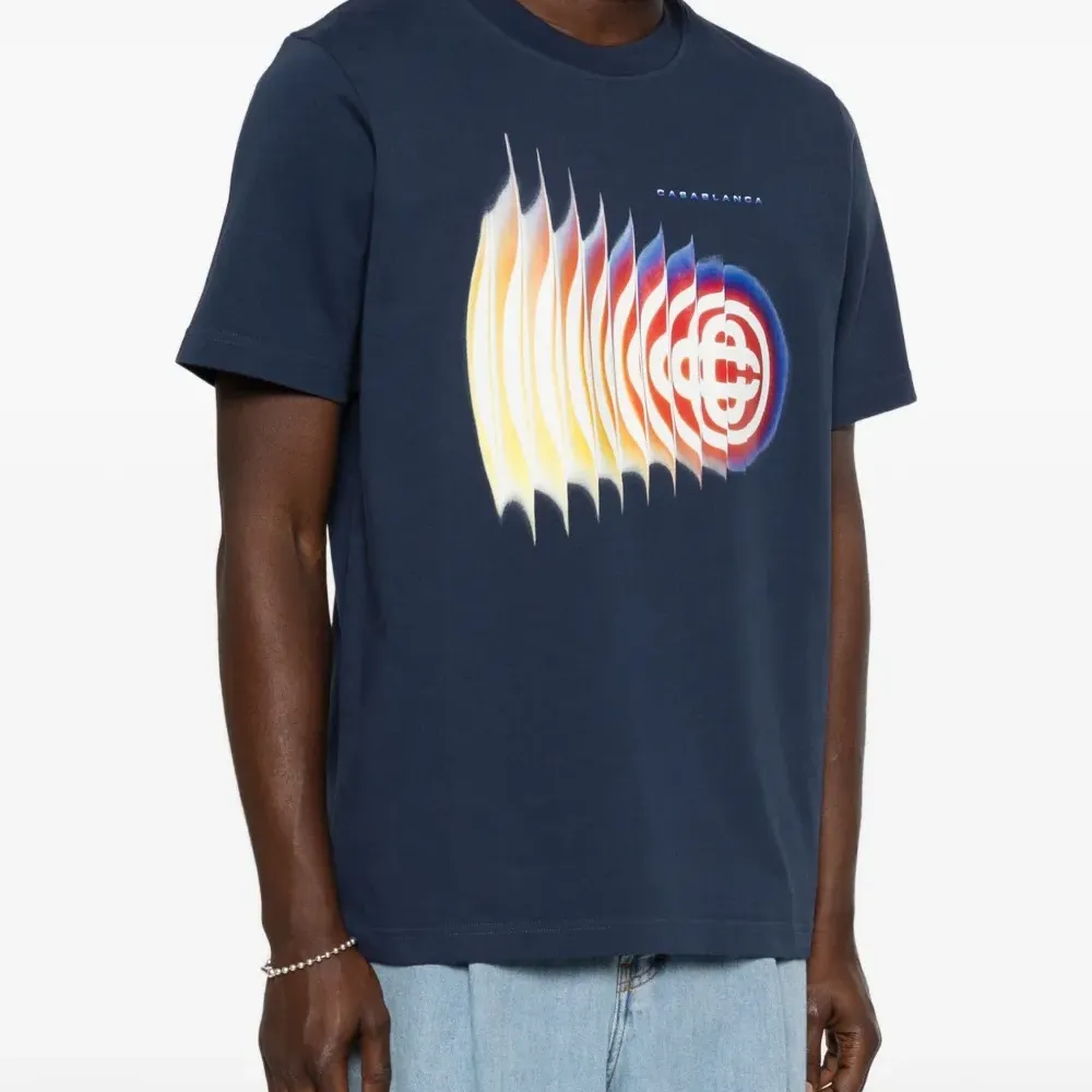 темно-синяя футболка из хлопка с графическим принтом, круглым вырезом и короткими рукавами
