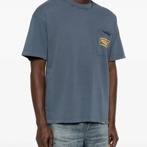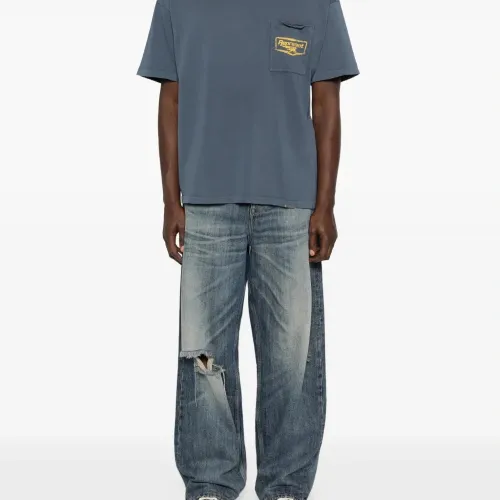 голубая футболка с круглым вырезом, короткими рукавами и принтом на груди и нагрудным карманом