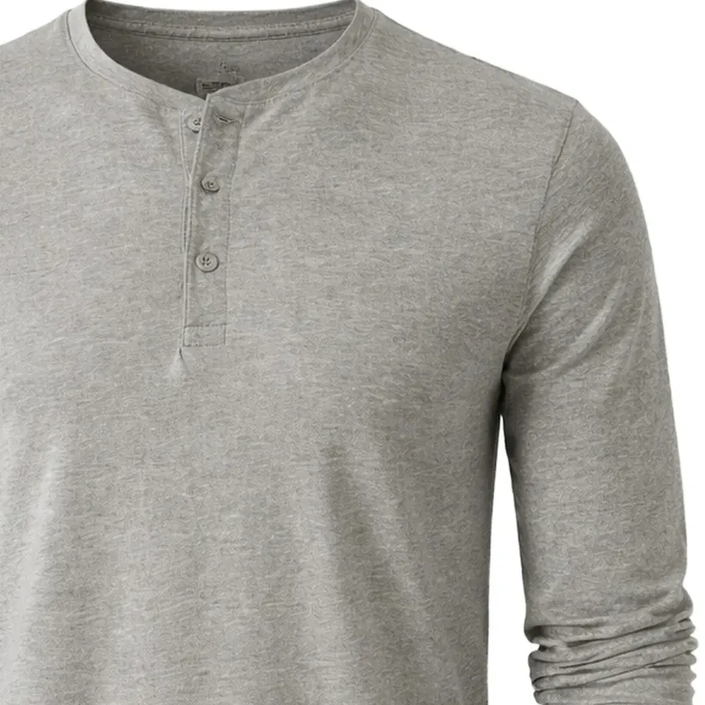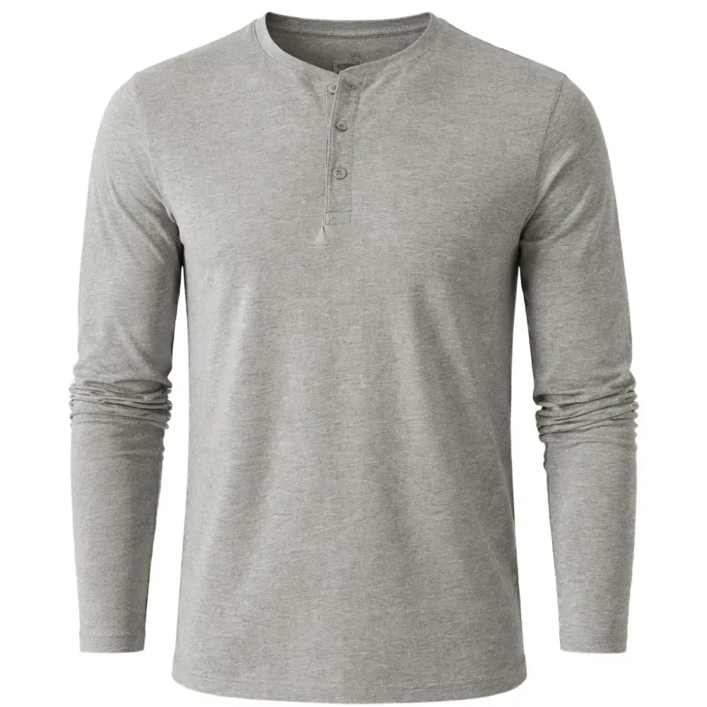 Светло-серый джемпер с круглым вырезом, длинными рукавами и пуговицами.