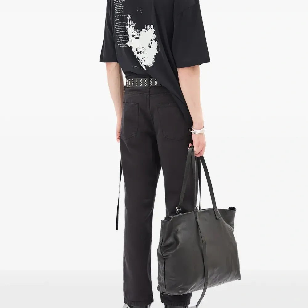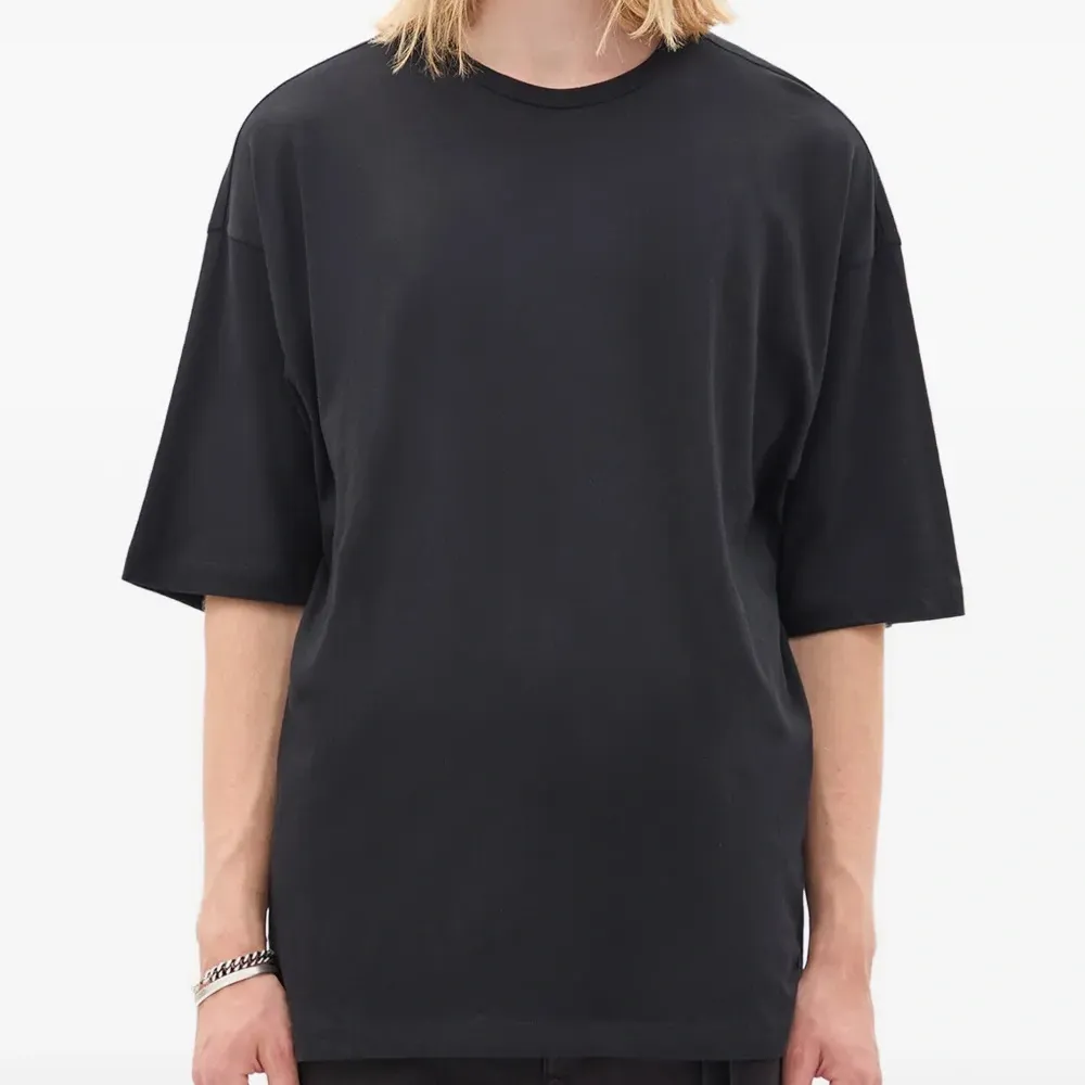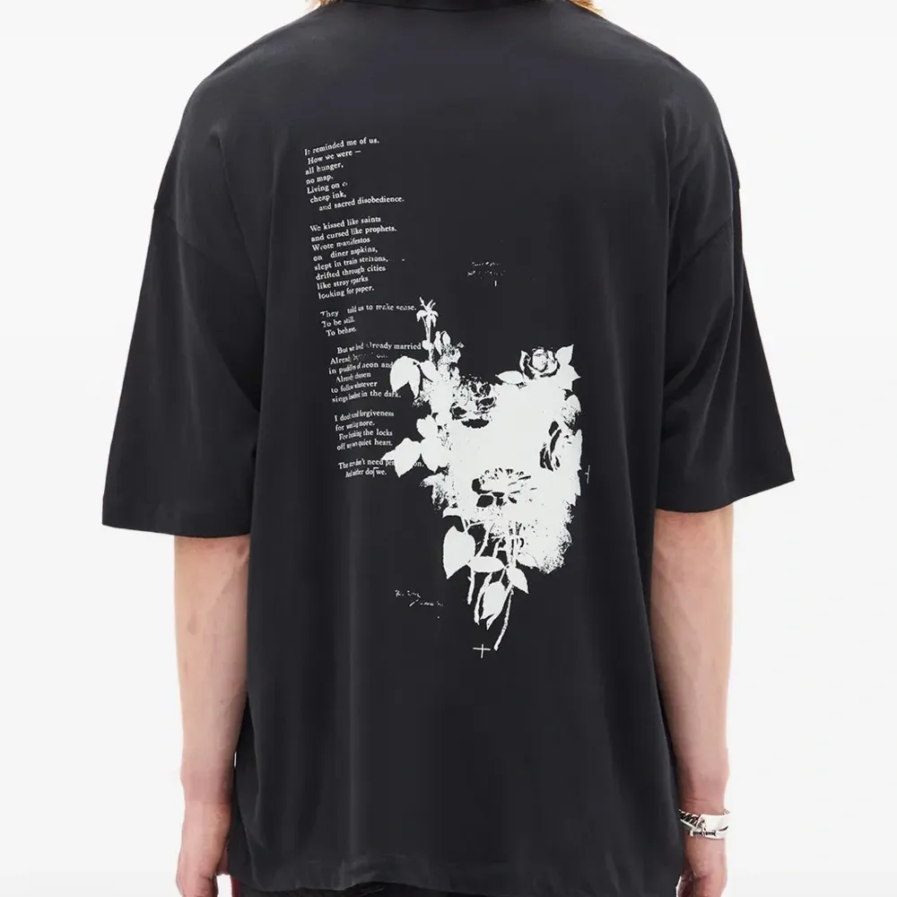 чёрная футболка с принтом на спине, круглым вырезом и короткими рукавами
