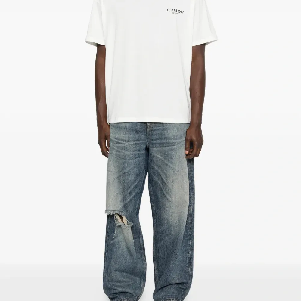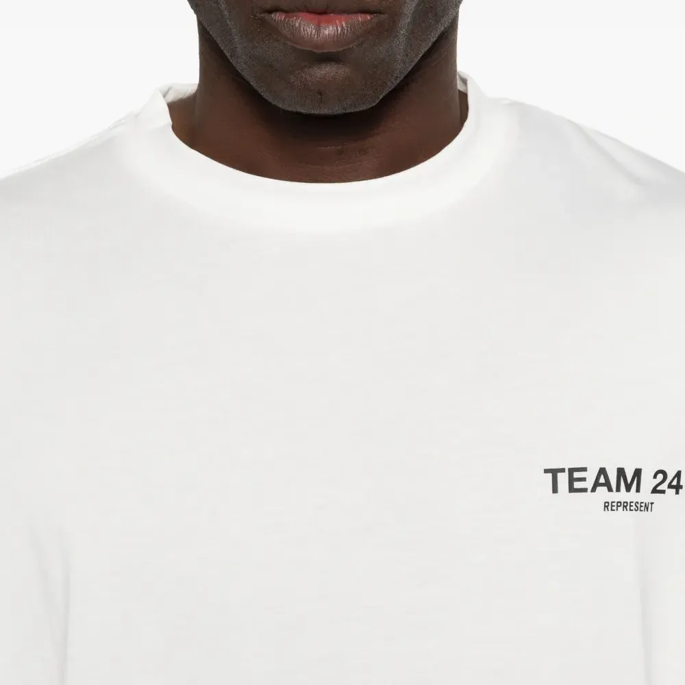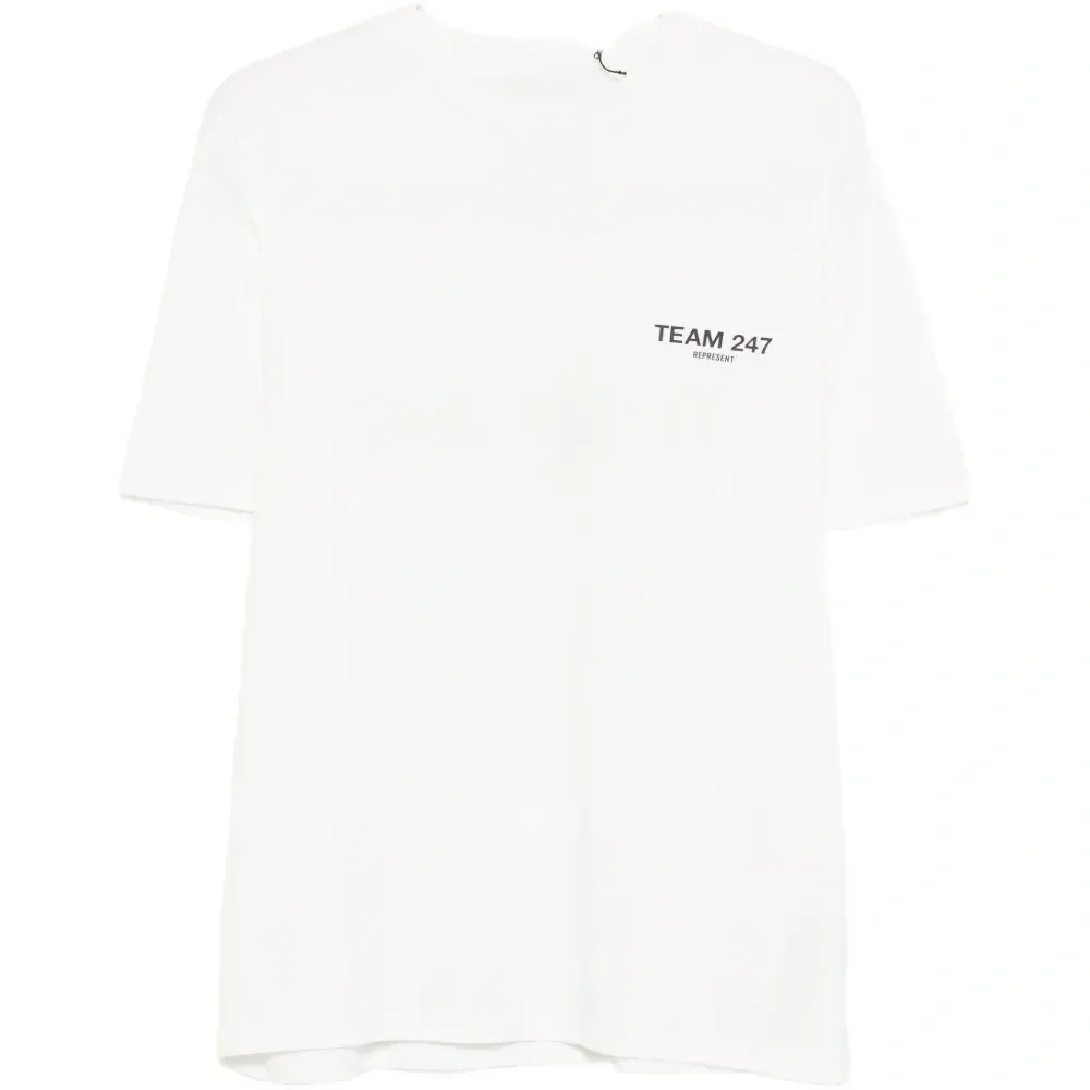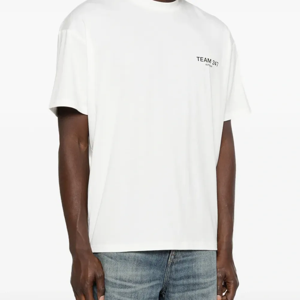 белая футболка с круглым вырезом, короткими рукавами и логотипом