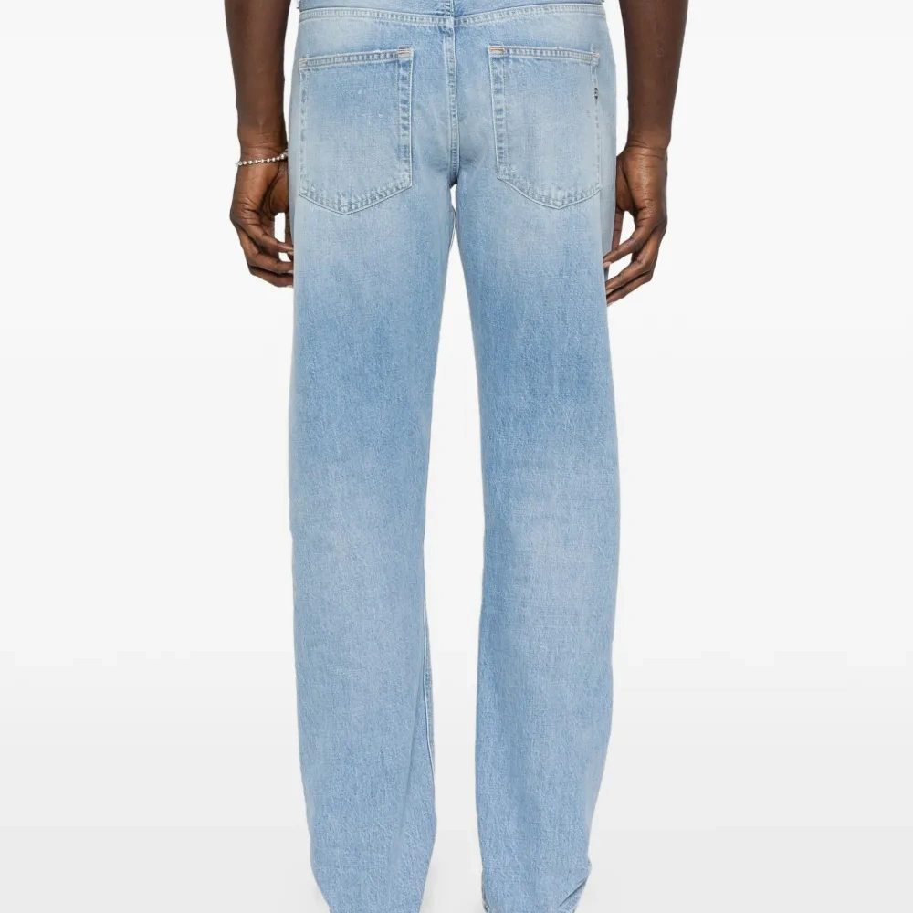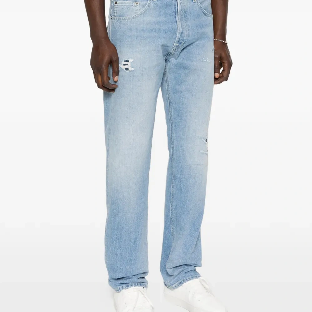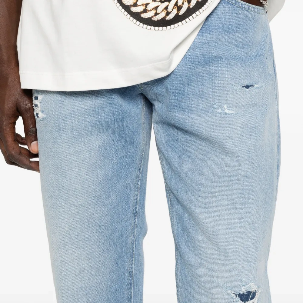 светло-голубые джинсы с потертым эффектом, пятью карманами, шлёвками для ремня и застёжкой на пуговицу