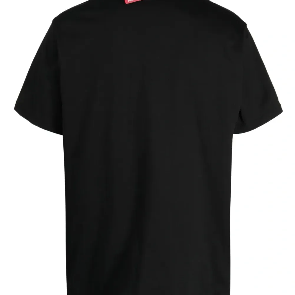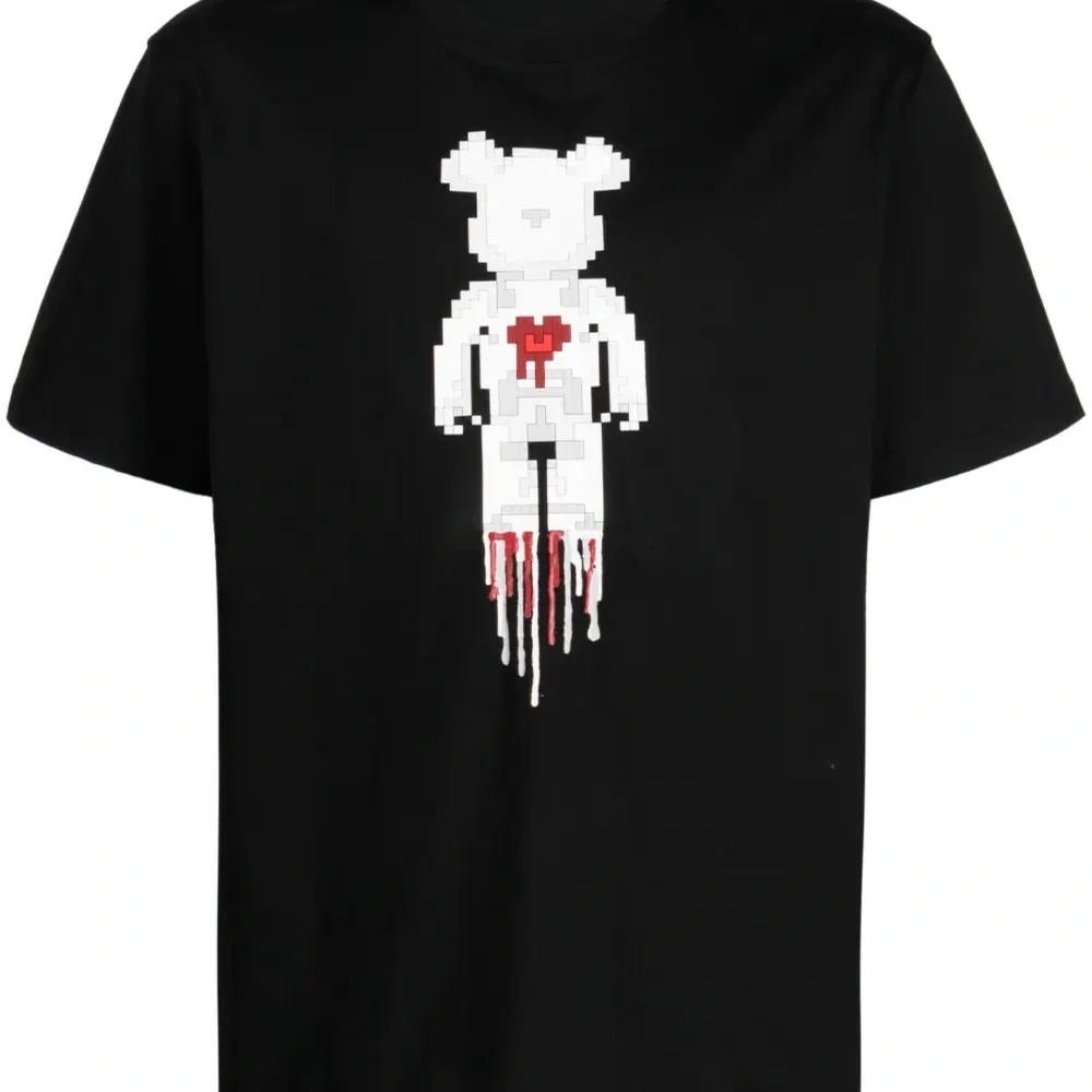 Черный, хлопок, принт с изображением плюшевого медведя, аппликация, круглый вырез, короткие рукава и прямой подол.