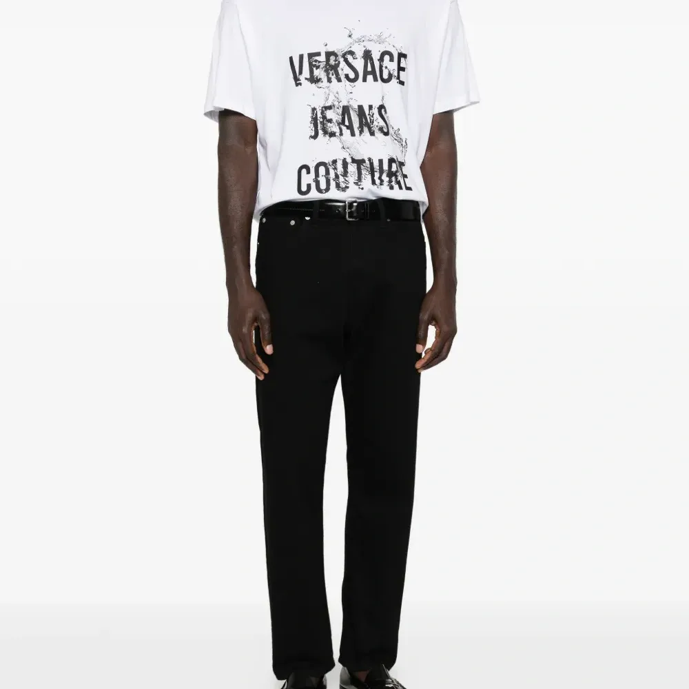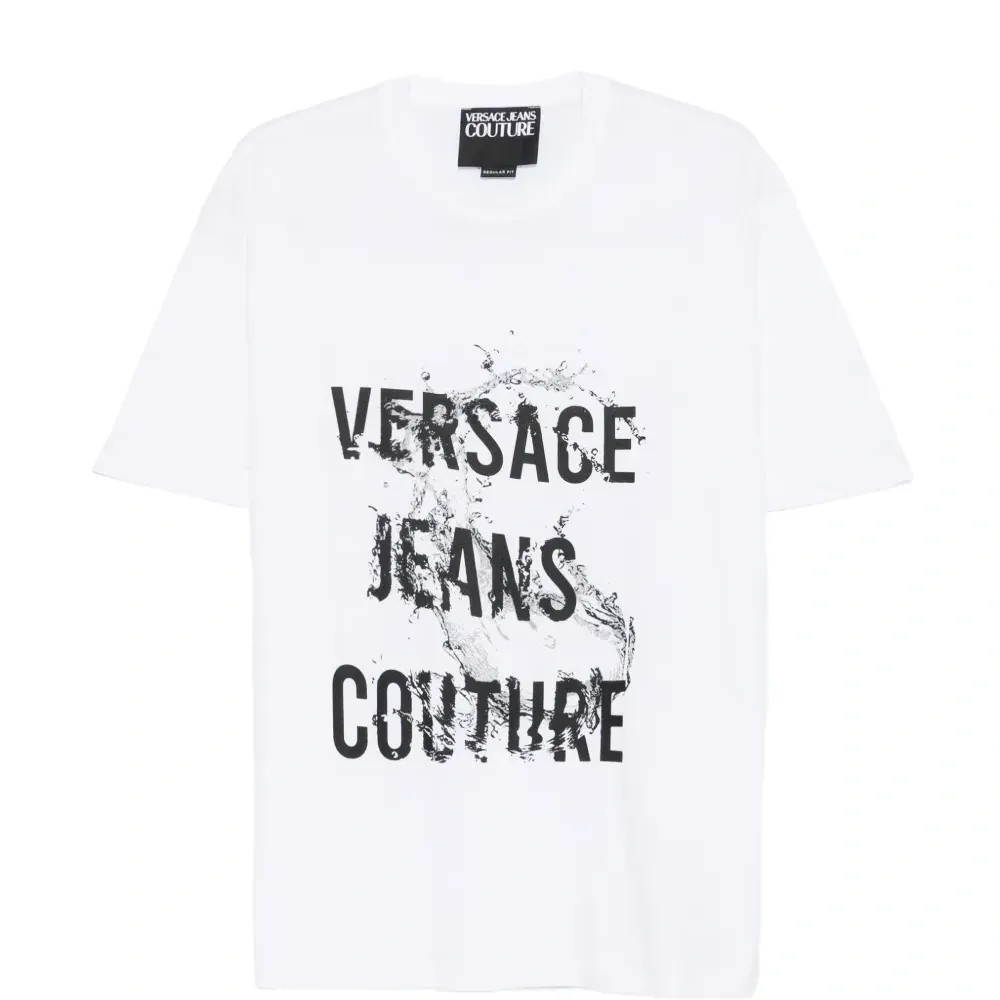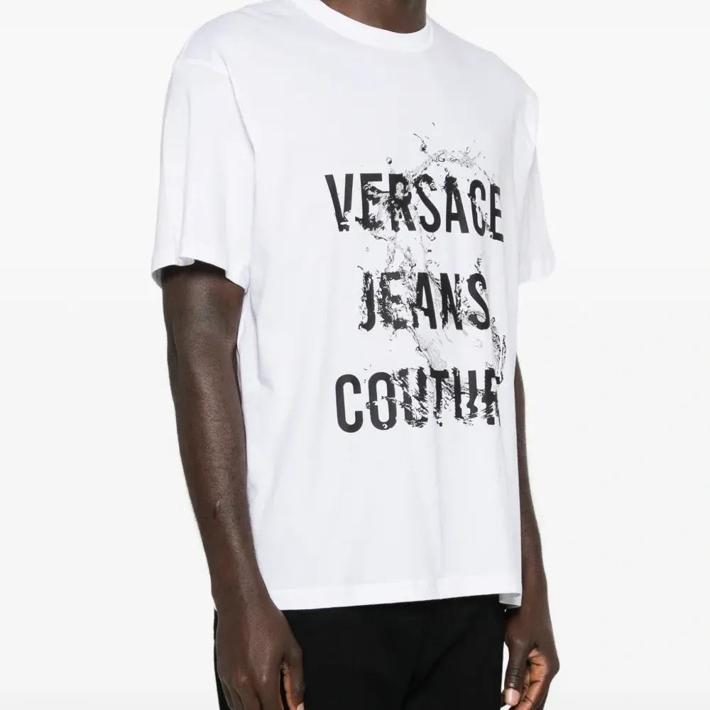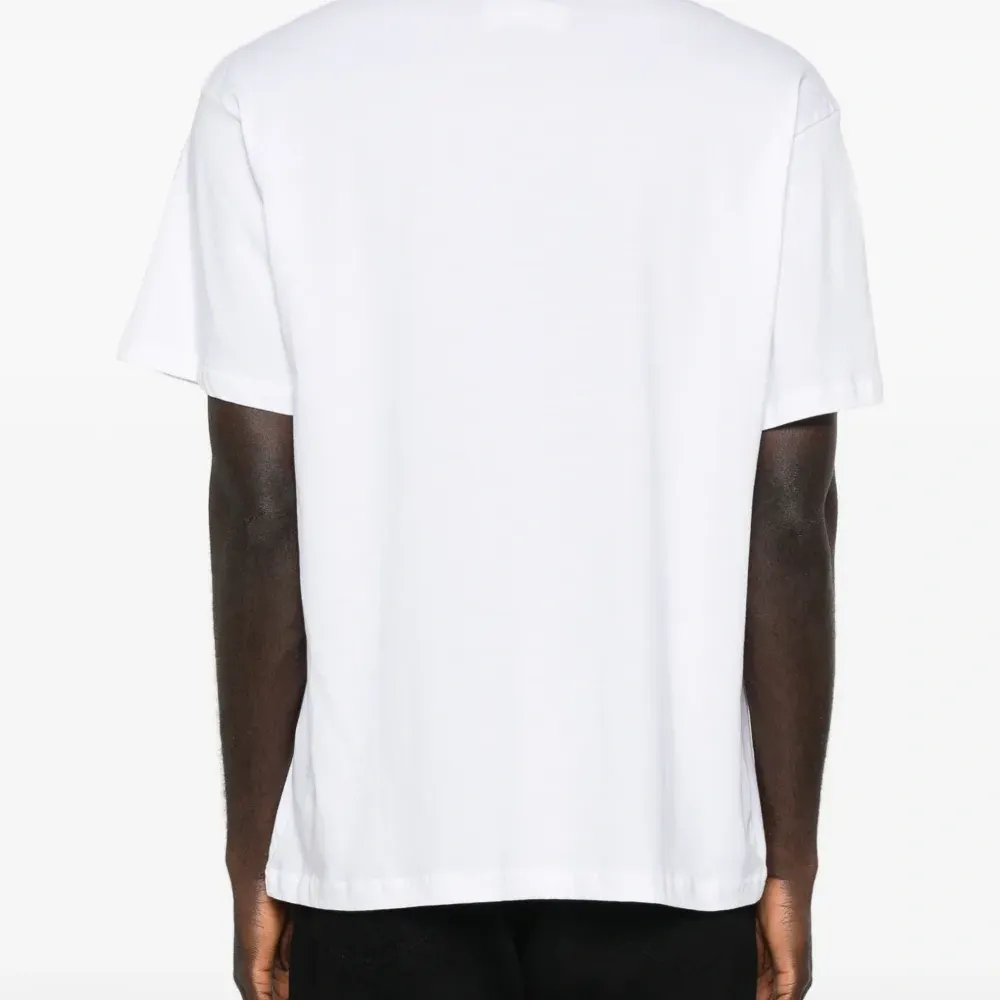 белая футболка с круглым вырезом, принтом логотипа, короткими рукавами, стандартным кроем и прямым подолом