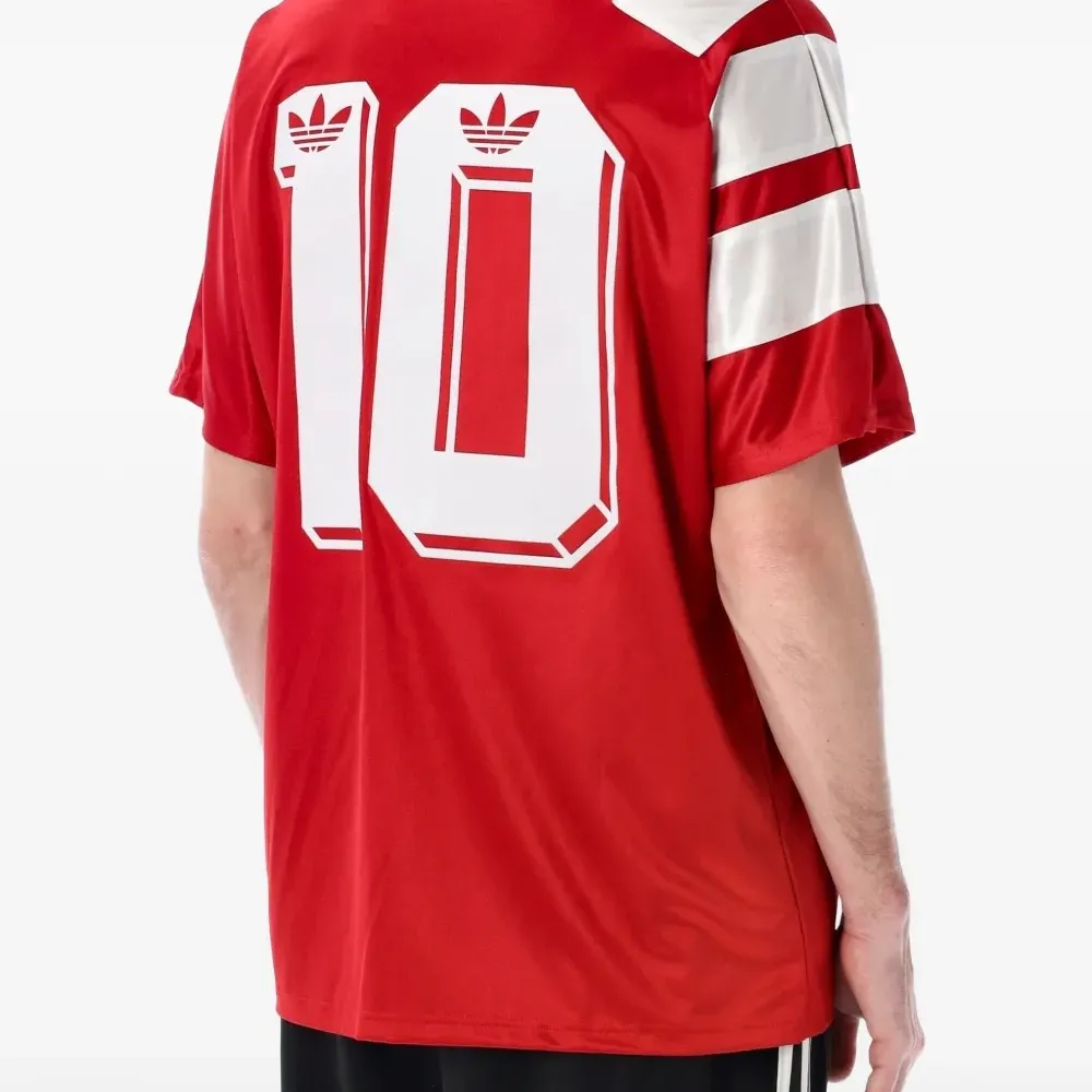 красные детали с цифрами, логотип, V-образный вырез, короткие рукава