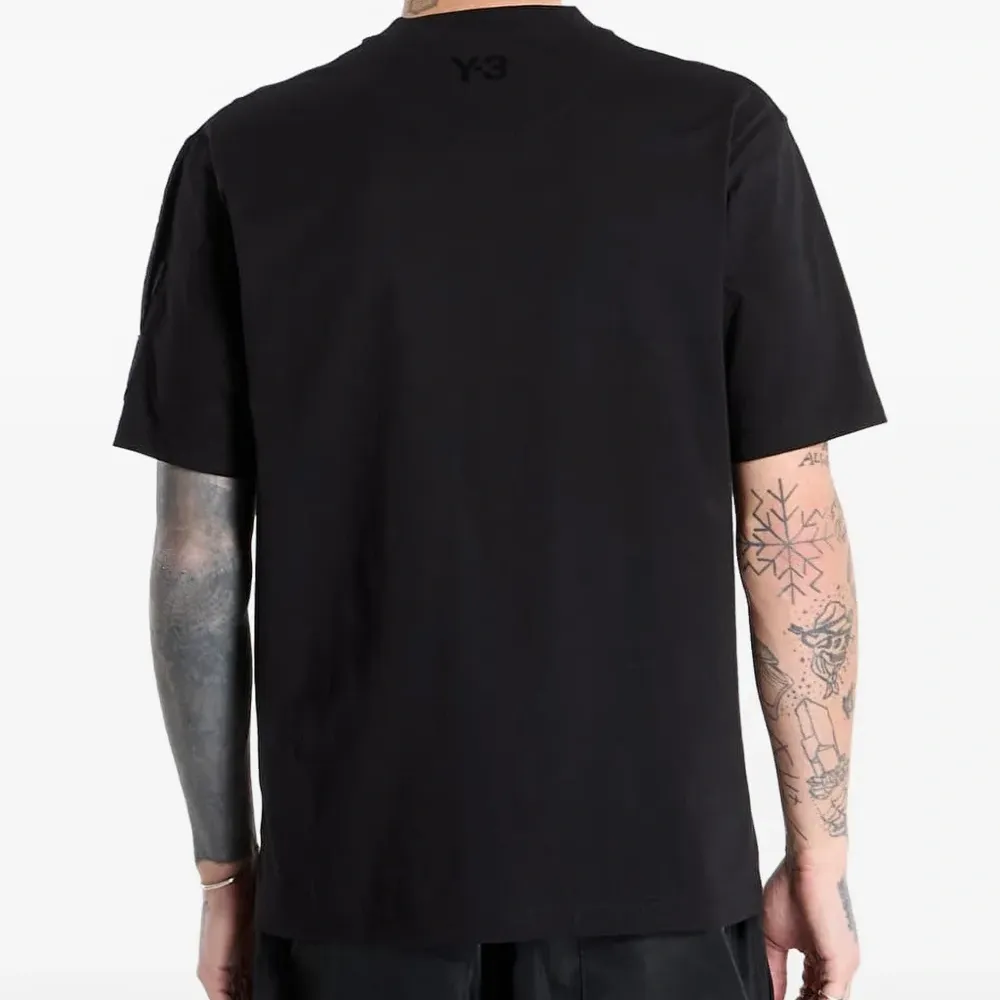 чёрная футболка с короткими рукавами, круглым вырезом и накладным карманом