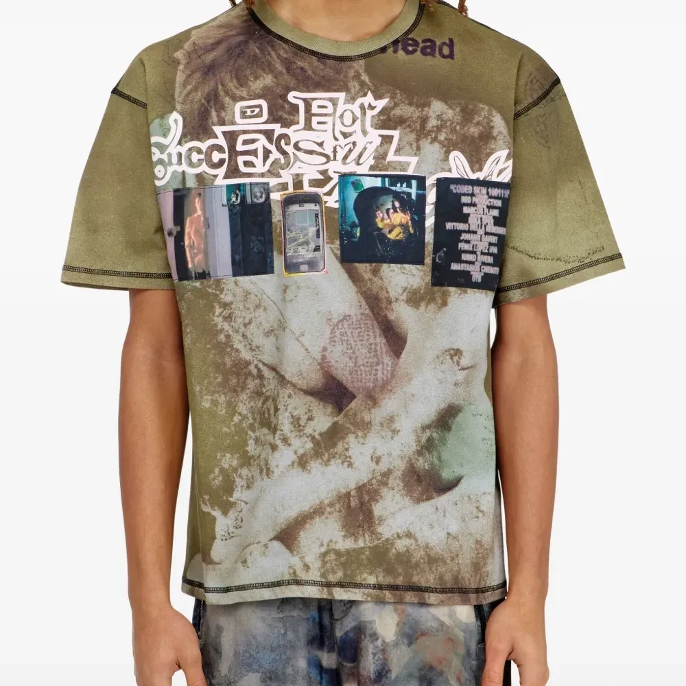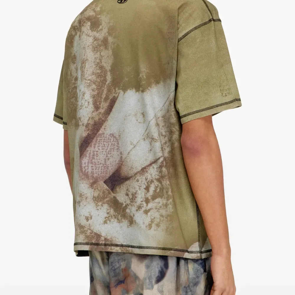 зелёная хлопковая футболка с графическим принтом, круглым вырезом и короткими рукавами