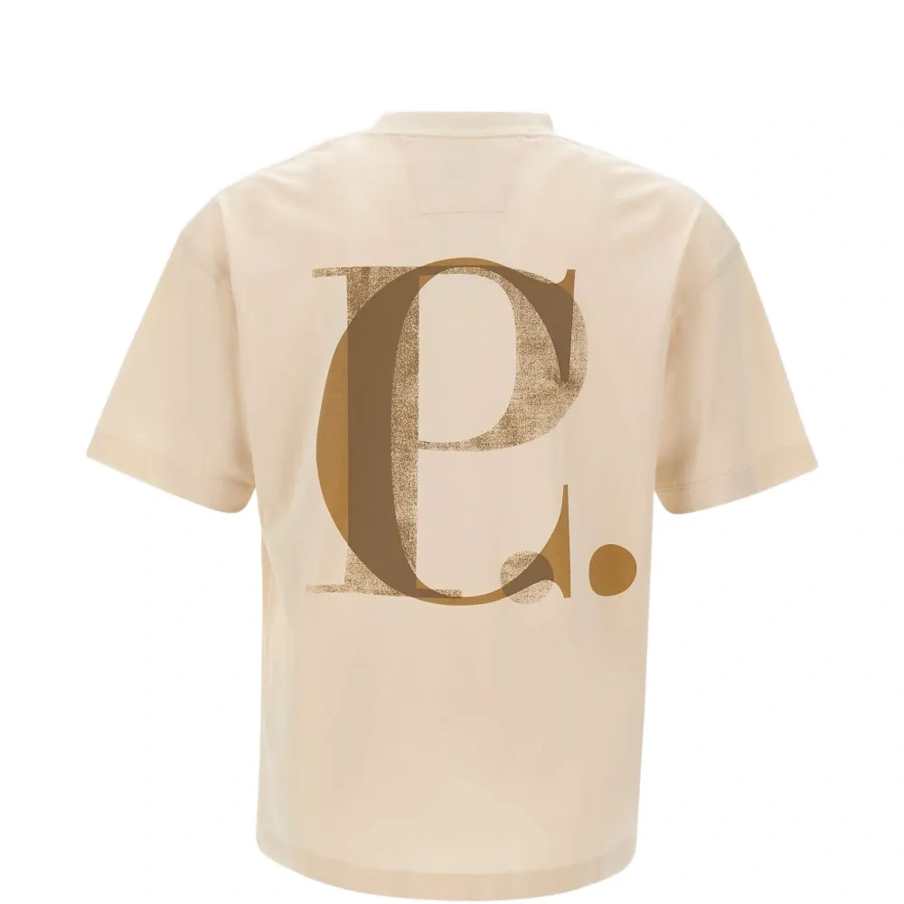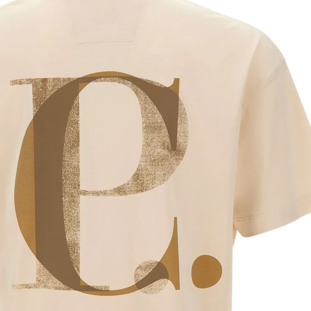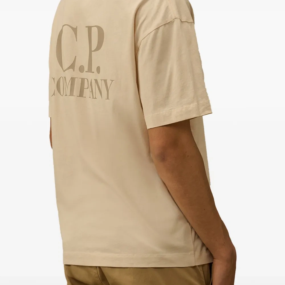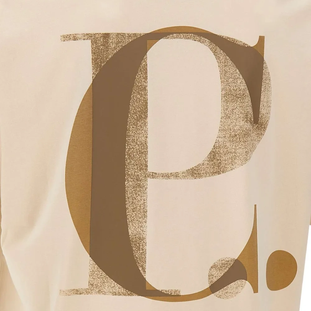песочно-бежевый цвет, принт с логотипом спереди и сзади, круглый вырез, короткие рукава