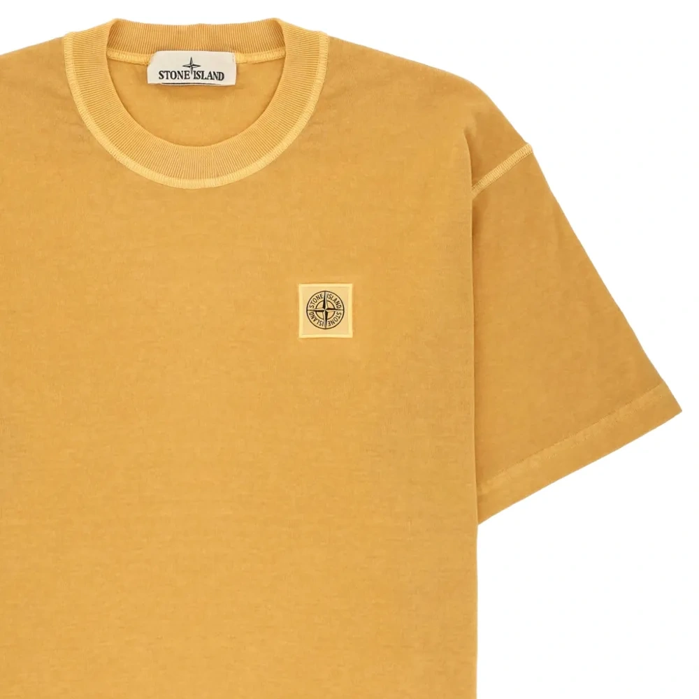 жёлтый свитшот с нашивками, круглый вырез, короткие рукава