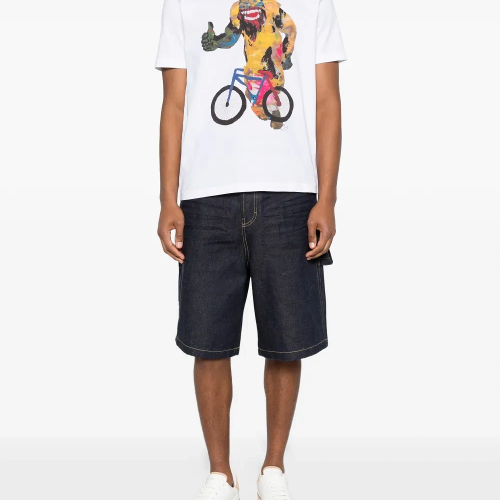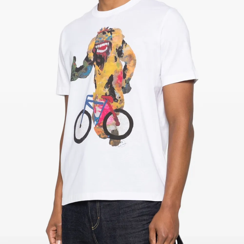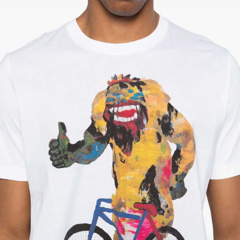 белая футболка с графическим принтом, короткими рукавами и круглым вырезом