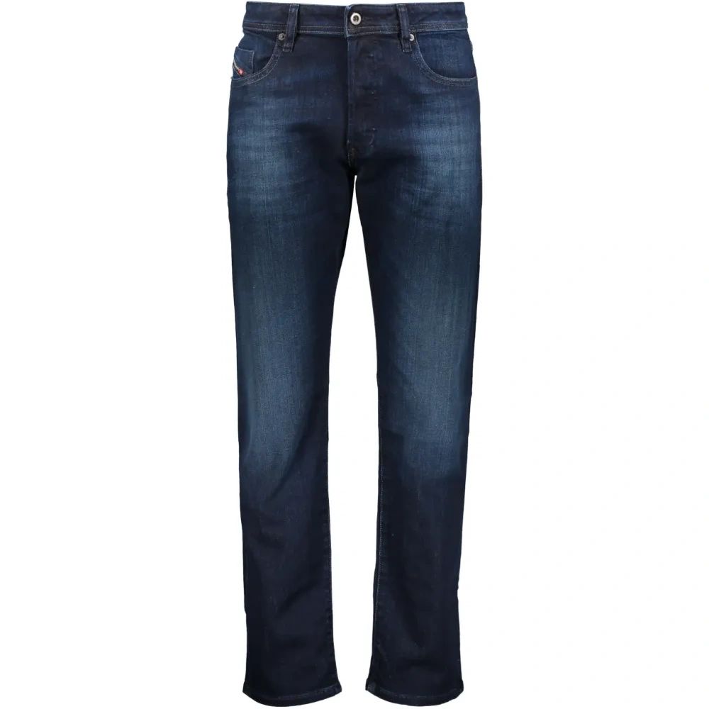 темно-синие прямые брюки с застежкой на пуговицу и молнию, тональная строчка