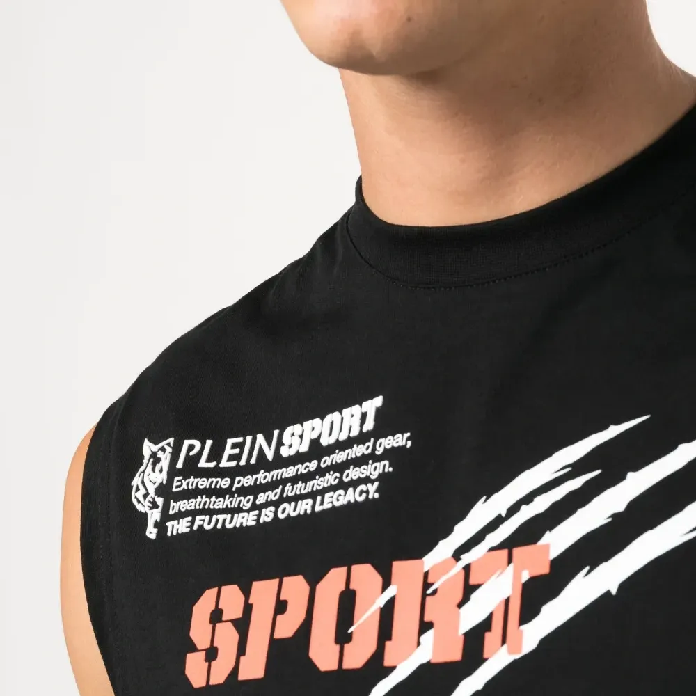 Черный, смесовый хлопок, сплошной принт с логотипом, без рукавов, круглый вырез и прямой подол.