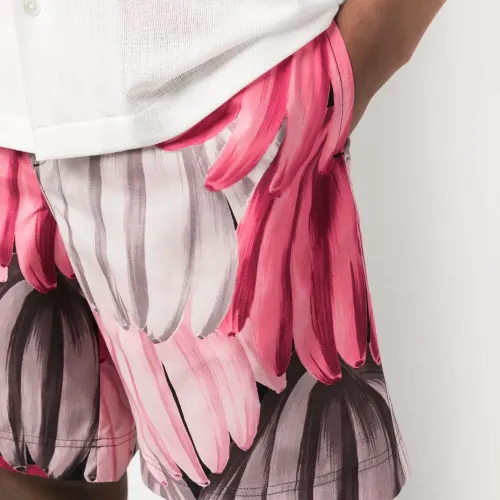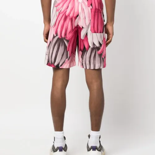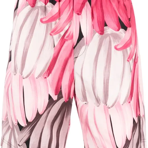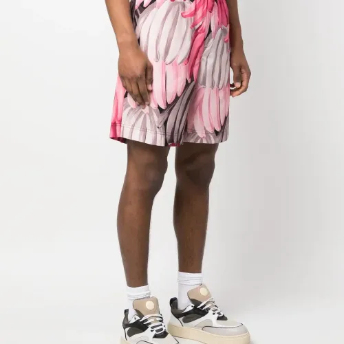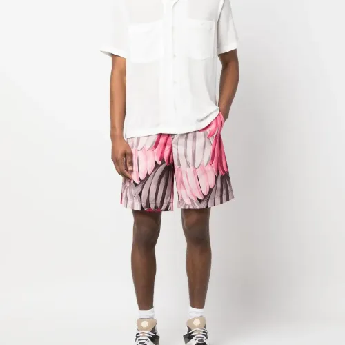 Светло-розовый, разноцветный, принт с изображением фруктов, эластичный пояс, два прорезных кармана по бокам, накладной карман сзади и прямой подол.