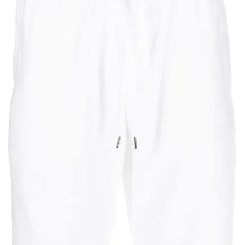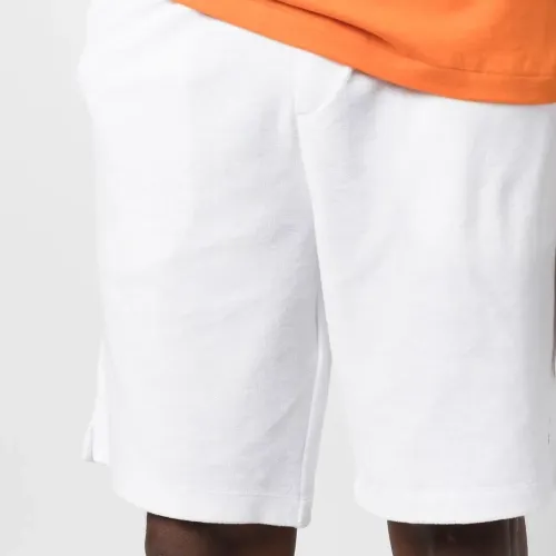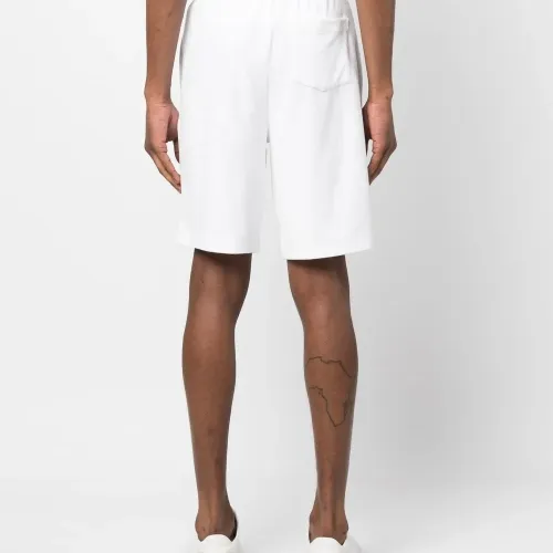 Белый, смесовый хлопок, кулиска на талии, два передних кармана, накладной карман сзади и длина выше колена.