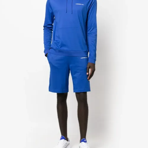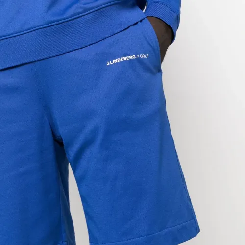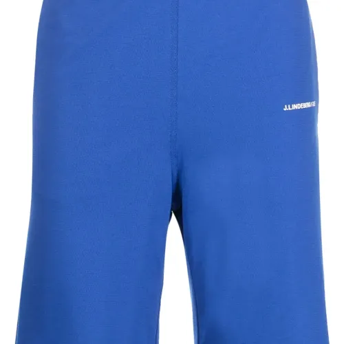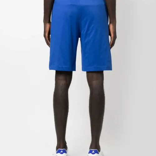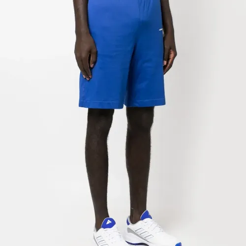 Синий, смесовый хлопок, логотип сбоку, эластичный пояс, два вшитых кармана по бокам и длина выше колена.