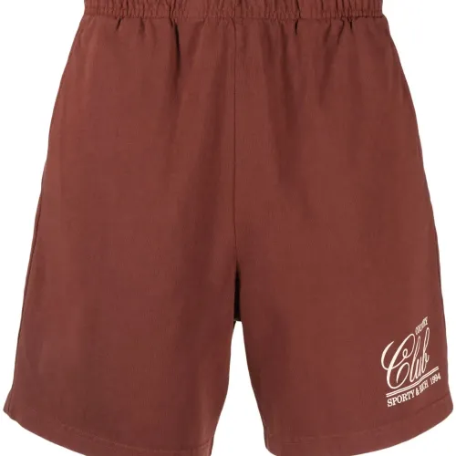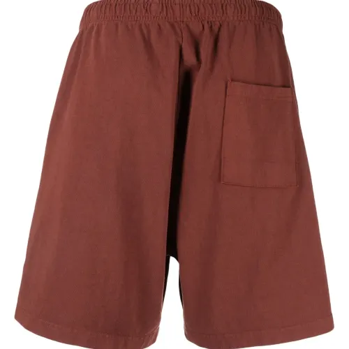 Кофейный, хлопок, логотип спереди, эластичный пояс, длина по колено, два прорезных кармана по бокам и накладной карман сзади.