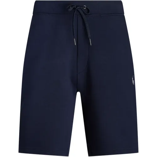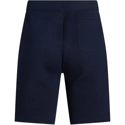синие шорты с завязками на талии, логотипом и задним накладным карманом