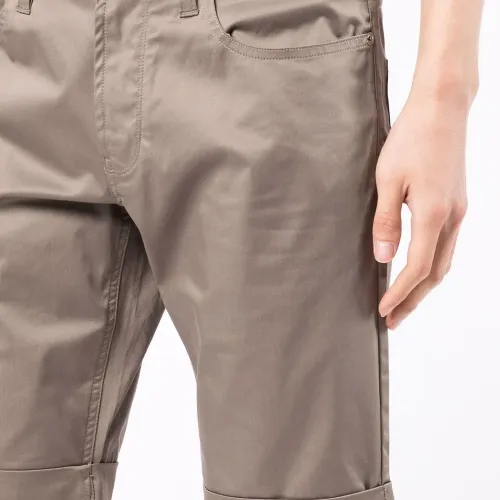 Средняя посадка, петли для ремня, застежка на молнии и пуговице спереди, прямой крой, подвороты и классическая пятикарманная модель.
